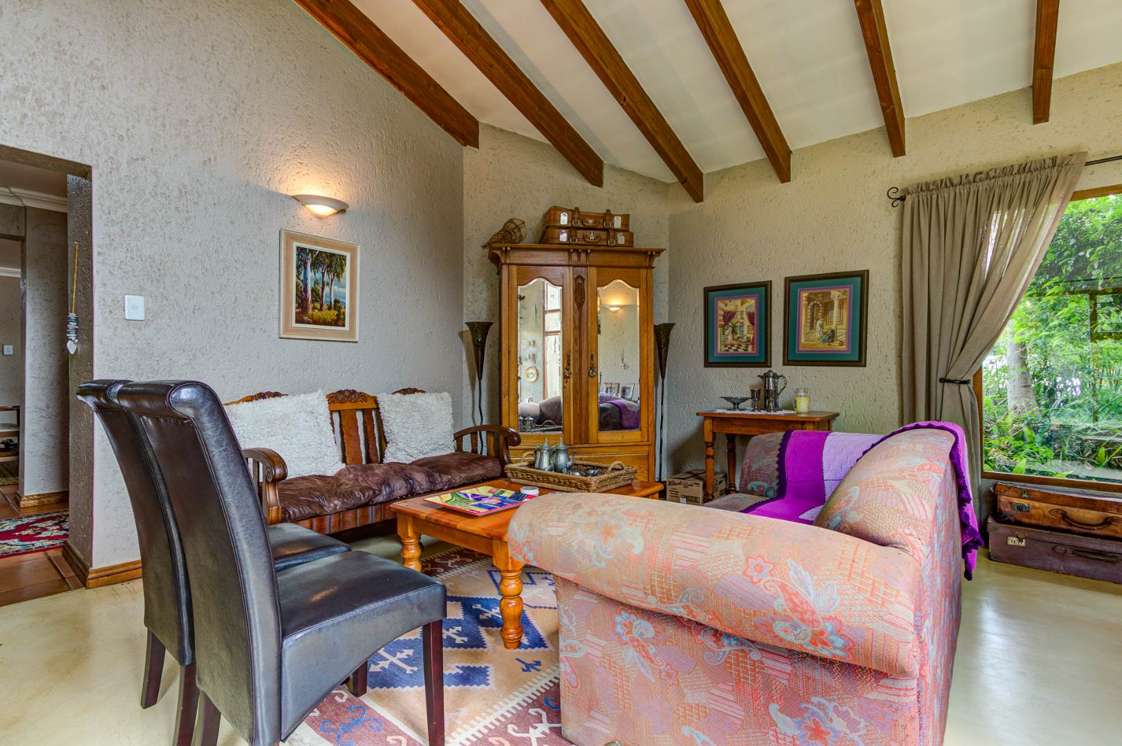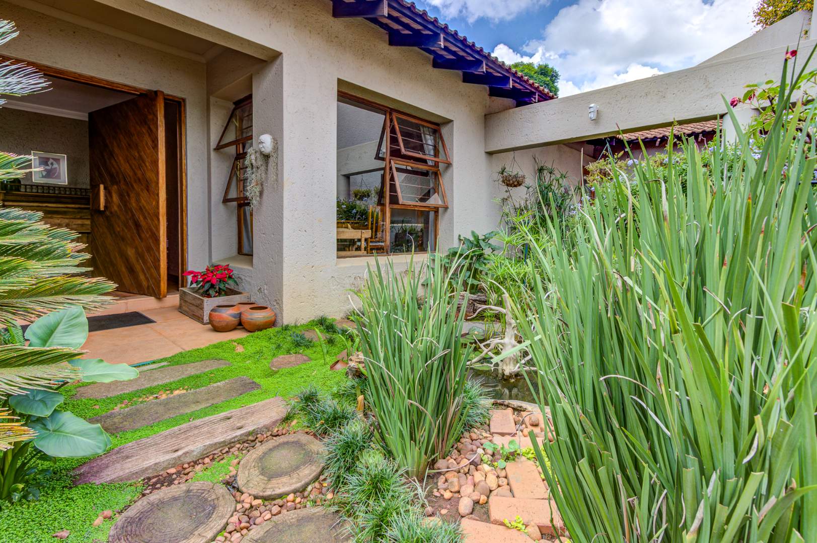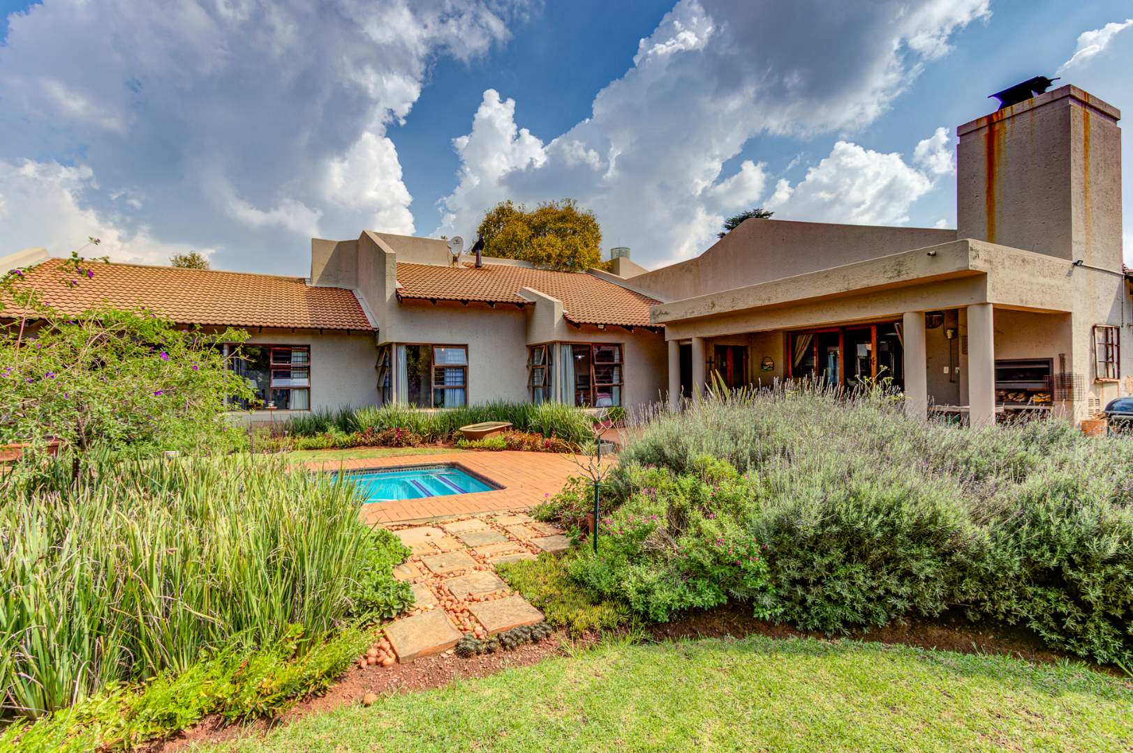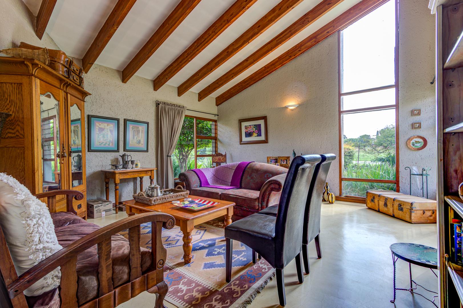 Entertain with sophistication in the three distinct lounge areas. The first captivates with its soaring exposed beams, inviting an abundance of natural light to illuminate the space. The second lounge seamlessly transitions from the gourmet kitchen, extending to a covered patio, ideal for al fresco dining and featuring a built-in braai facility. The architectural design harmoniously integrates with the serene garden, fostering an atmosphere of profound peace and tranquility. A grand, separate dining room further enhances the home's entertainment capabilities.