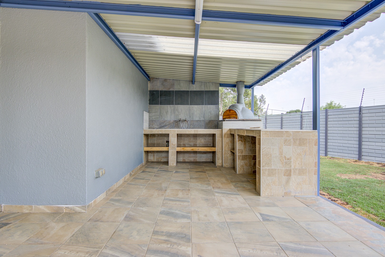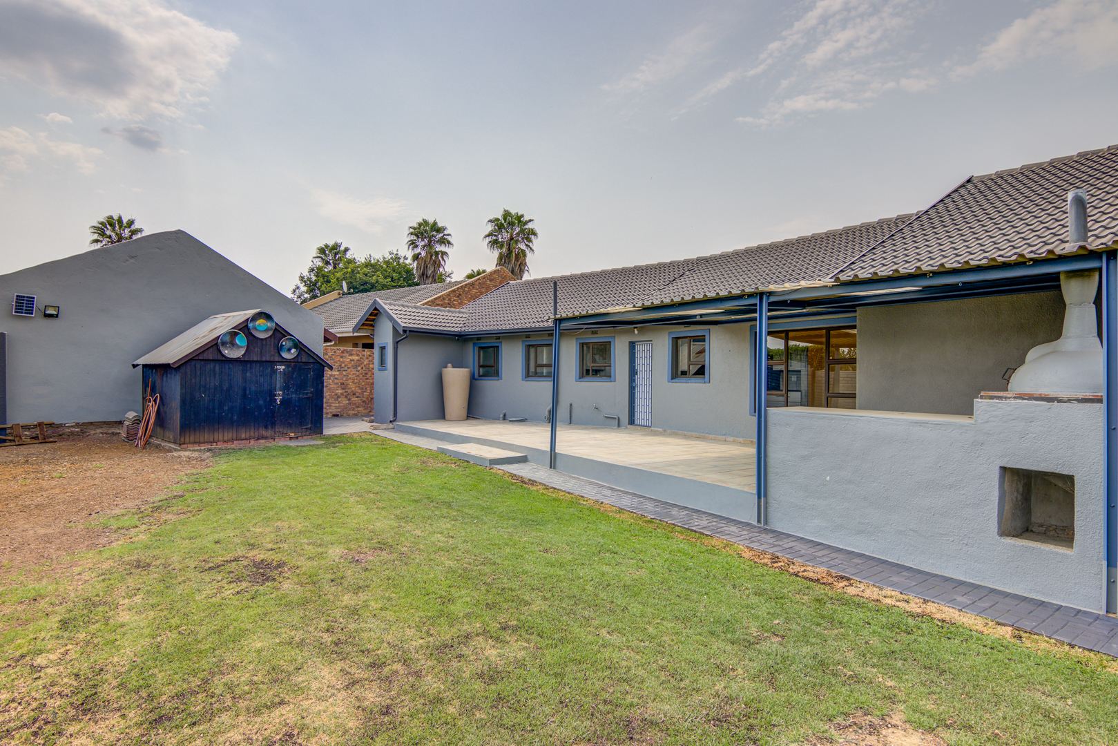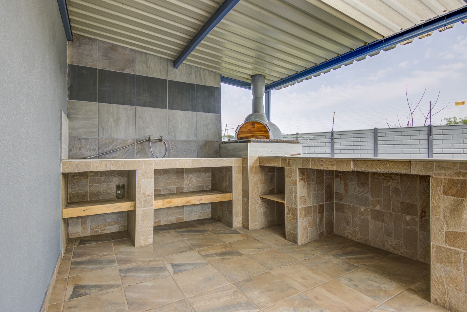 There are cameras and an alarm system too. The lovely patio with a built in pizza oven is for those great summer nights. A Wendy house to store all your gardening goodies and a staff toilet which has been renovated too.