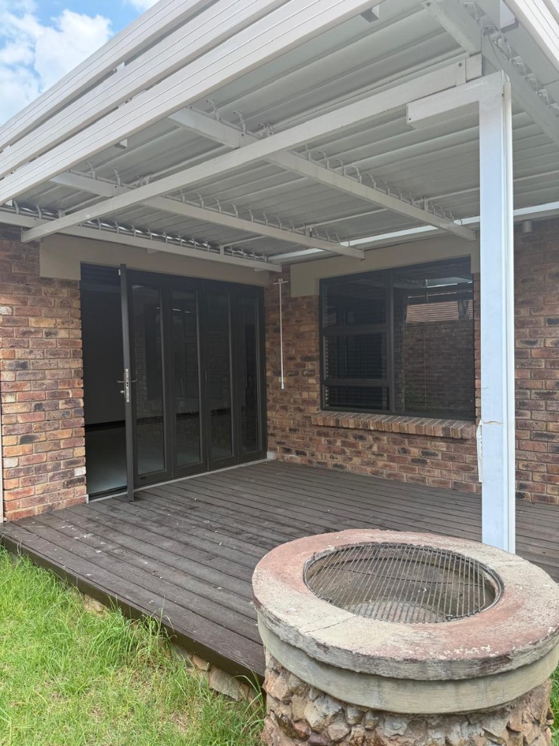Outdoor covered patio for relaxed outdoor living and braai, overlooking a neatly manicured garden.