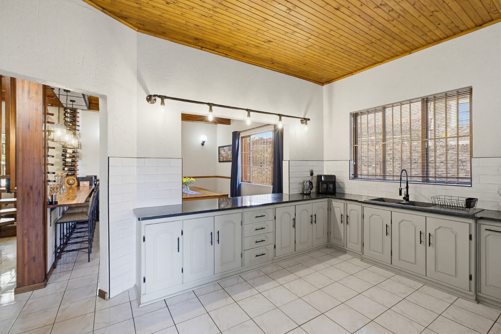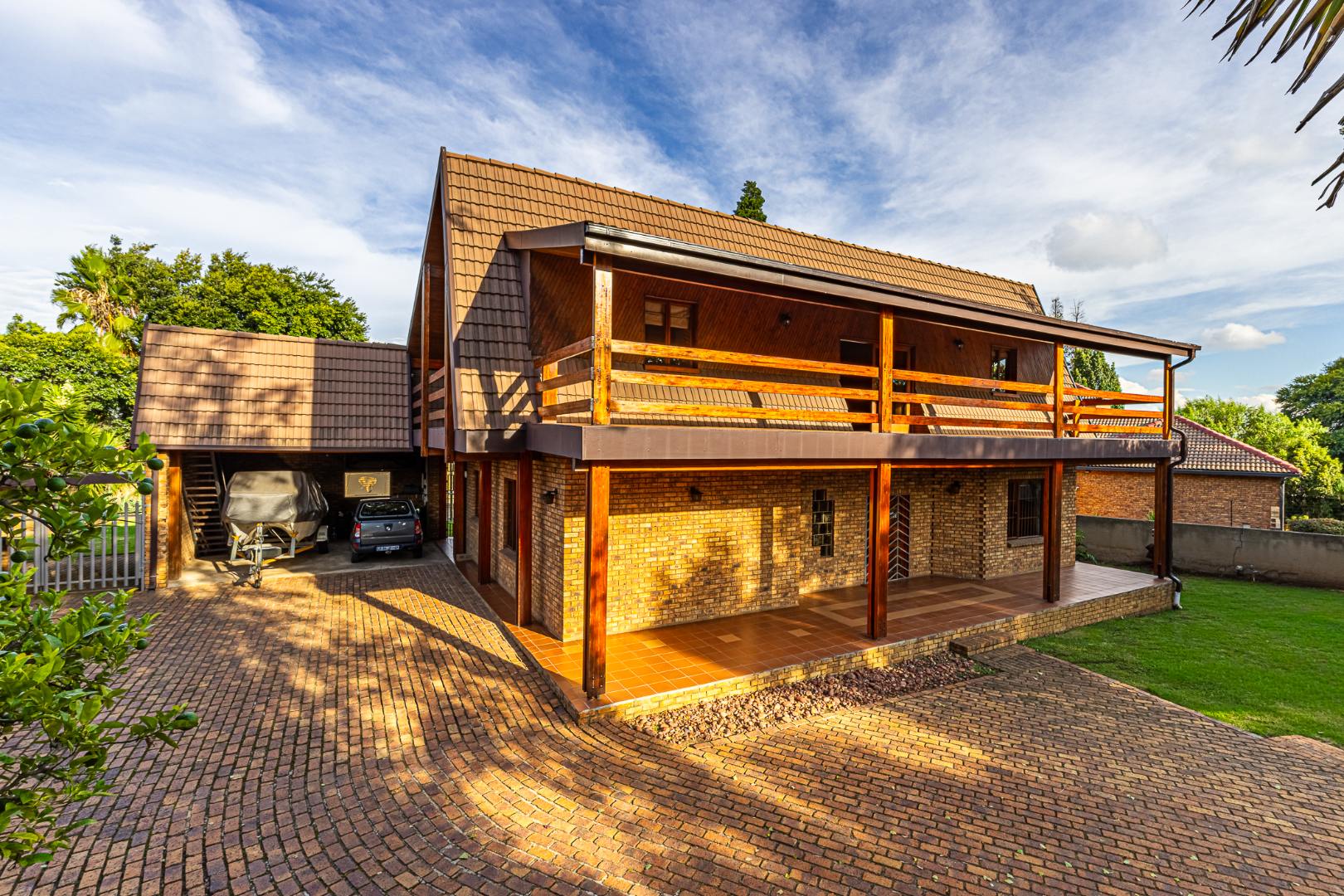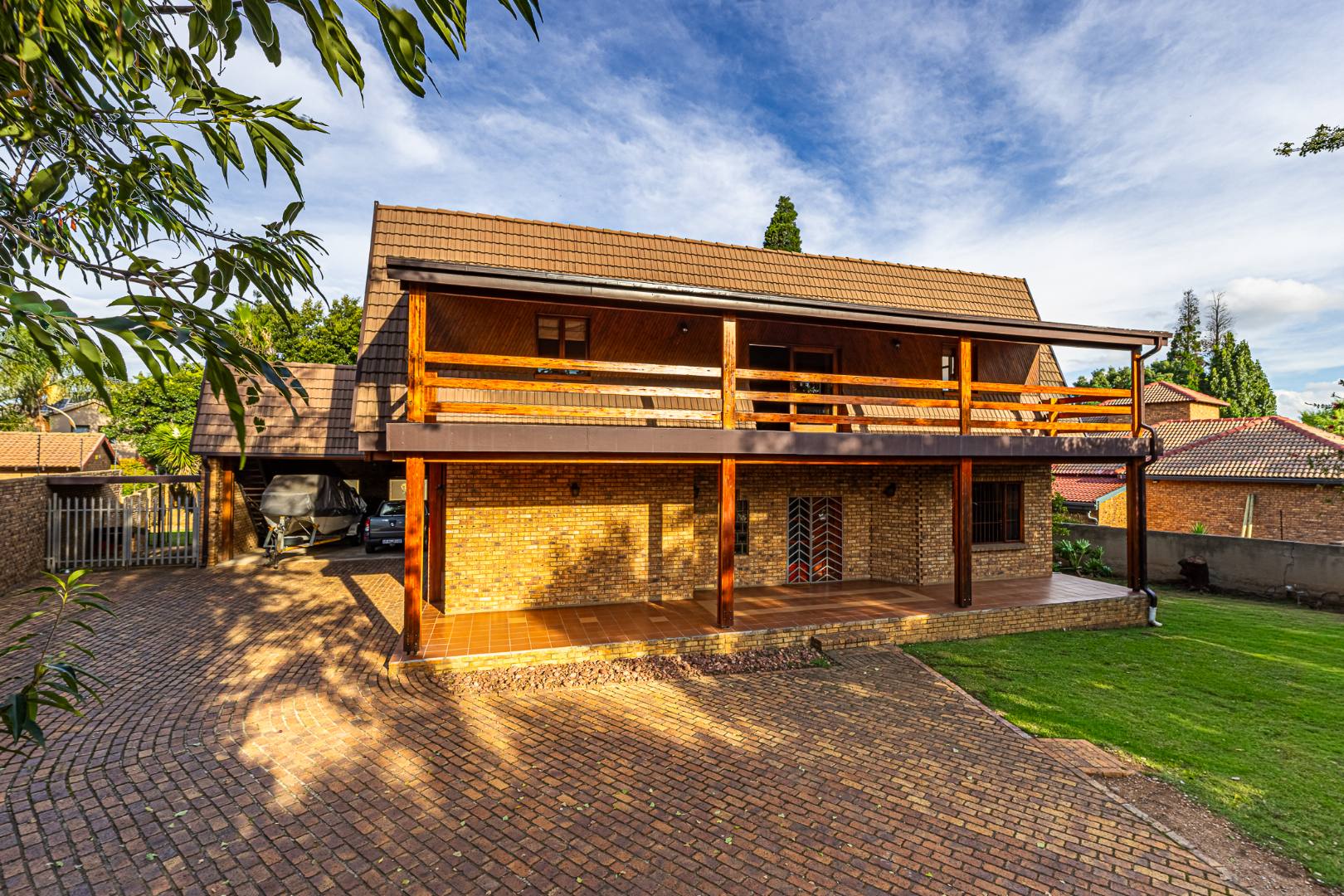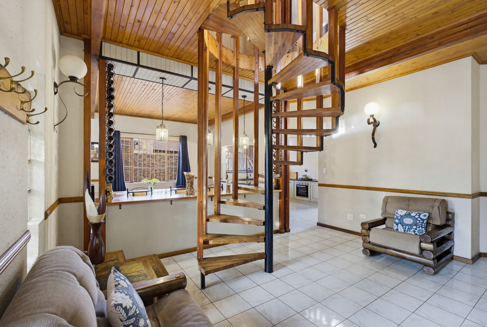 Discover this distinctive 500 sqm residential property in Bartletts, Boksburg, offering a unique A-frame/chalet-style architecture that blends durable brickwork with extensive wooden elements. The exterior boasts multiple covered balconies and ground-floor verandas, providing ample outdoor living space, complemented by a well-maintained garden and mature trees. An extensive paved driveway and covered parking for multiple vehicles enhance both functionality and curb appeal. Step inside to a spacious interior designed for comfortable living. The open-plan layout seamlessly connects two lounges, a dining room, and a family/TV room. A striking spiral wooden staircase serves as a central architectural feature, leading to the upper levels. Warm wooden ceilings and exposed beams create a cozy, rustic aesthetic throughout, while practical tiled flooring ensures easy maintenance. The home also includes a built-in bar, perfect for entertaining guests. This residence offers four well-proportioned bedrooms and three bathrooms, including one en-suite, providing ample accommodation for a family. The bedrooms are bright, with natural light, and feature neutral decor, allowing for personalization. A dedicated study provides a quiet space for work or hobbies, catering to modern lifestyle needs. The generous 1354 sqm erf size provides a private outdoor oasis. Enjoy the inviting swimming pool, perfect for relaxation and recreation. The property boasts a built-in braai and a dedicated braai room, ideal for outdoor entertaining. The well-kept garden and mature landscaping offer a serene environment, and pets are welcome. Located within a security complex with an access gate, this home offers enhanced peace of mind. Modern connectivity is ensured with fibre internet availability. Bartletts, Boksburg, is a well-established suburb in South Africa, known for its residential appeal and convenient access to local amenities. This area offers a balanced lifestyle, combining suburban tranquility with proximity to urban conveniences. Key Features: * 4 Bedrooms, 3 Bathrooms (1 en-suite) * Distinctive A-frame/chalet architecture * 2 Lounges, Dining Room, Family/TV Room * Open-plan living with built-in bar * Spiral wooden staircase and wood ceilings * Swimming pool and established garden * Built-in braai and braai room * Double garage and 4 parking spaces * Fibre internet ready * Located in a security complex