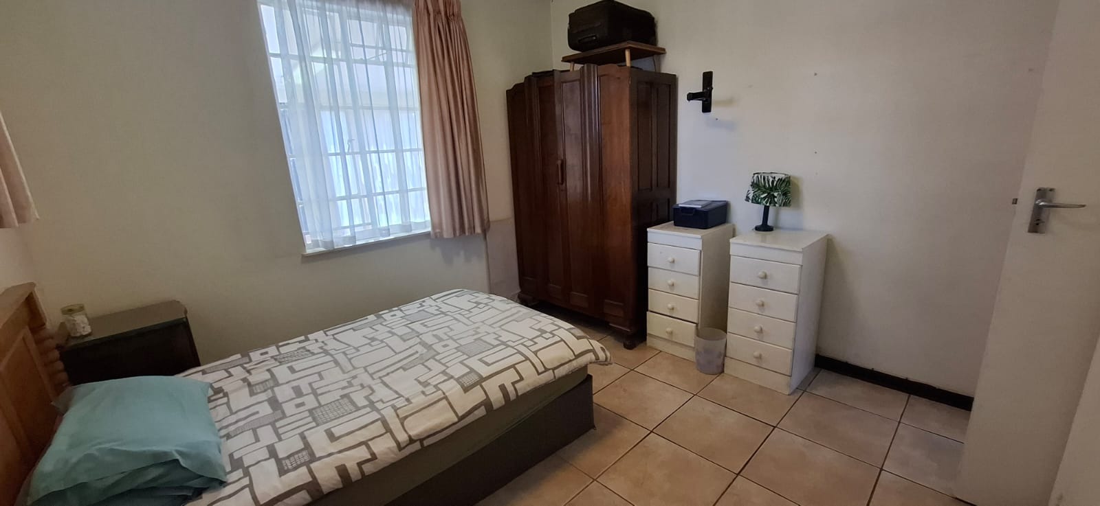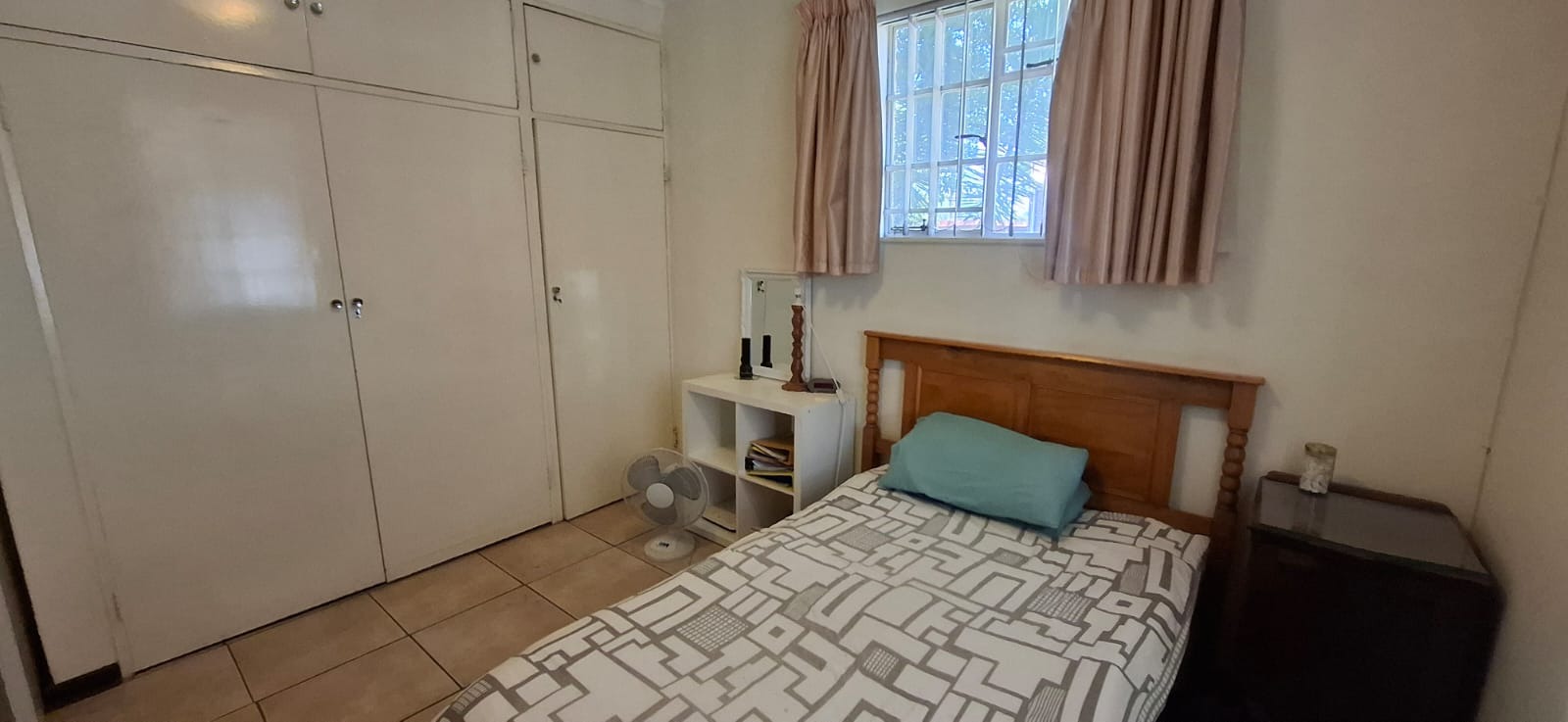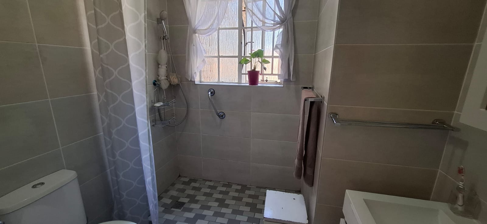 The comfortable bedroom includes a built-in wardrobe and additional storage. Large windows ensure natural light, contributing to a serene environment. The functional bathroom features a walk-in shower with tiled walls and a grab bar, designed for safety and convenience, reflecting the property's wheelchair-friendly attributes. Residents benefit from 24-hour security, an access gate, security gates on the unit, and burglar bars for peace of mind within the secure retirement village.