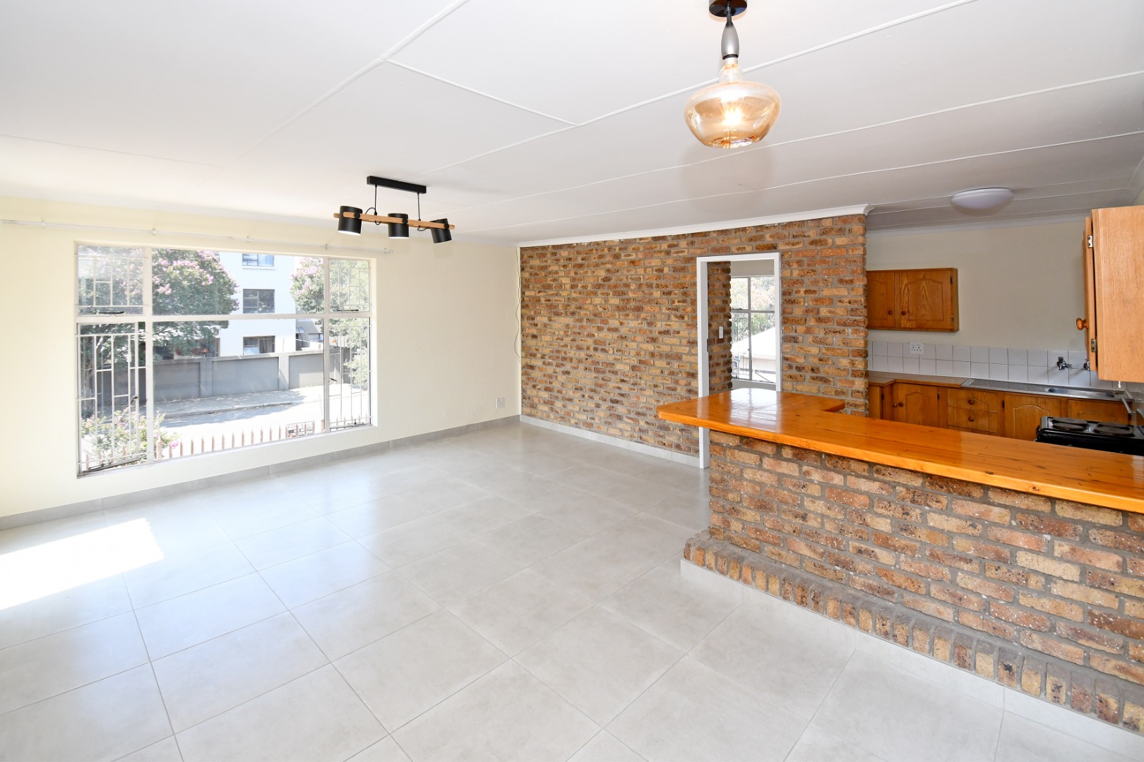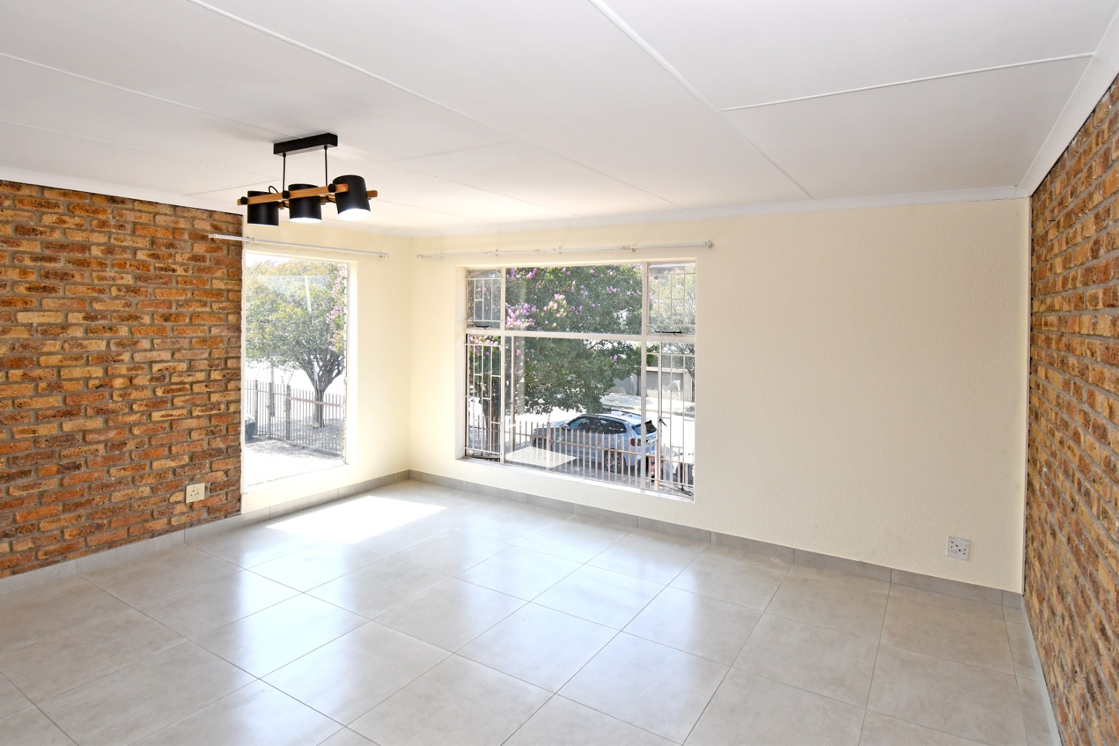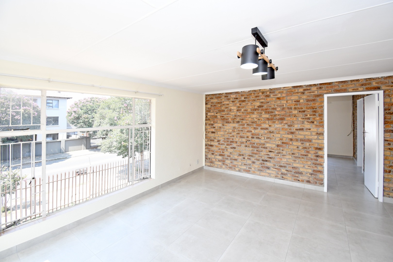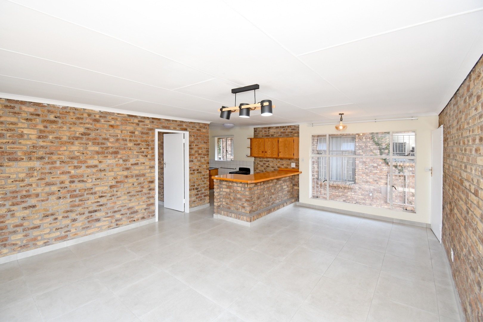 Discover this inviting 81 sqm unit located in a well-situated complex in Boksburg next to St Dominic's school. Designed for modern living, this property features an open-plan layout that connects the living, dining, and kitchen areas. The interior boasts contemporary light grey tiled flooring throughout, complemented by neutral painted walls and distinctive exposed brick accent walls that add character and warmth. Large windows, fitted with security bars for peace of mind, allow abundant natural light to illuminate the space.