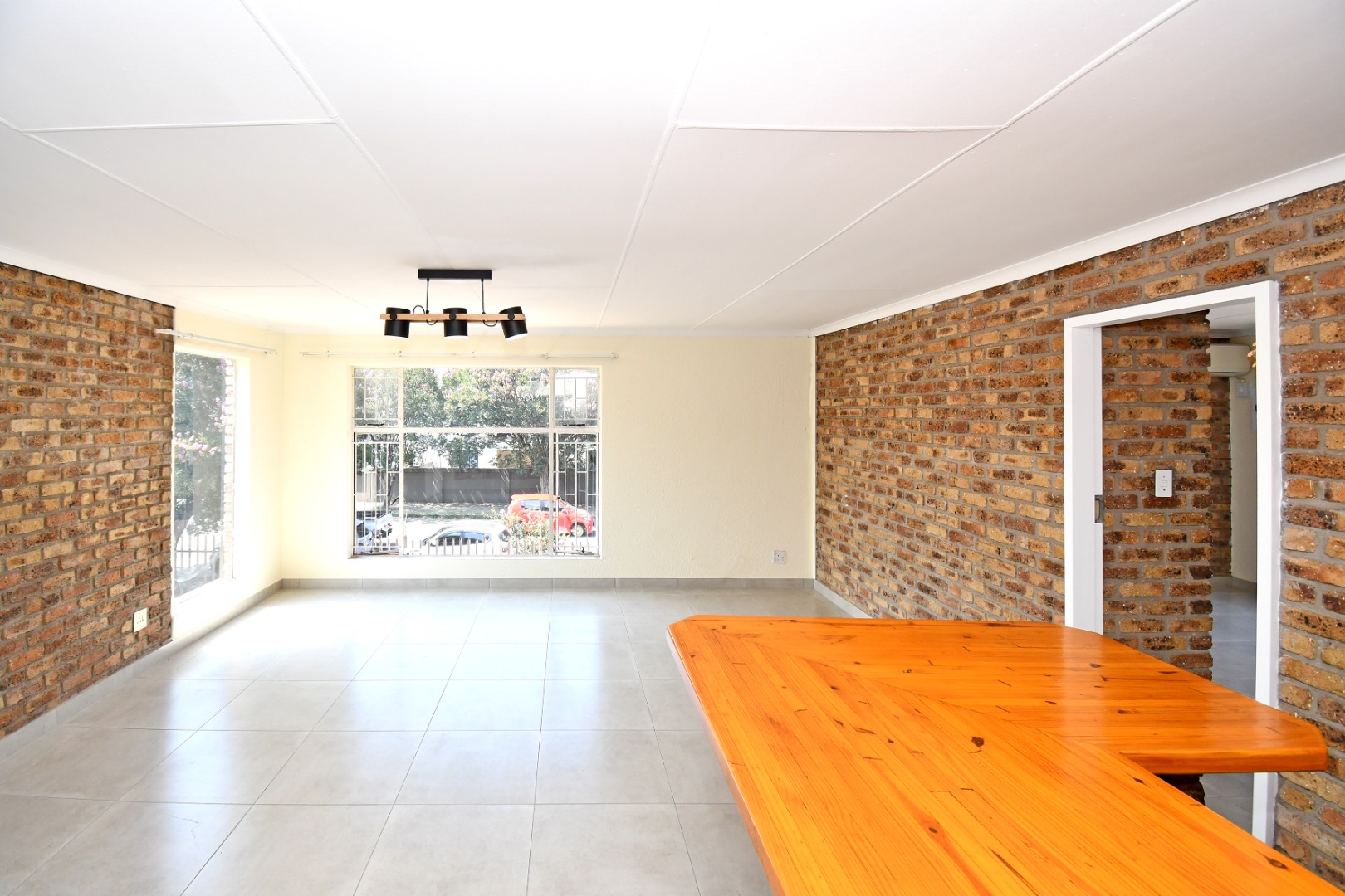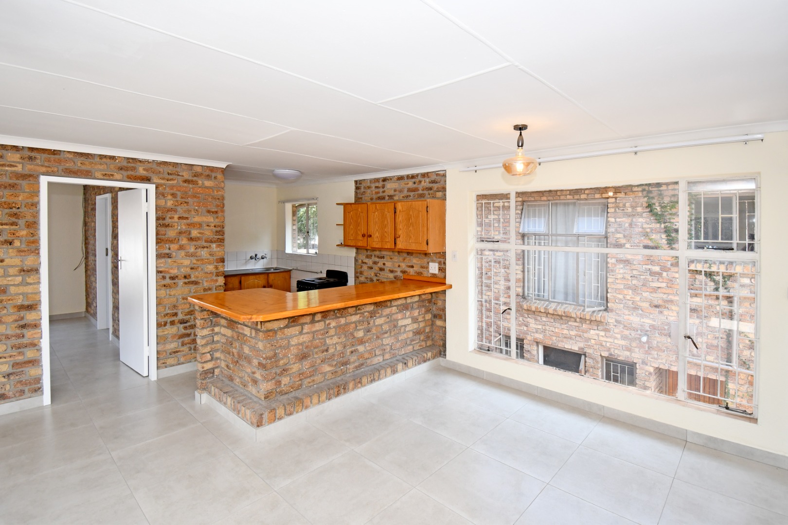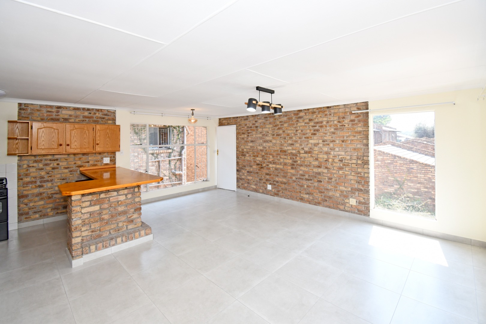Discover this inviting 81 sqm unit located in a well-situated complex in Boksburg next to St Dominic's school. Designed for modern living, this property features an open-plan layout that connects the living, dining, and kitchen areas. The interior boasts contemporary light grey tiled flooring throughout, complemented by neutral painted walls and distinctive exposed brick accent walls that add character and warmth. Large windows, fitted with security bars for peace of mind, allow abundant natural light to illuminate the space.