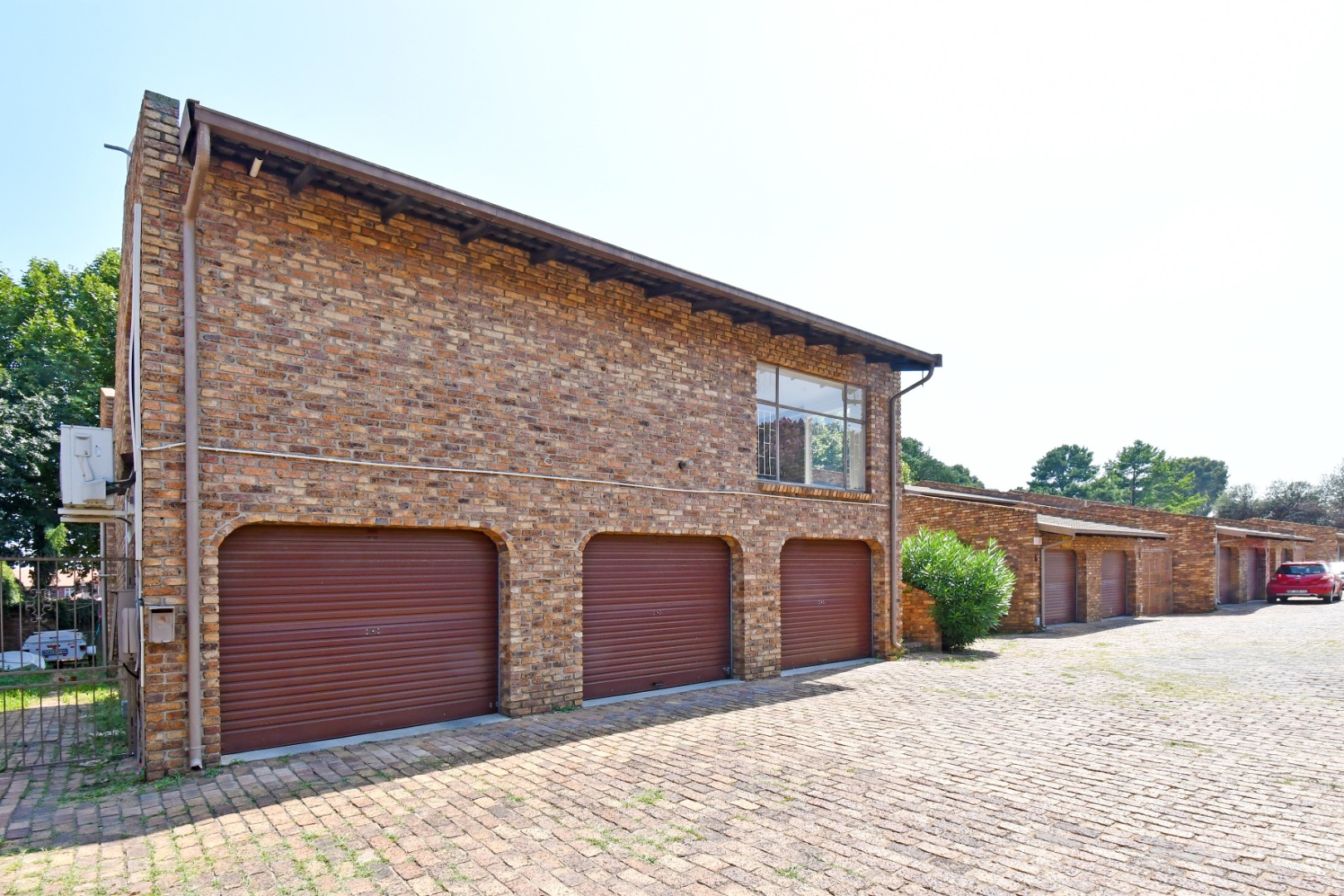Externally, the brick construction offers a durable and classic aesthetic. The property includes a single garage and a paved front area, providing practical parking solutions within the complex. Security is enhanced by an access gate, security gate, and burglar bars on the windows, contributing to a secure living environment.