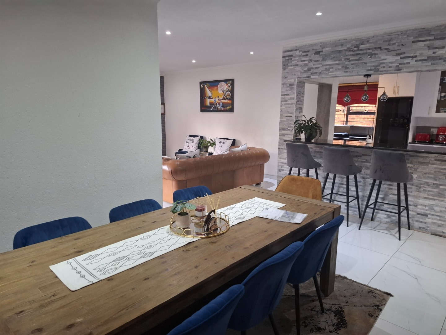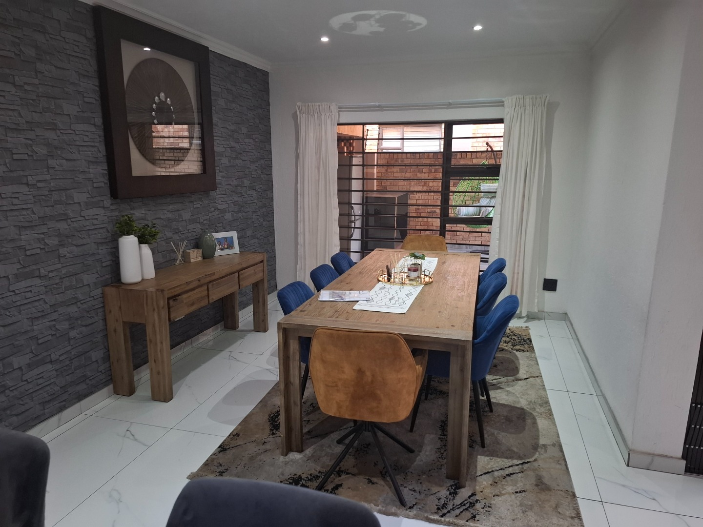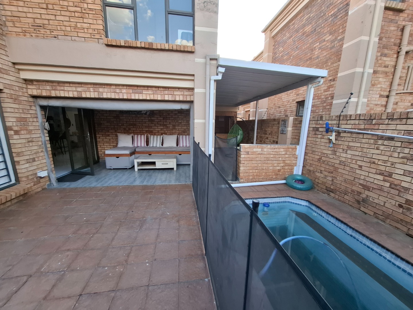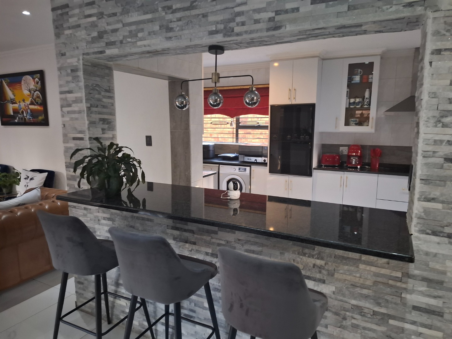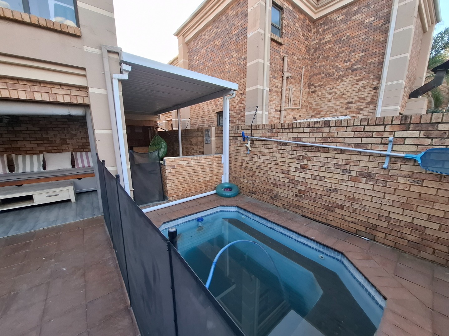 Discover this modern brick and plaster townhouse, ideally situated within a desirable complex in Boksburg West. The property presents excellent kerb appeal with a well-maintained exterior, a paved driveway, a double garage, and an additional shade net carport. A secure gated entrance leads to a solid wooden front door, opening into an inviting entryway with modern white floor tiles and subtle exposed brick accents. The interior boasts a contemporary open-plan layout, seamlessly connecting the living, dining, and kitchen areas. The spacious living room features luxurious leather sofas, a striking grey stone-effect accent wall with a mounted TV, and ample natural light from windows fitted with security bars. Recessed ceiling lights enhance the bright, tiled flooring throughout. The modern dining area, complete with stylish furniture, offers direct access to a private outdoor patio and a refreshing swimming pool, perfect for entertaining. The heart of this home is its sleek, open-plan kitchen, equipped with white cabinetry, black granite countertops, an integrated oven, and a stylish breakfast bar with stone cladding. This functional space ensures convenience for daily living. The townhouse provides three comfortable bedrooms and 2.5 well-appointed bathrooms, designed for modern comfort. Enhanced security, including the gated entrance and burglar bars, offers peace of mind in this convenient location. Key Features: * 3 Bedrooms, 2.5 Bathrooms * Modern Open-Plan Living & Kitchen * Double Garage & Carport * Private Swimming Pool & Patio * Secure Gated Entrance & Burglar Bars * 310 sqm Floor Size