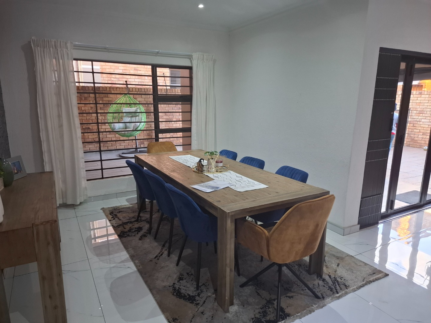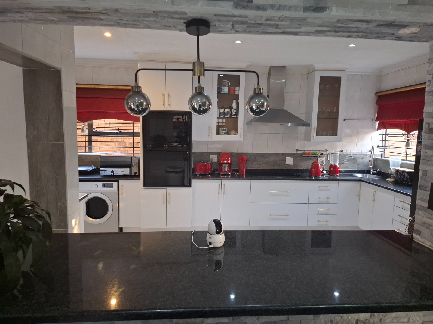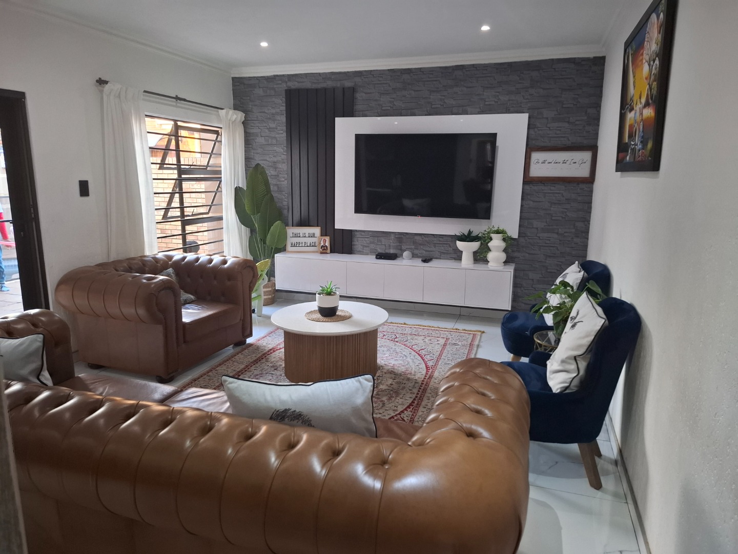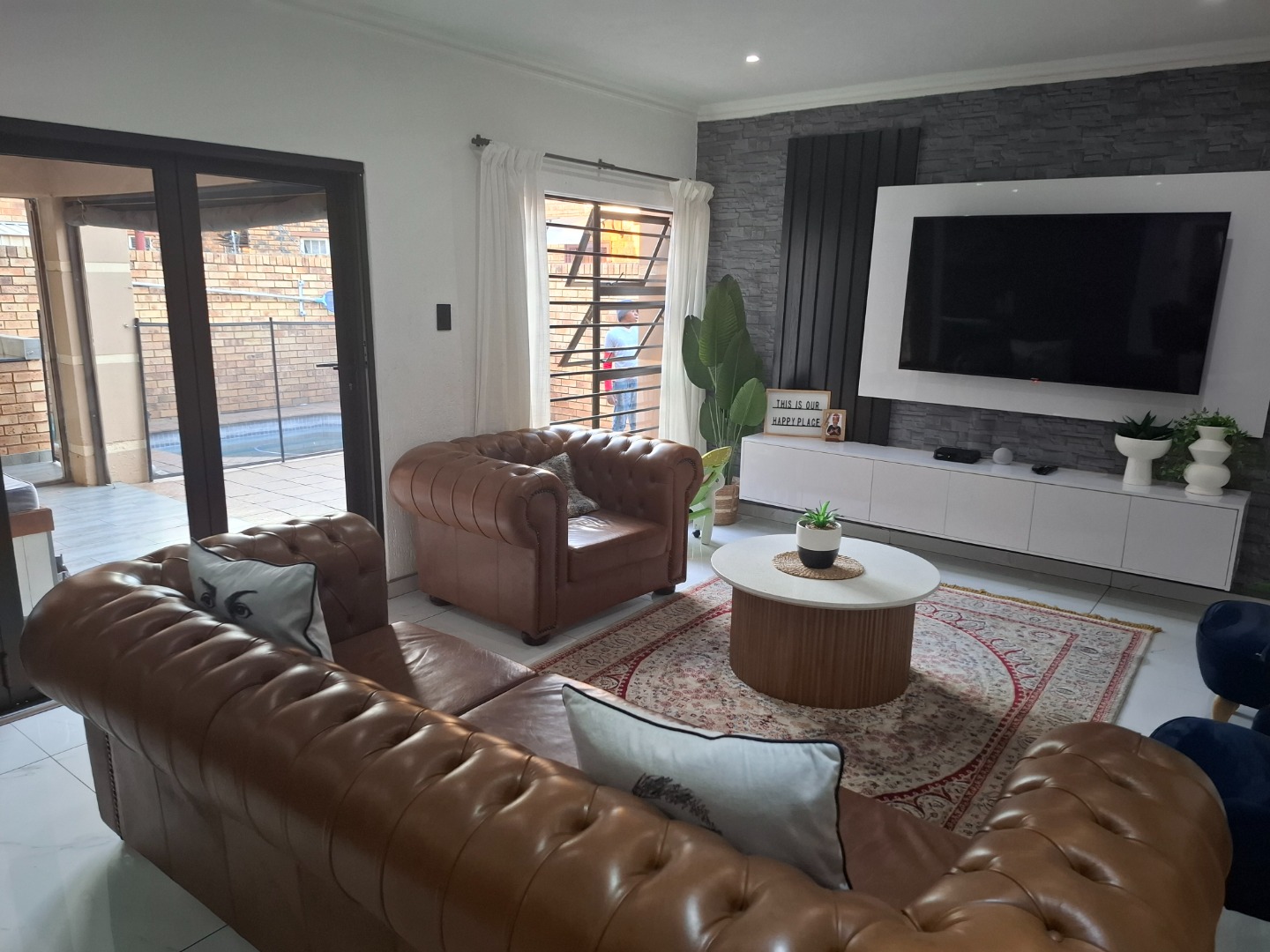 Discover this modern brick and plaster townhouse, ideally situated within a desirable complex in Boksburg West. The property presents excellent kerb appeal with a well-maintained exterior, a paved driveway, a double garage, and an additional shade net carport. A secure gated entrance leads to a solid wooden front door, opening into an inviting entryway with modern white floor tiles and subtle exposed brick accents. The interior boasts a contemporary open-plan layout, seamlessly connecting the living, dining, and kitchen areas. The spacious living room features luxurious leather sofas, a striking grey stone-effect accent wall with a mounted TV, and ample natural light from windows fitted with security bars. Recessed ceiling lights enhance the bright, tiled flooring throughout. The modern dining area, complete with stylish furniture, offers direct access to a private outdoor patio and a refreshing swimming pool, perfect for entertaining. The heart of this home is its sleek, open-plan kitchen, equipped with white cabinetry, black granite countertops, an integrated oven, and a stylish breakfast bar with stone cladding. This functional space ensures convenience for daily living. The townhouse provides three comfortable bedrooms and 2.5 well-appointed bathrooms, designed for modern comfort. Enhanced security, including the gated entrance and burglar bars, offers peace of mind in this convenient location. Key Features: * 3 Bedrooms, 2.5 Bathrooms * Modern Open-Plan Living & Kitchen * Double Garage & Carport * Private Swimming Pool & Patio * Secure Gated Entrance & Burglar Bars * 310 sqm Floor Size
