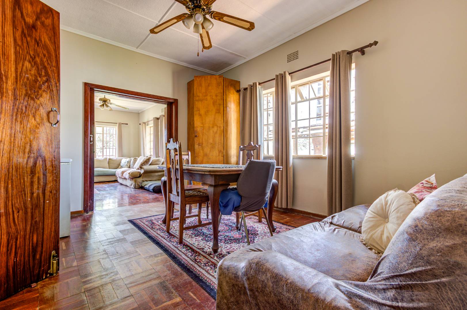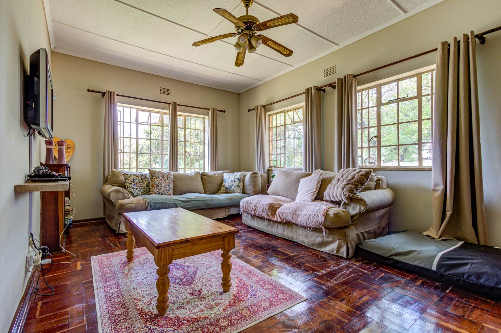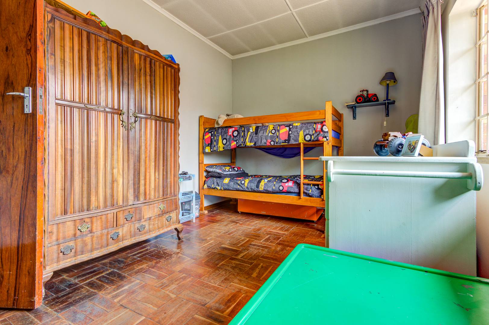 This charming 3-bedroom, 1-bathroom family home is situated on a generous 1012 sqm erf in the established suburb of Cinderella, Boksburg. The property immediately impresses with its kerb appeal, featuring a durable brick exterior, a large paved driveway leading to a double garage, and a spacious, well-maintained garden adorned with mature shade trees. Outdoor living is enhanced by a covered patio with a built-in brick braai, perfect for entertaining, and a dedicated play area complete with a treehouse, offering ample space for children to explore.
