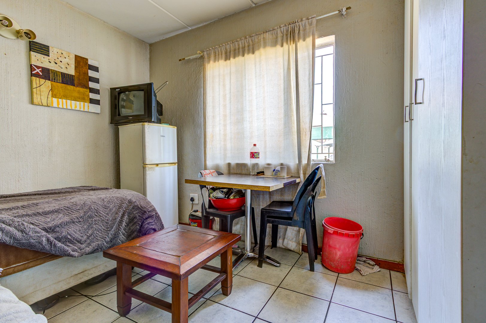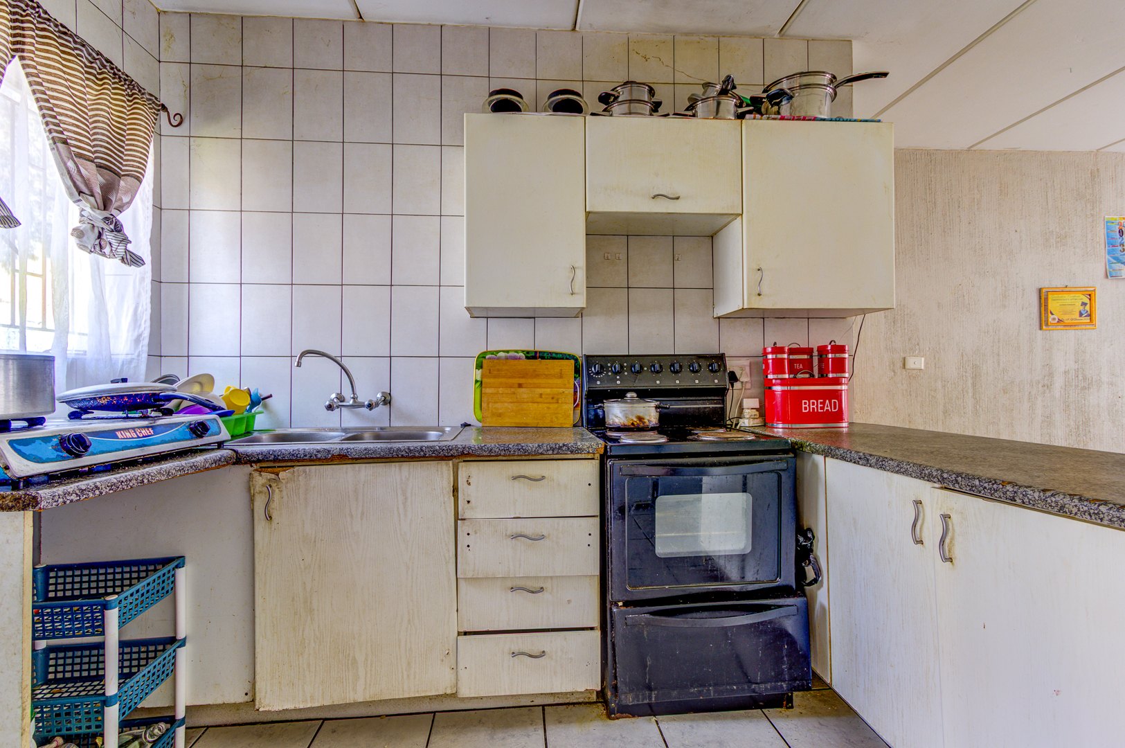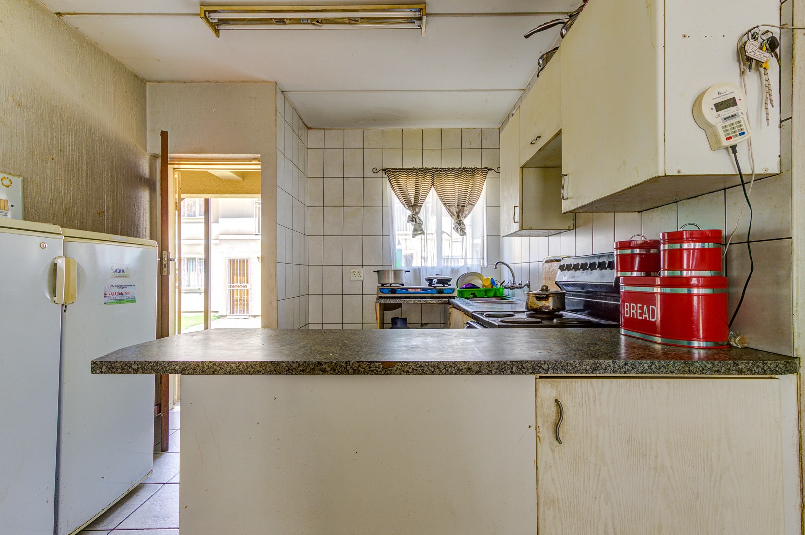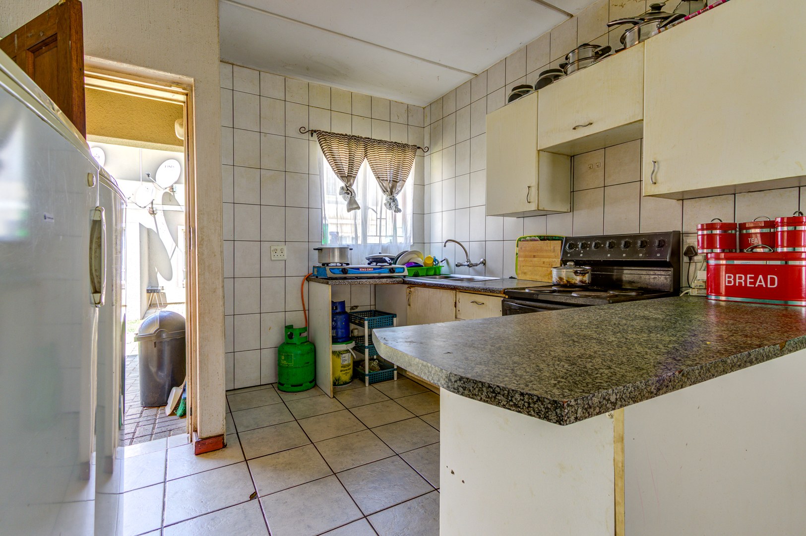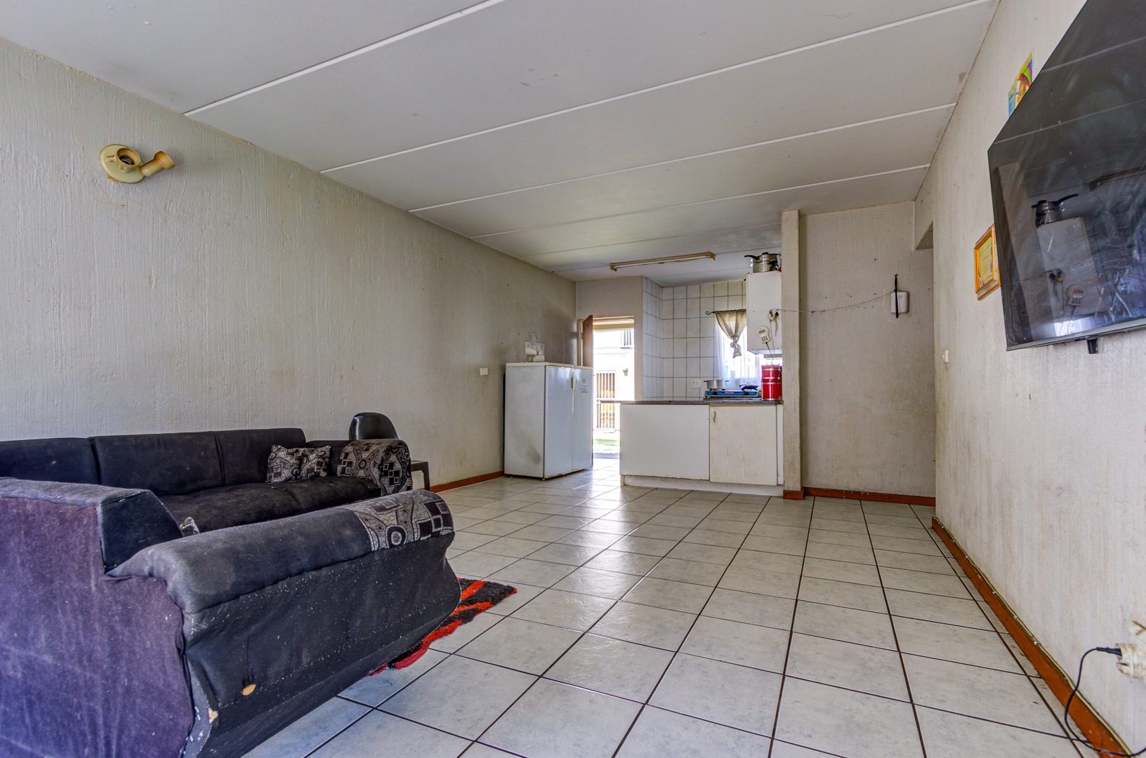 Step inside to a welcoming open plan living and dining area, featuring durable tiled flooring throughout, super easy to keep clean! The kitchen is functional and ready for action, equipped with stove, ample counter space, and even room for two fridges. While it shows some signs of wear, it’s a great foundation for a modern upgrade. You’ll find two comfortable bedrooms, both with tiled floors, and one even includes convenient built in cupboards to help keep things tidy. The bathroom is fully tiled and offers both a relaxing bathtub and a separate shower, giving you the best of both worlds.