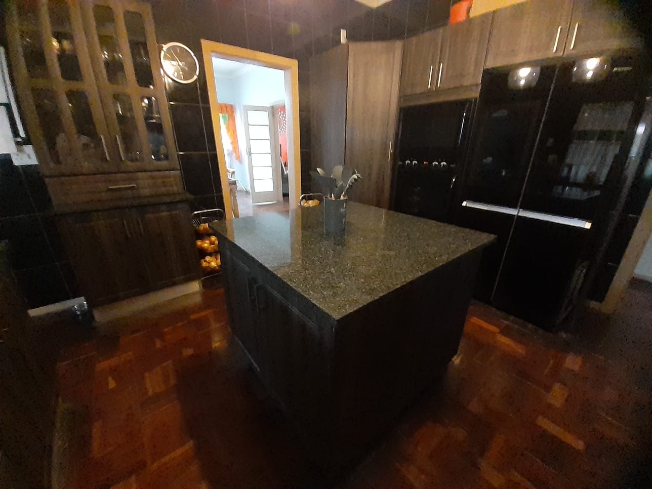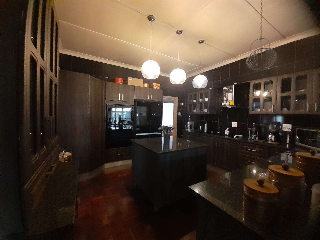 Inside, the residence features a spacious lounge and a dedicated dining room, both benefiting from durable parquet flooring. The kitchen boasts a sleek, modern dark aesthetic with black tiled walls, matching cabinetry, and ample storage. It is well-equipped with an integrated cooktop, built-in oven, complemented by stylish pendant lighting and convenient wine glass racks.