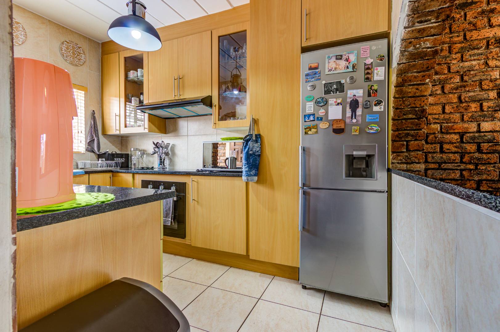 Step inside to an inviting open-plan living area, characterized by an exposed brick accent wall and tiled flooring throughout. The space flows seamlessly into the modern kitchen, which is a highlight with its unique exposed brick archways. It features ample light wooden cabinetry, sleek dark granite countertops, a tiled backsplash, and a built-in oven and range hood. A window provides natural light, and there's convenient space for a washing machine.