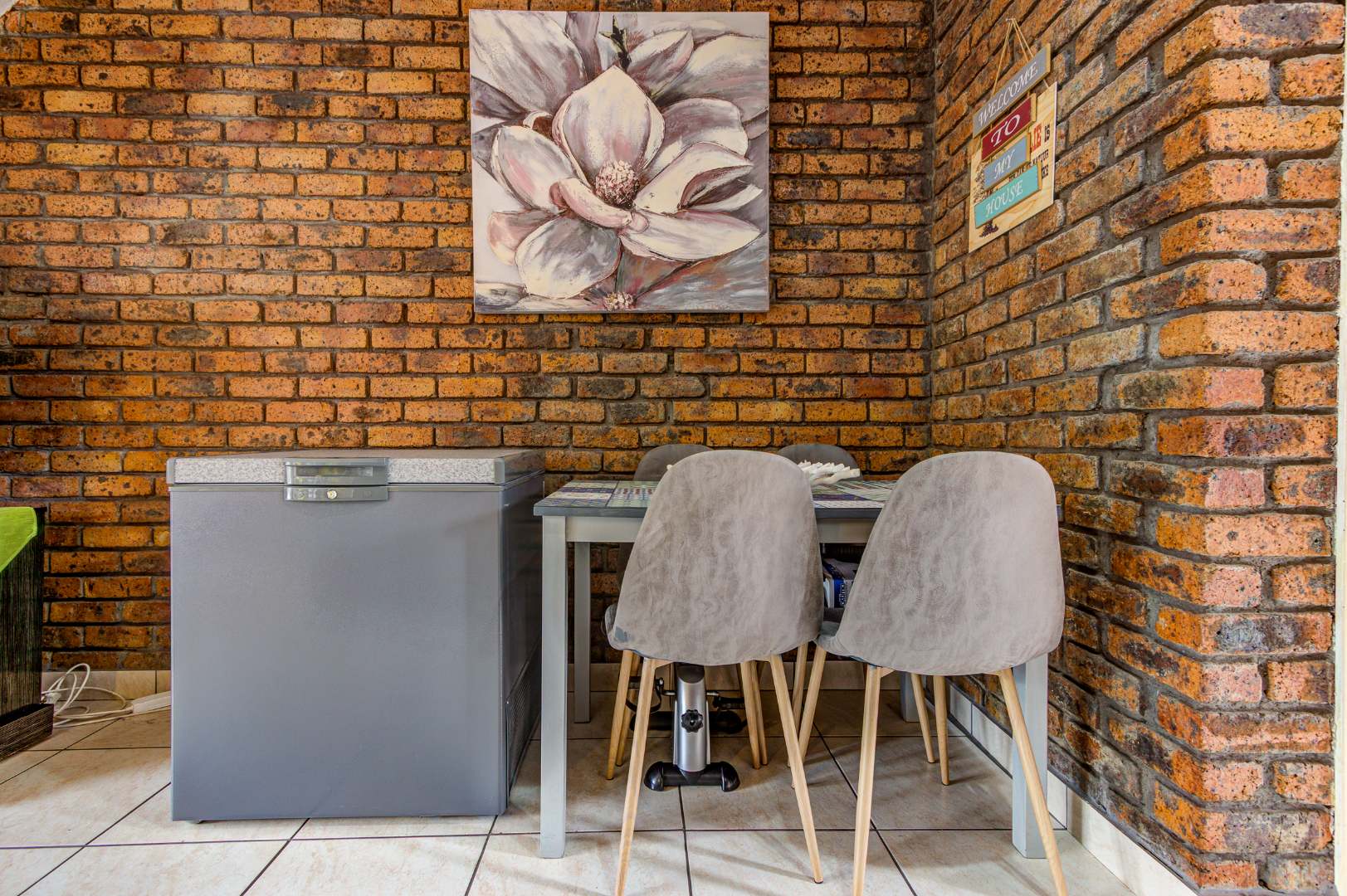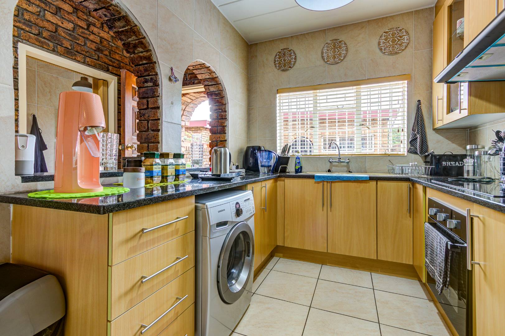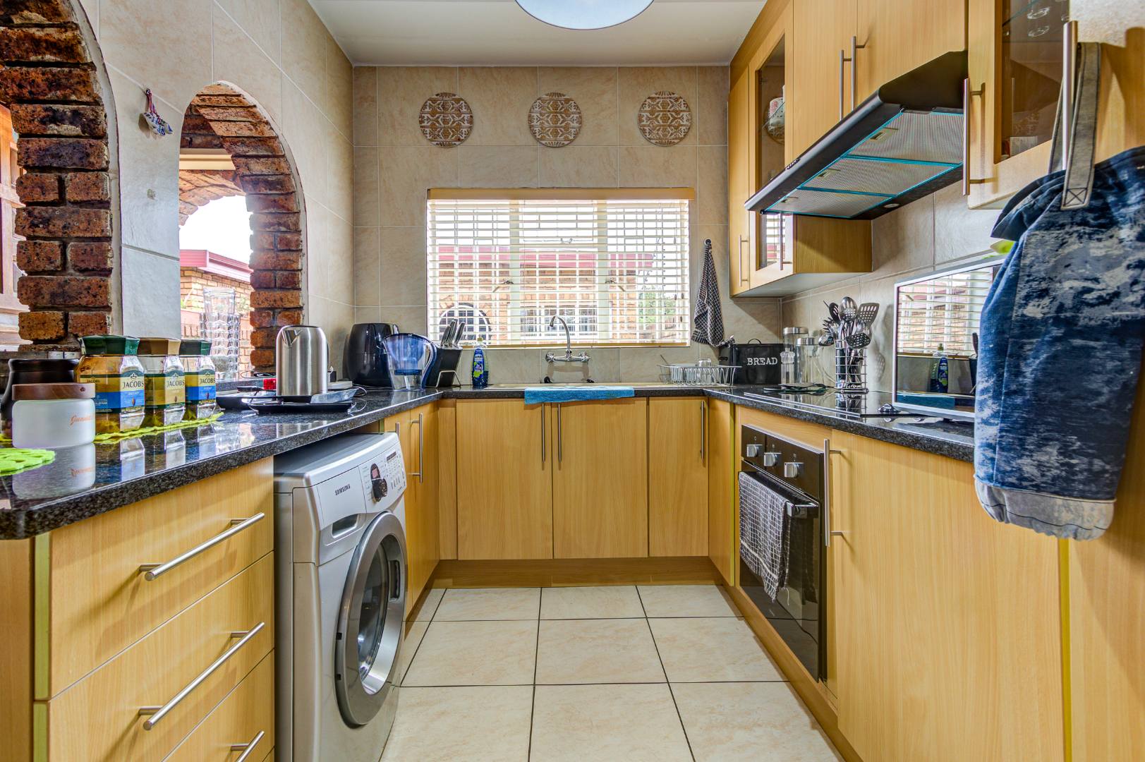 Step inside to an inviting open-plan living area, characterized by an exposed brick accent wall and tiled flooring throughout. The space flows seamlessly into the modern kitchen, which is a highlight with its unique exposed brick archways. It features ample light wooden cabinetry, sleek dark granite countertops, a tiled backsplash, and a built-in oven and range hood. A window provides natural light, and there's convenient space for a washing machine.