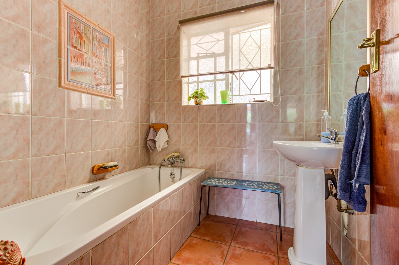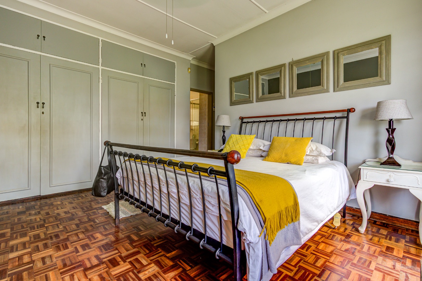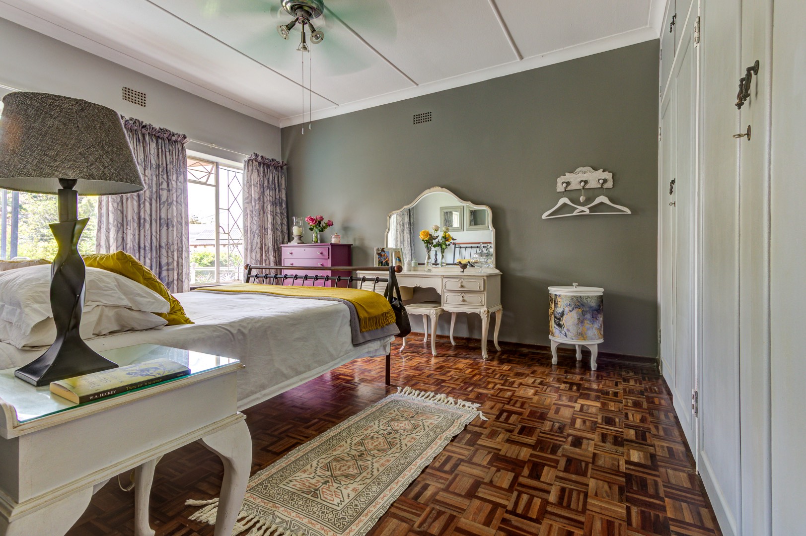Down the passage, the bedroom wing offers three well-sized bedrooms, including a notably large main suite. All bedrooms feature parquet flooring, ceiling fans, built-in cupboards, and calming garden views. The home is serviced by a tiled family bathroom (bath + basin), a separate guest toilet, and a full main en-suite with bath, basin, toilet, and shower.
