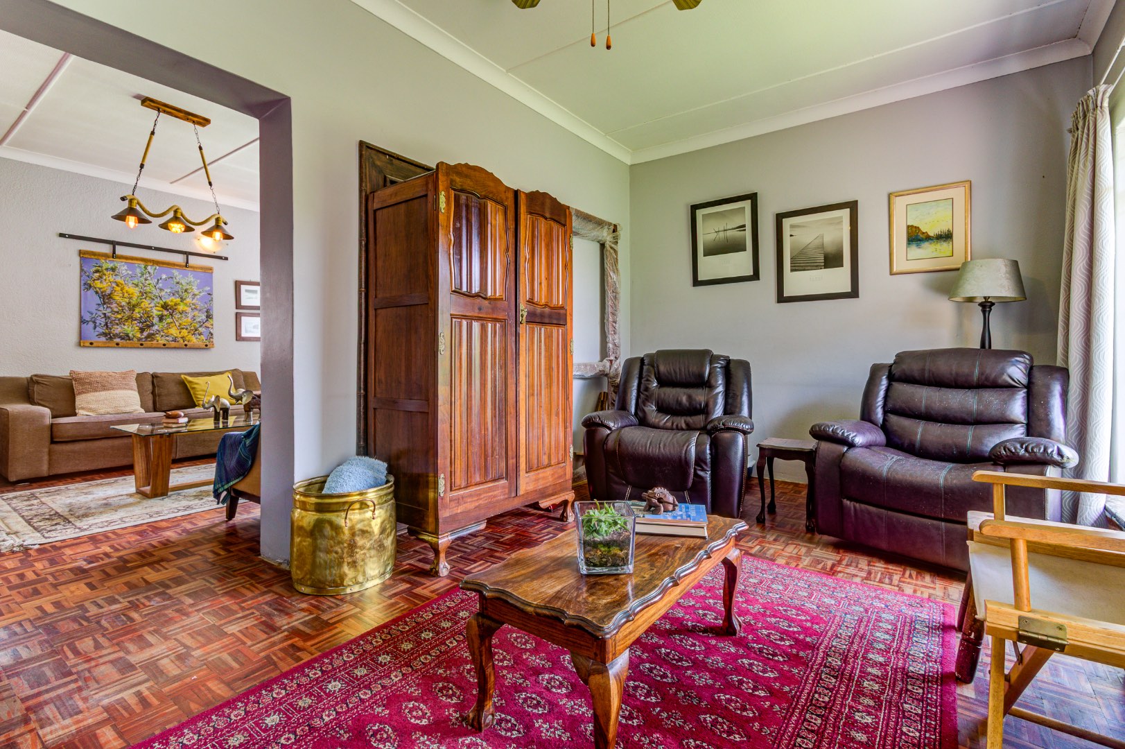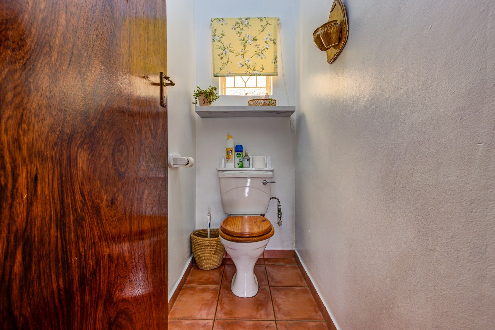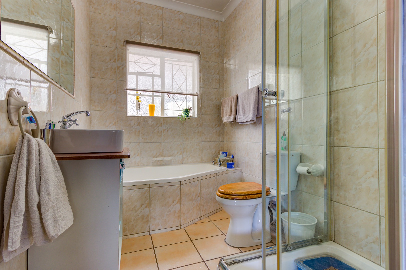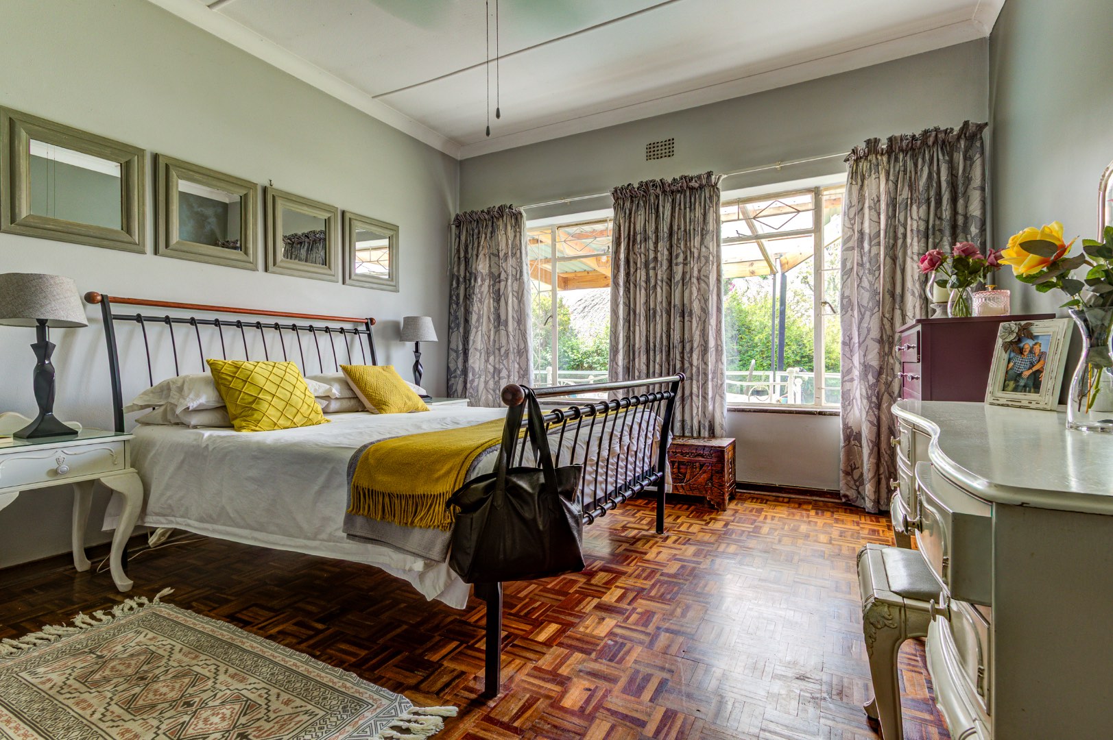 Down the passage, the bedroom wing offers three well-sized bedrooms, including a notably large main suite. All bedrooms feature parquet flooring, ceiling fans, built-in cupboards, and calming garden views. The home is serviced by a tiled family bathroom (bath + basin), a separate guest toilet, and a full main en-suite with bath, basin, toilet, and shower.