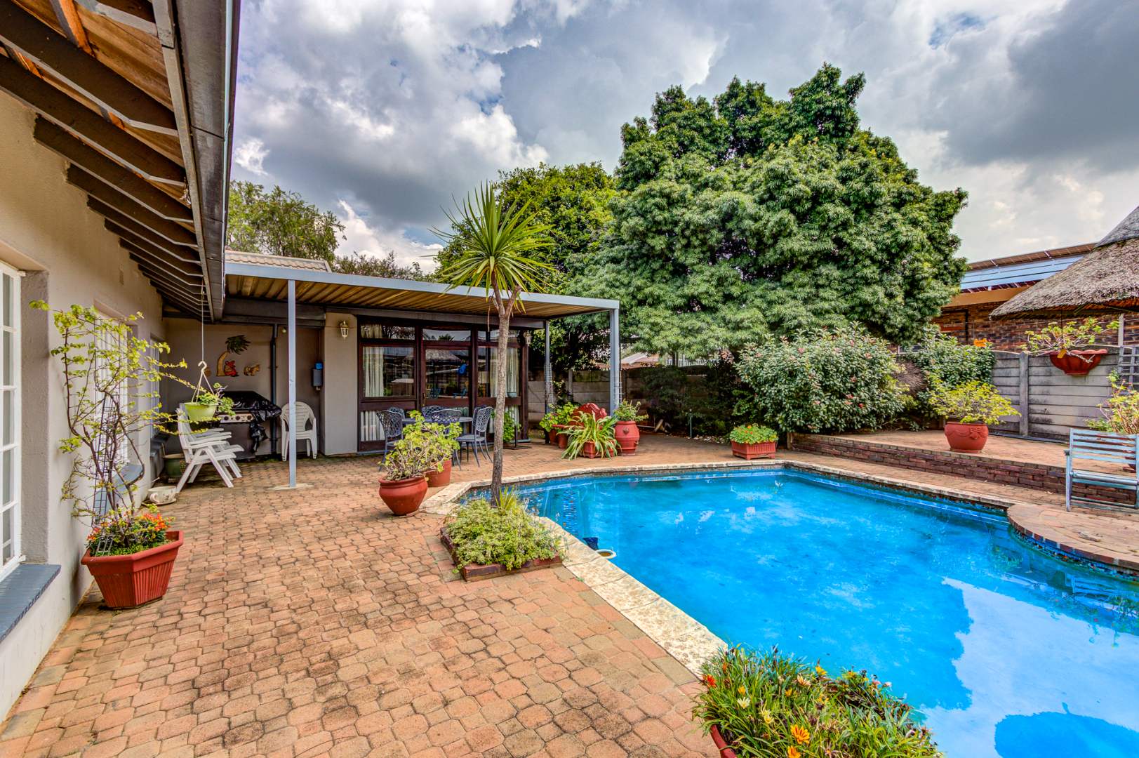 Step outside to a private oasis featuring a refreshing swimming pool, perfect for enjoying sunny days. The expansive garden offers a tranquil retreat and plenty of space for outdoor activities, complemented by a practical patio area for al fresco dining. Parking is well-catered for with a single garage and additional driveway space for up to three vehicles. The property is totally walled, ensuring privacy and security, further enhanced by burglar bars and a security gate. An outside toilet and a dedicated laundry area or storage room add to the home's practicality. Fibre internet connectivity is available, catering to modern connectivity needs. Pets are welcome, making this an ideal home for animal lovers.
