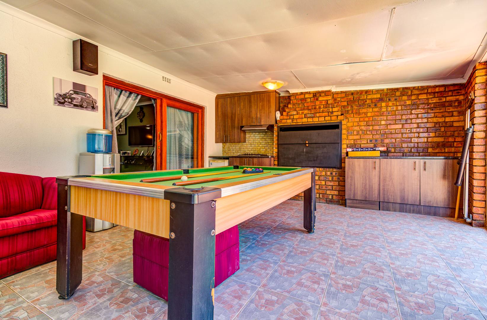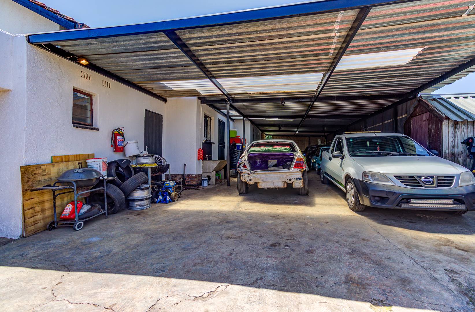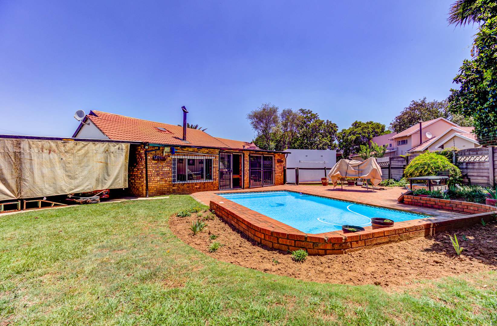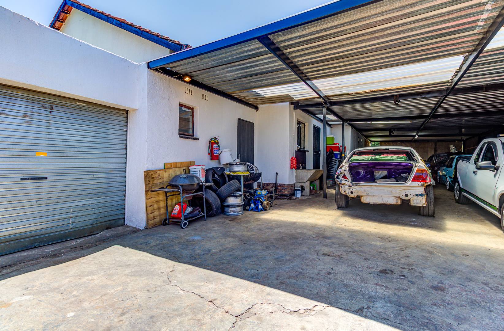 This charming 3-bedroom, 2-bathroom home in Freeway Park, Boksburg, South Africa, offers a generous 1033 sqm erf and a spacious 280 sqm floor size. Its classic white exterior, terracotta tiled roof, and mature landscaping create an inviting first impression. A paved driveway leads to a double garage, complemented by six additional parking spaces under carport, ensuring ample vehicle accommodation.