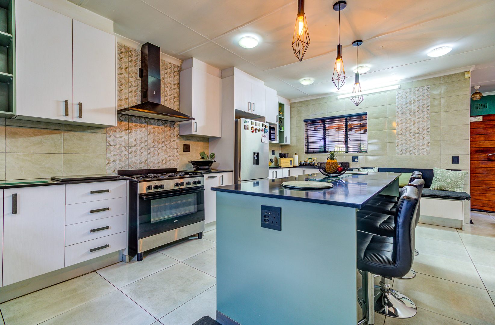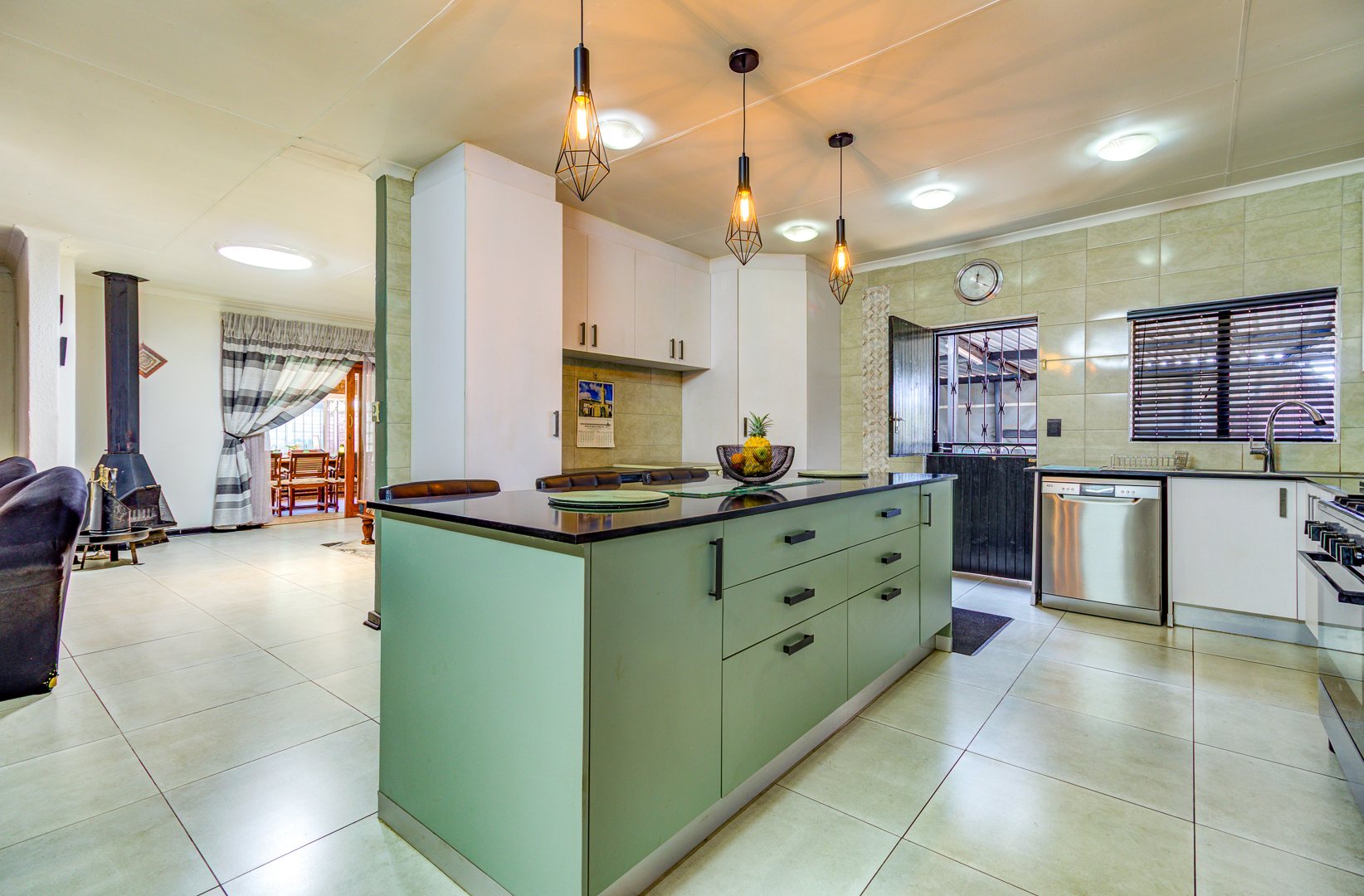 Inside, an inviting entrance hall opens to two comfortable lounges and a dedicated dining room, all featuring durable tiled flooring. The heart of the home is a spacious, open-plan modern kitchen, boasting a large island with breakfast bar seating, ample white cabinetry, and sleek stainless steel appliances. Recessed and pendant lighting illuminate the space, which also includes built-in banquette seating. A freestanding fireplace adds warmth and ambiance to the living area.