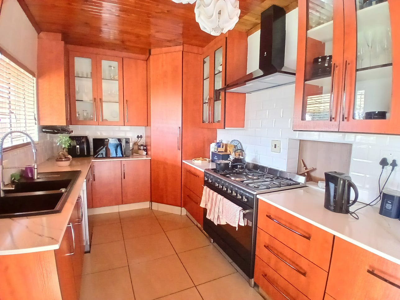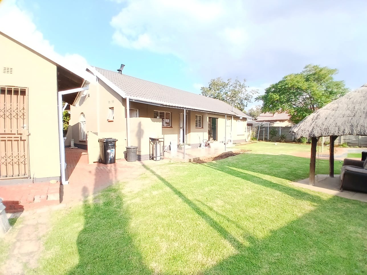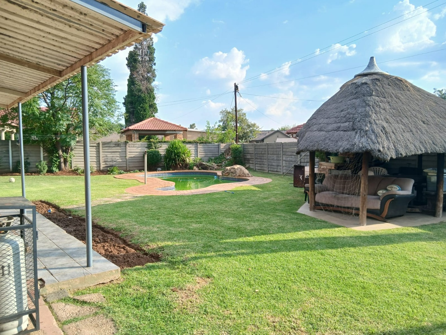 Step outside to a private oasis perfect for leisure and entertainment. The expansive garden hosts a refreshing swimming pool, ideal for warm South African days, alongside a thatched lapa for outdoor gatherings. Paved walkways and generous outdoor areas enhance the usability of the garden, which also benefits from an outside toilet and a Wendy house for additional storage or utility.