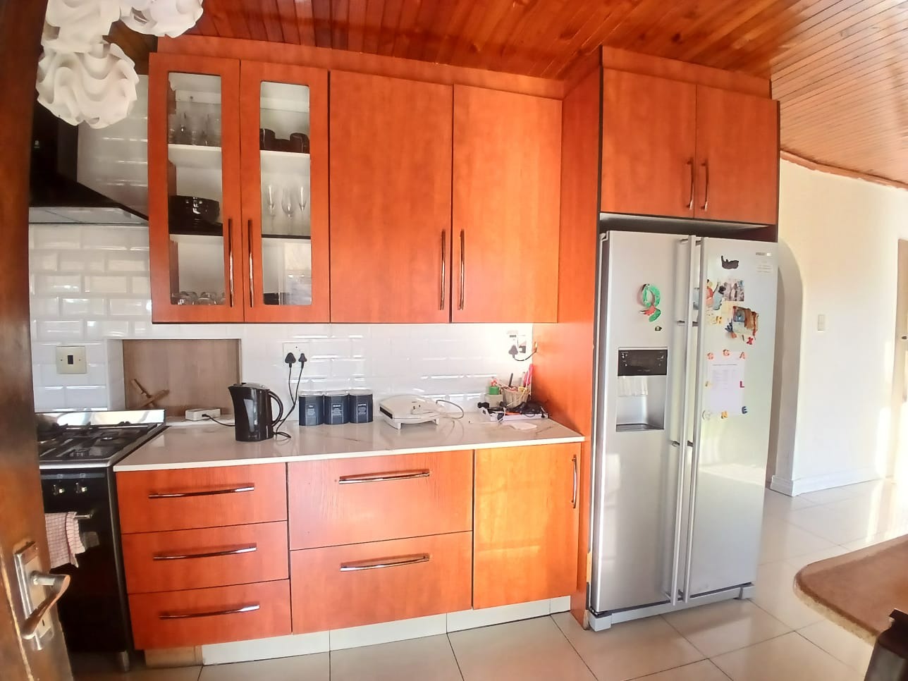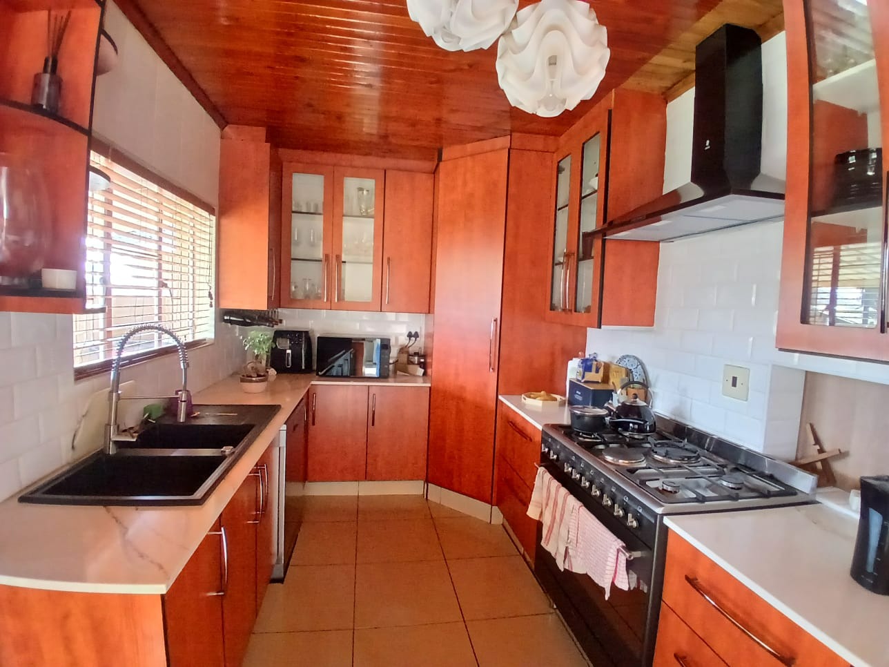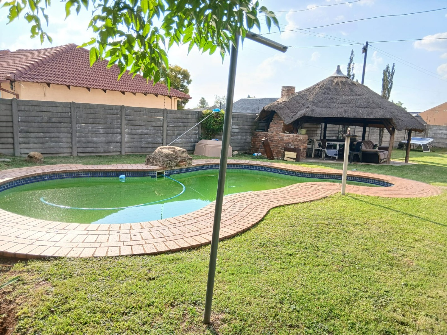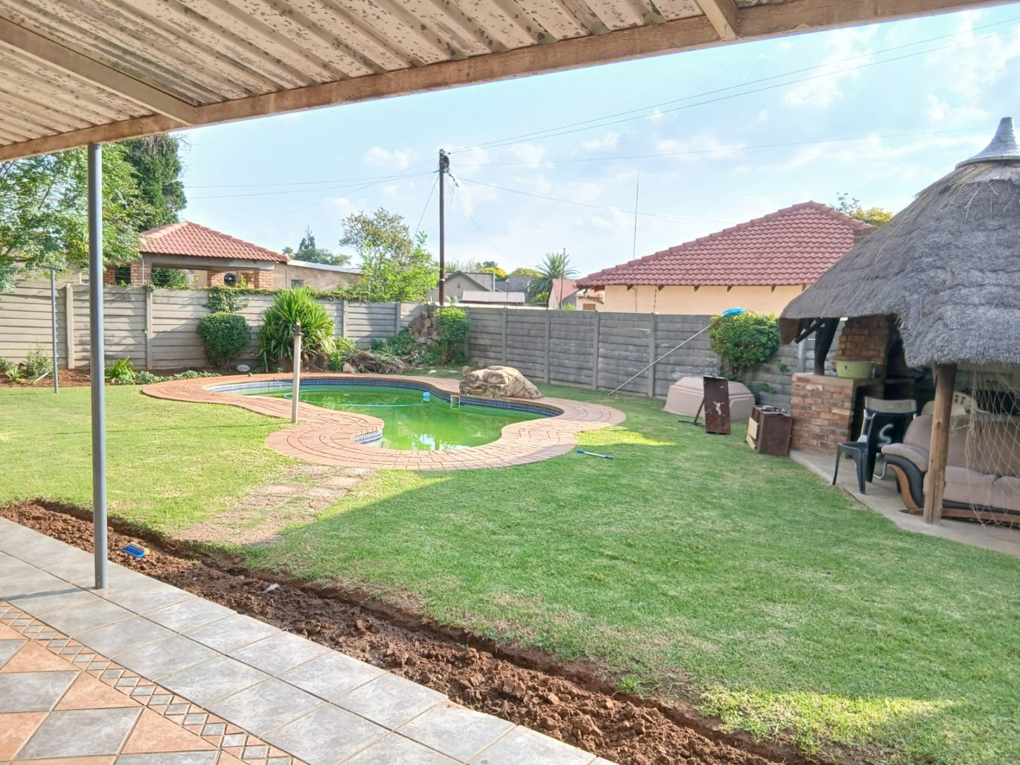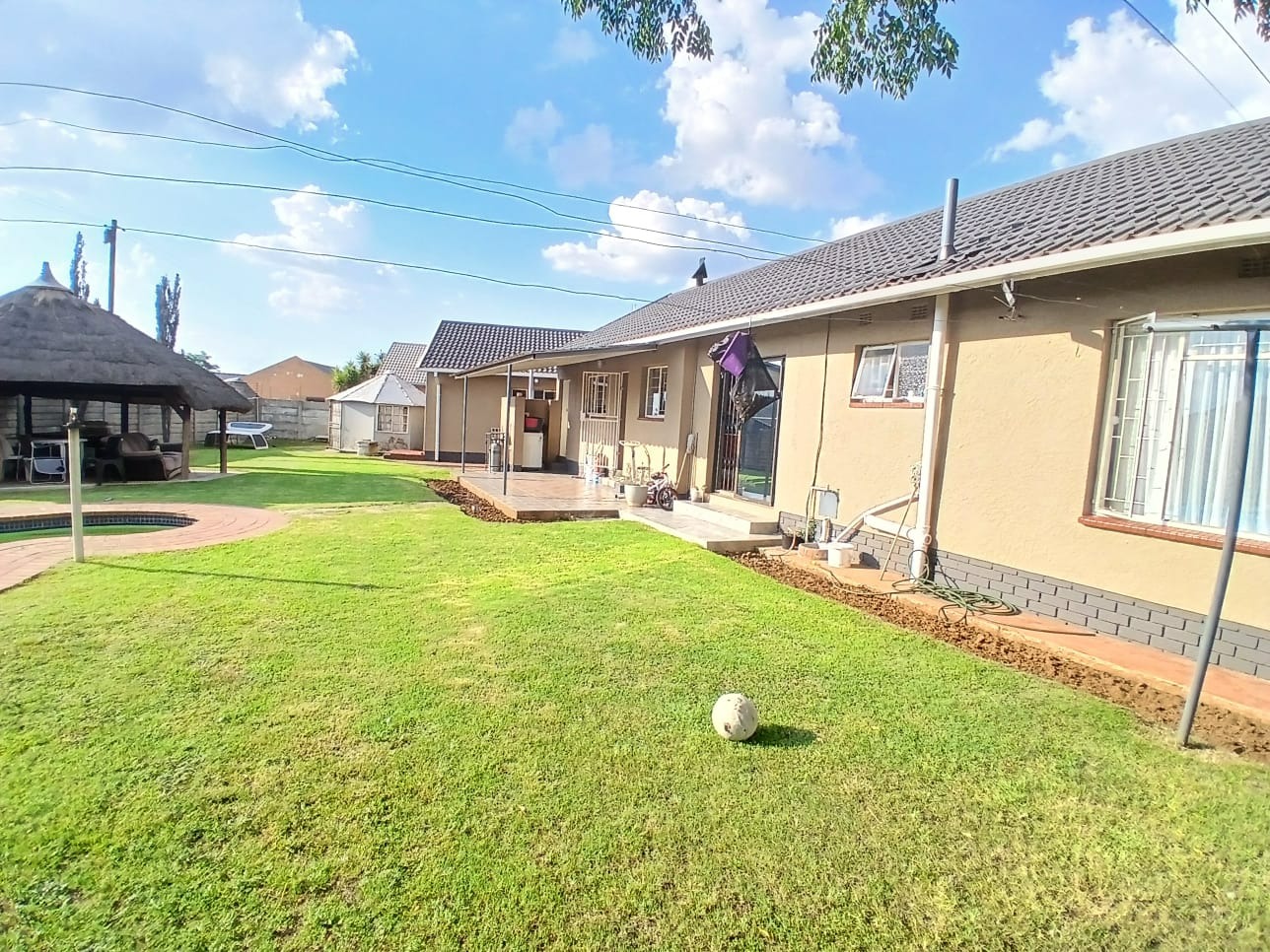 Step outside to a private oasis perfect for leisure and entertainment. The expansive garden hosts a refreshing swimming pool, ideal for warm South African days, alongside a thatched lapa for outdoor gatherings. Paved walkways and generous outdoor areas enhance the usability of the garden, which also benefits from an outside toilet and a Wendy house for additional storage or utility.