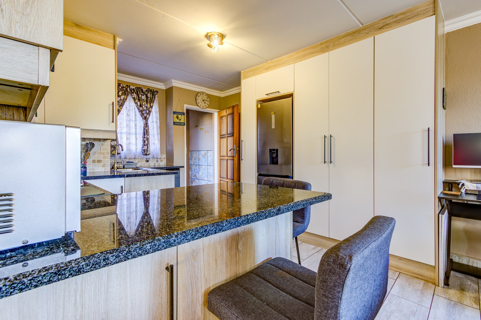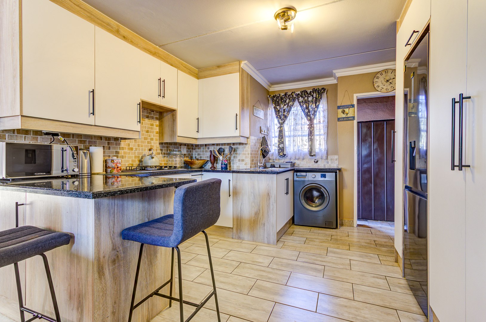 The modern kitchen is a highlight, boasting light-toned cabinetry, granite countertops, and a stylish mosaic tiled backsplash. Equipped with an integrated washing machine and large refrigerator, it features a functional island with seating, ensuring both practicality and aesthetic appeal.