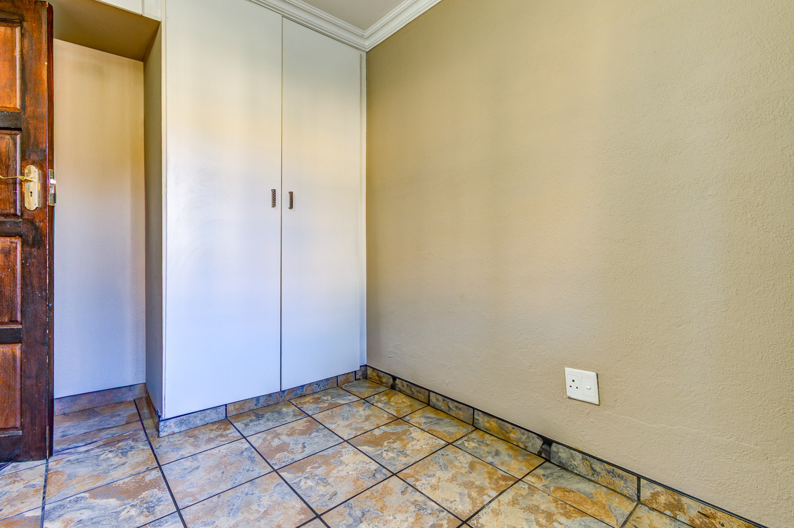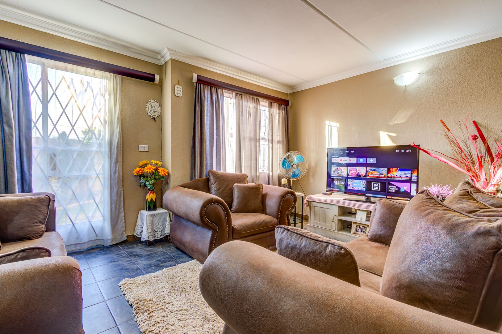Security is paramount, with the complex featuring 24-hour security, an access gate, electric fencing, and a security post. The unit itself is fitted with burglar bars and a security gate for peace of mind. Fibre connectivity is available, and additional storage space under the stairwell is provided.