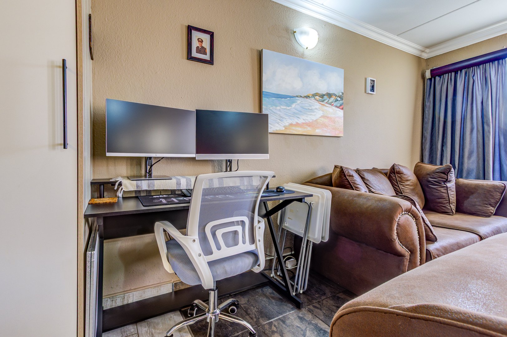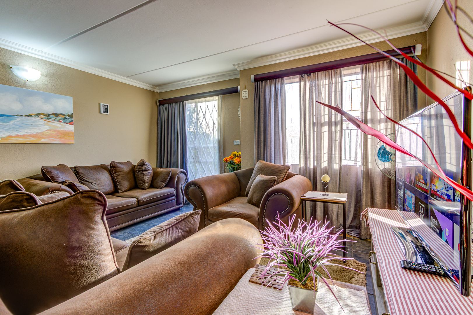 Discover this inviting 2-bedroom, 1-bathroom residence within a secure complex in Impala Park, Boksburg. The open-plan living area seamlessly integrates a comfortable lounge and dining space, featuring durable tiled flooring and elegant crown molding. Natural light fills the room, which also includes a dedicated home office nook.