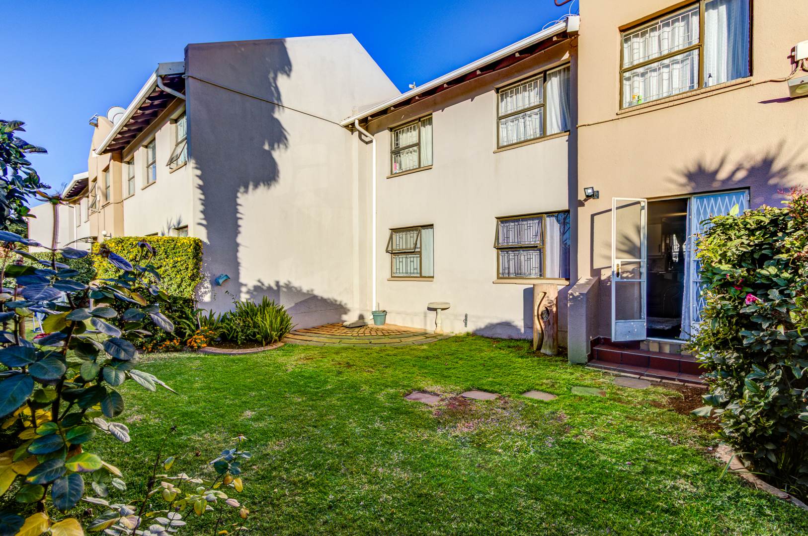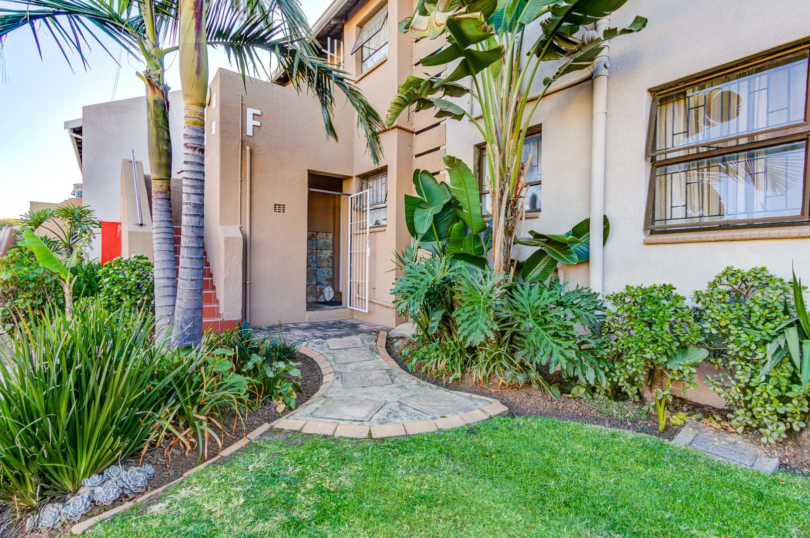 Step outside to a communal, well-maintained backyard, ideal for outdoor relaxation. Residents also benefit from access to a communal pool. The property offers two dedicated parking spaces and a charming garden, enhancing its kerb appeal with tropical landscaping and a welcoming stone pathway.