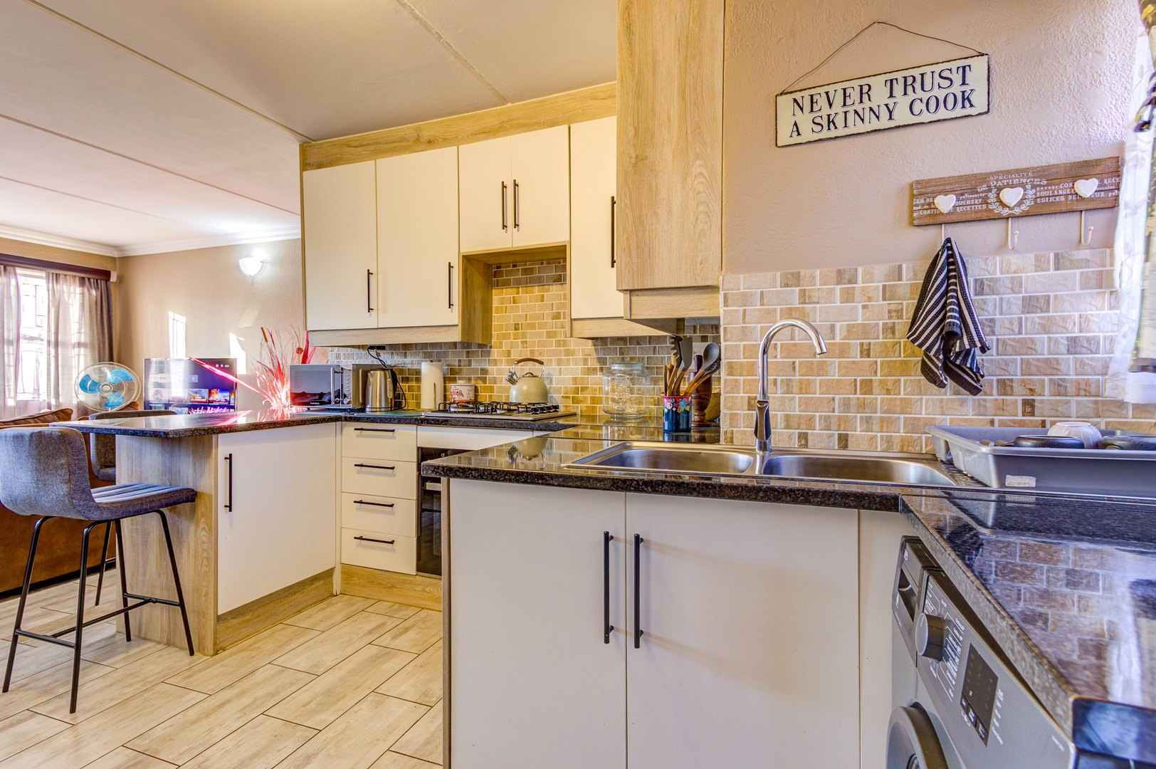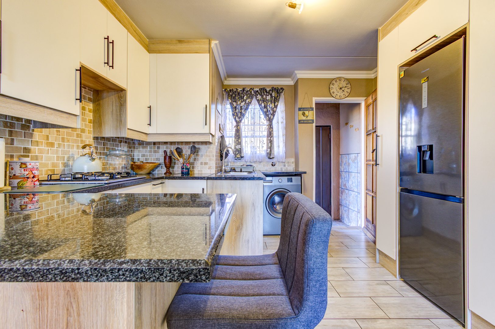 The modern kitchen is a highlight, boasting light-toned cabinetry, granite countertops, and a stylish mosaic tiled backsplash. Equipped with an integrated washing machine and large refrigerator, it features a functional island with seating, ensuring both practicality and aesthetic appeal.