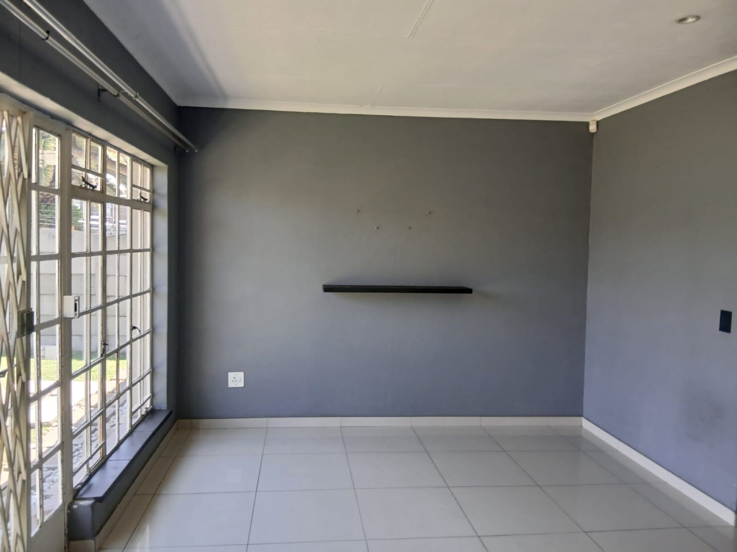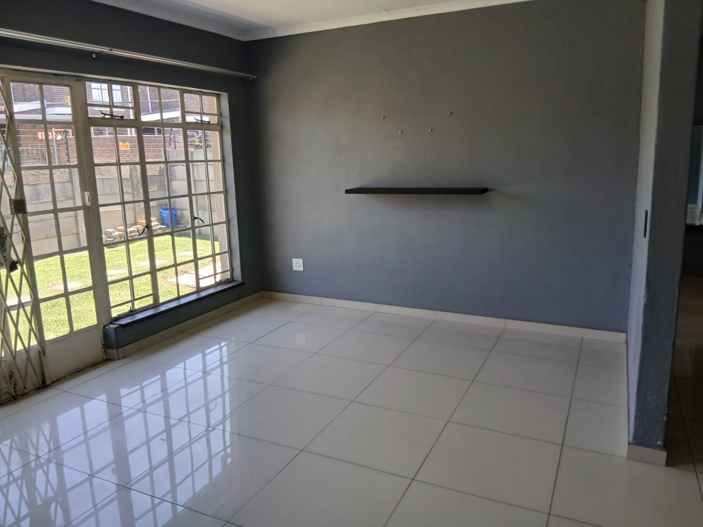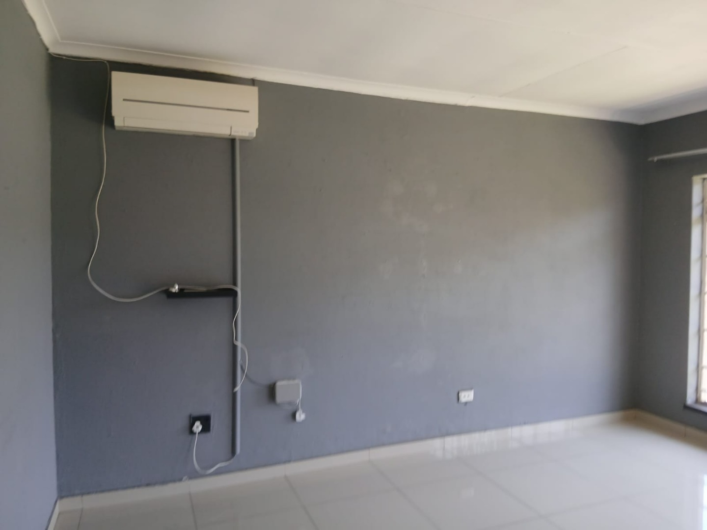 Inside, the home presents a functional layout with a kitchen, dining room, and an open-plan lounge, all designed for modern living. Bright interior spaces benefit from ample natural light and feature durable tiled flooring throughout. Neutral grey walls provide a versatile canvas, complemented by crown molding. An air conditioning unit ensures climate control.