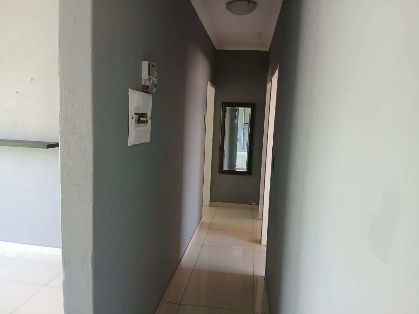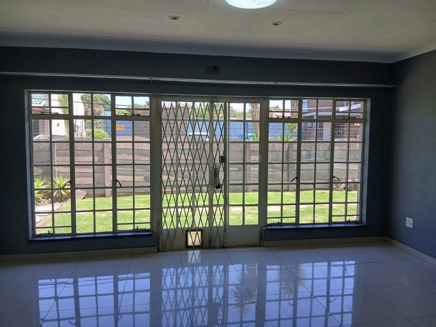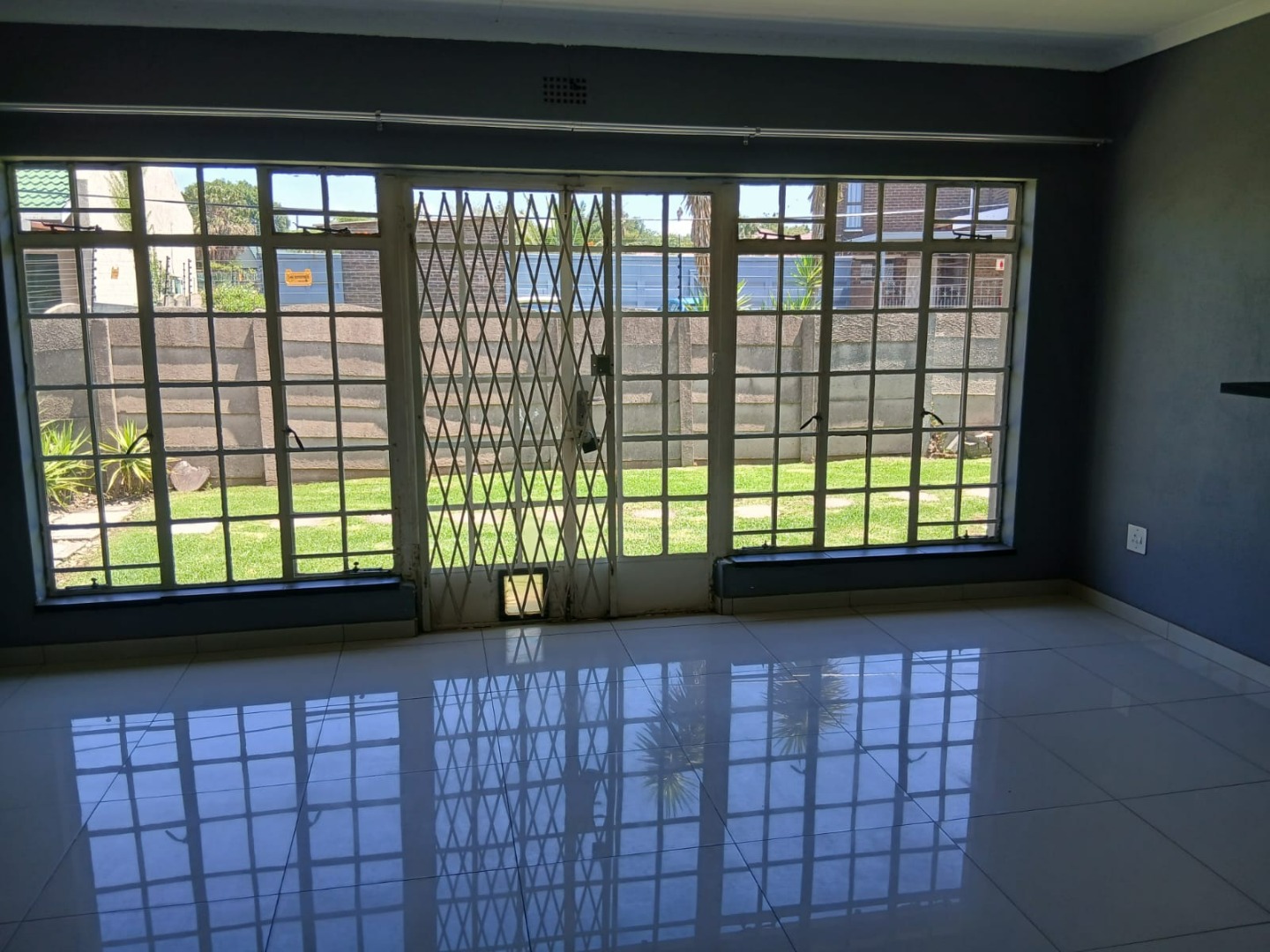 Inside, the home presents a functional layout with a kitchen, dining room, and an open-plan lounge, all designed for modern living. Bright interior spaces benefit from ample natural light and feature durable tiled flooring throughout. Neutral grey walls provide a versatile canvas, complemented by crown molding. An air conditioning unit ensures climate control.