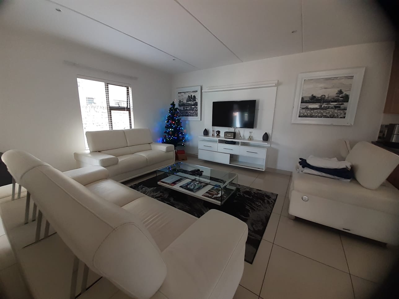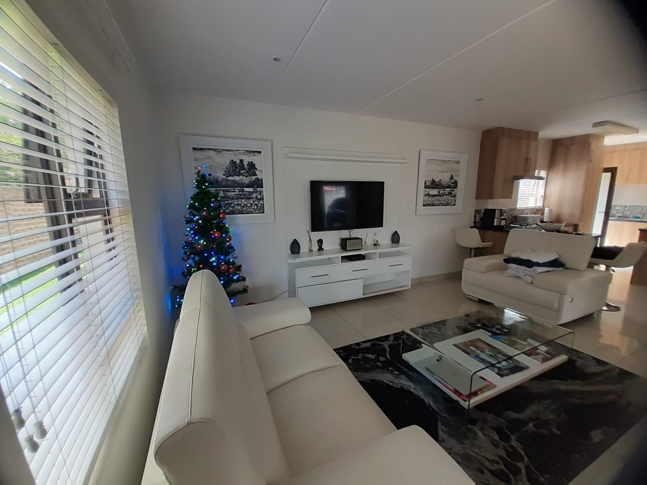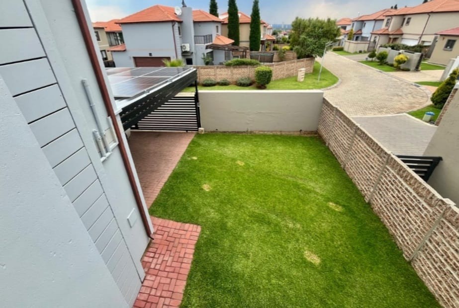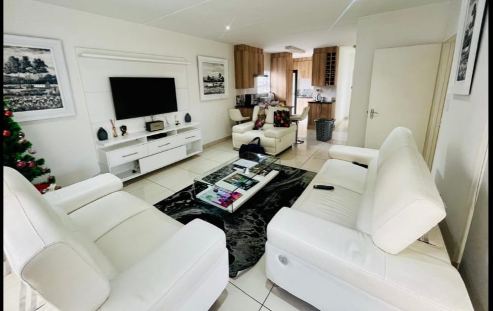Discover modern living in this exquisite 3-bedroom, 2.5-bathroom residence located within a secure estate in Parkrand, Boksburg. Boasting a contemporary architectural style, the property immediately impresses with its well-maintained lawn, paved driveway, and a practical multi-car carport alongside an integrated double garage, offering ample parking solutions.