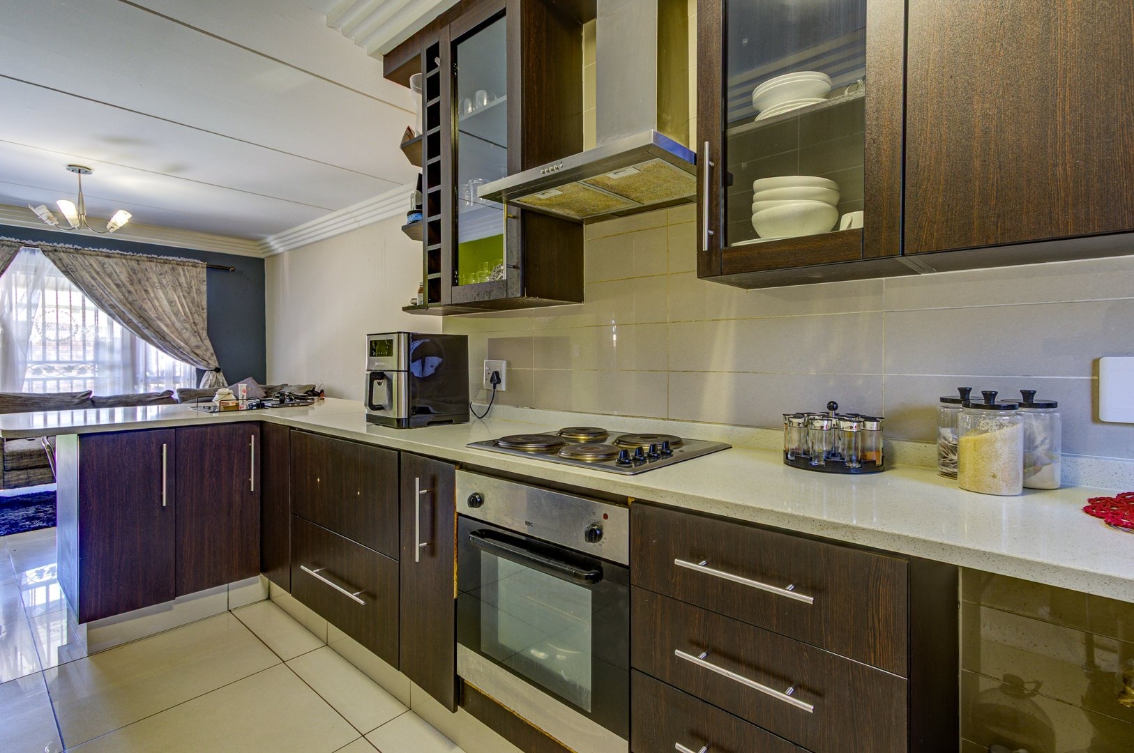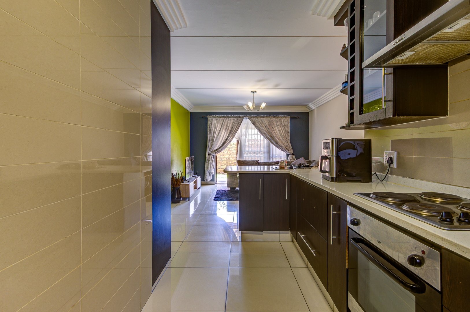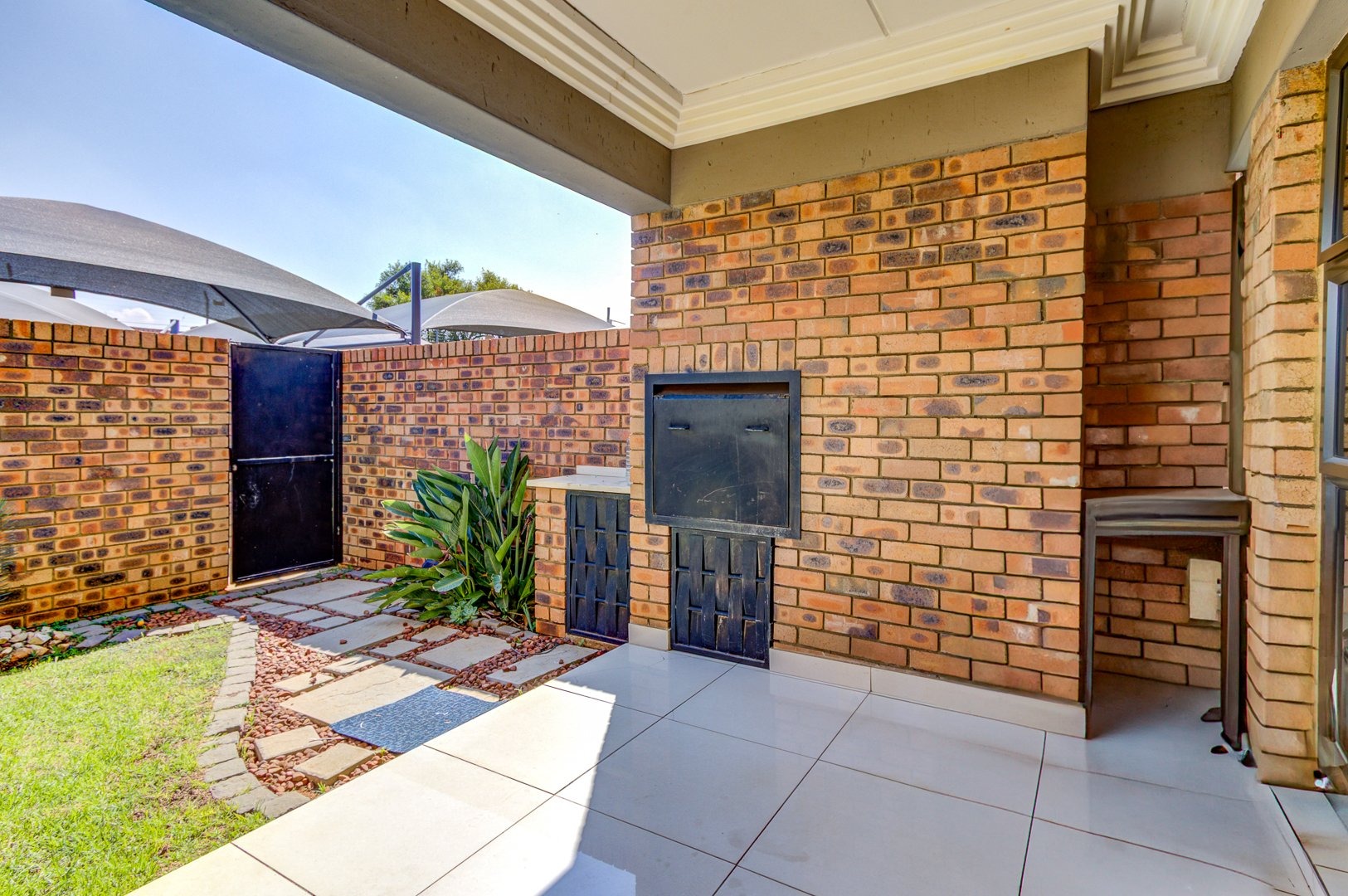 At the heart of the home is a stylish open-plan kitchen, boasting an abundance of additional built-in cupboards for all your storage needs. Featuring sleek quartz countertops, a four-plate hob, and an under-counter oven, this space is both functional and sophisticated. With ample room for all major appliances, it seamlessly flows into the fully tiled living area—perfect for comfortable living and effortless entertaining. This inviting space opens onto a beautifully manicured garden with a built-in braai creating a private retreat ideal for relaxation or entertaining.