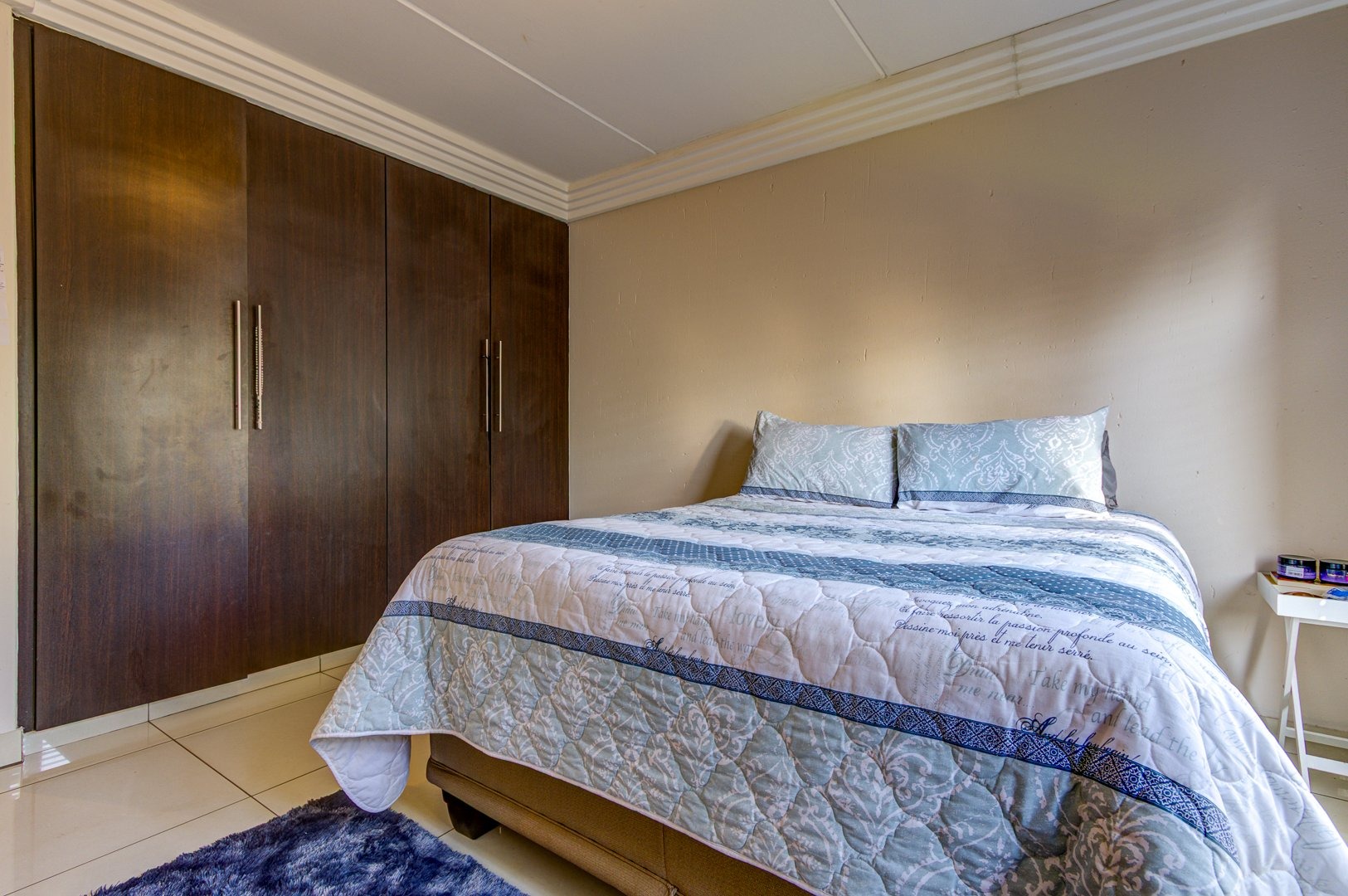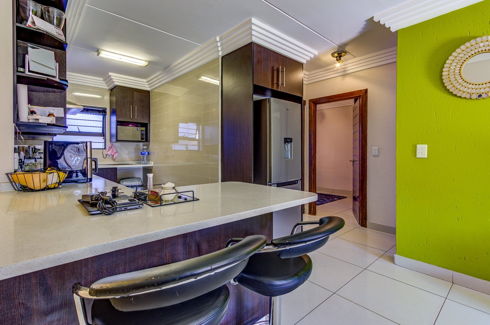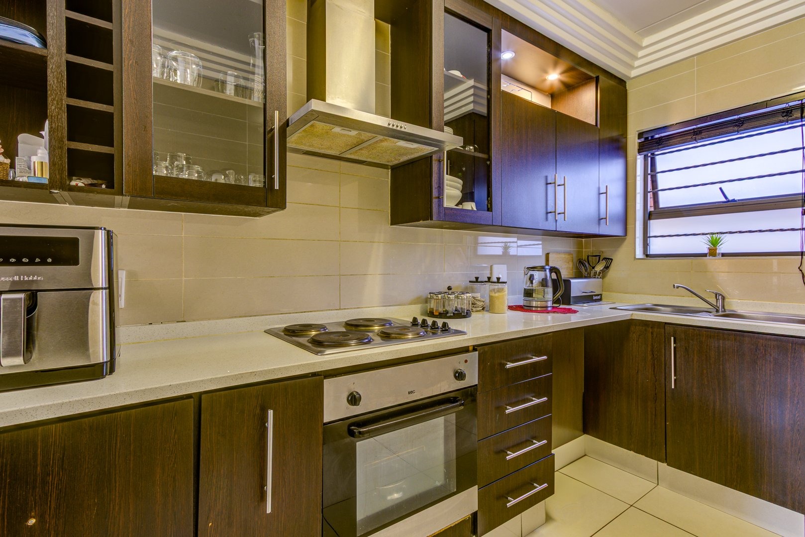 At the heart of the home is a stylish open-plan kitchen, boasting an abundance of additional built-in cupboards for all your storage needs. Featuring sleek quartz countertops, a four-plate hob, and an under-counter oven, this space is both functional and sophisticated. With ample room for all major appliances, it seamlessly flows into the fully tiled living area—perfect for comfortable living and effortless entertaining. This inviting space opens onto a beautifully manicured garden with a built-in braai creating a private retreat ideal for relaxation or entertaining.