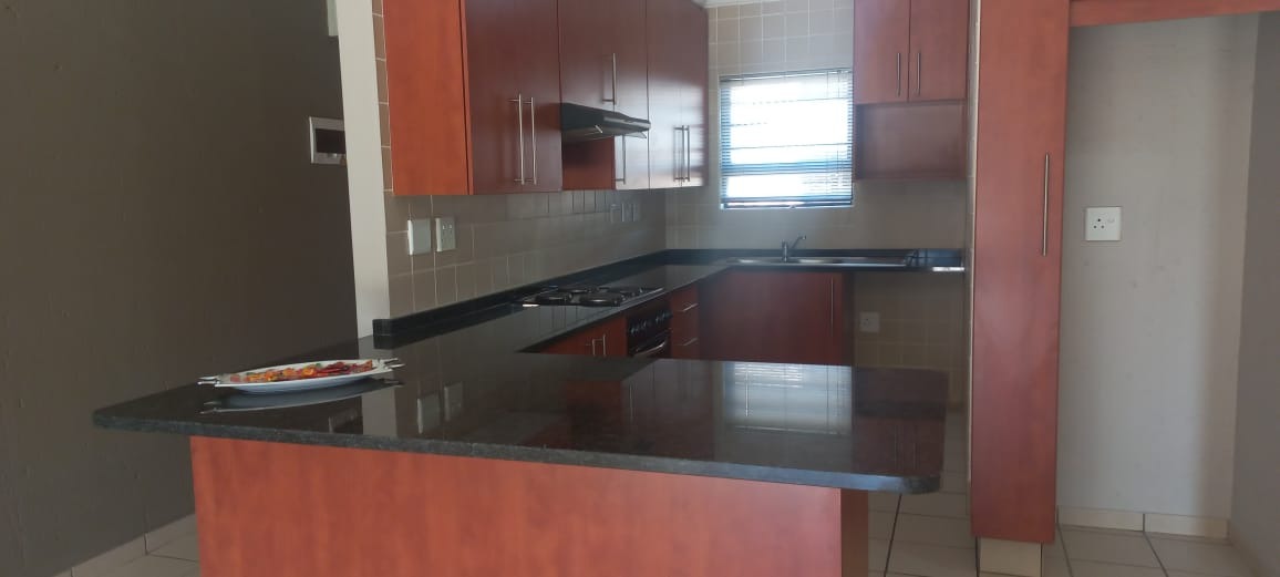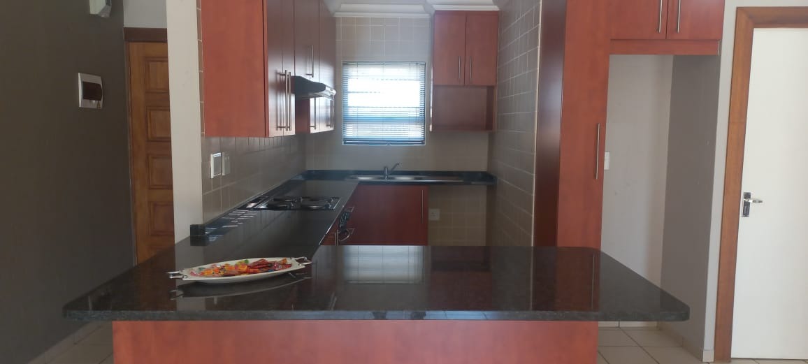 A stylish cherry-wood kitchen with granite countertops, designed with open-plan flow into the living area.