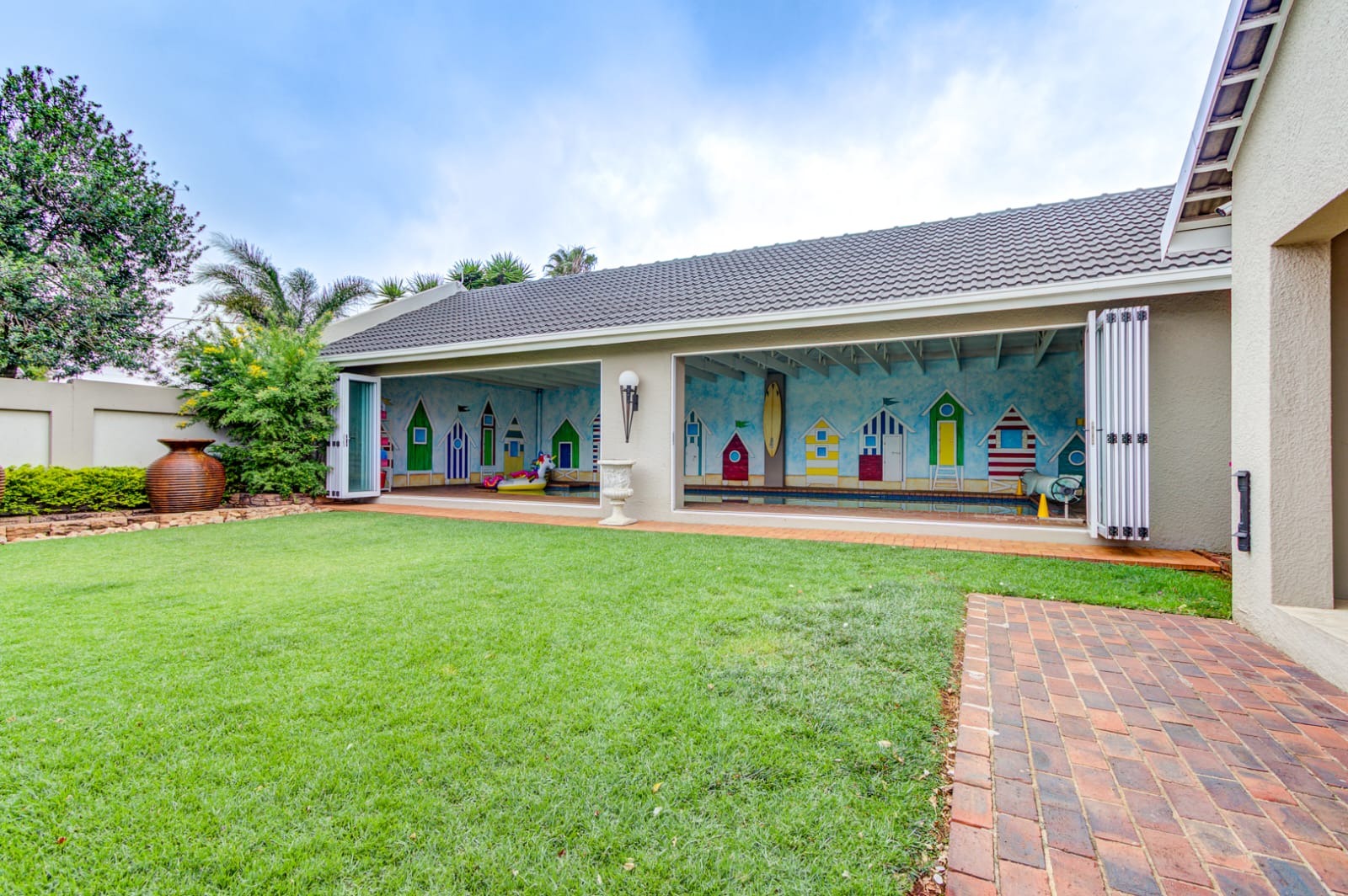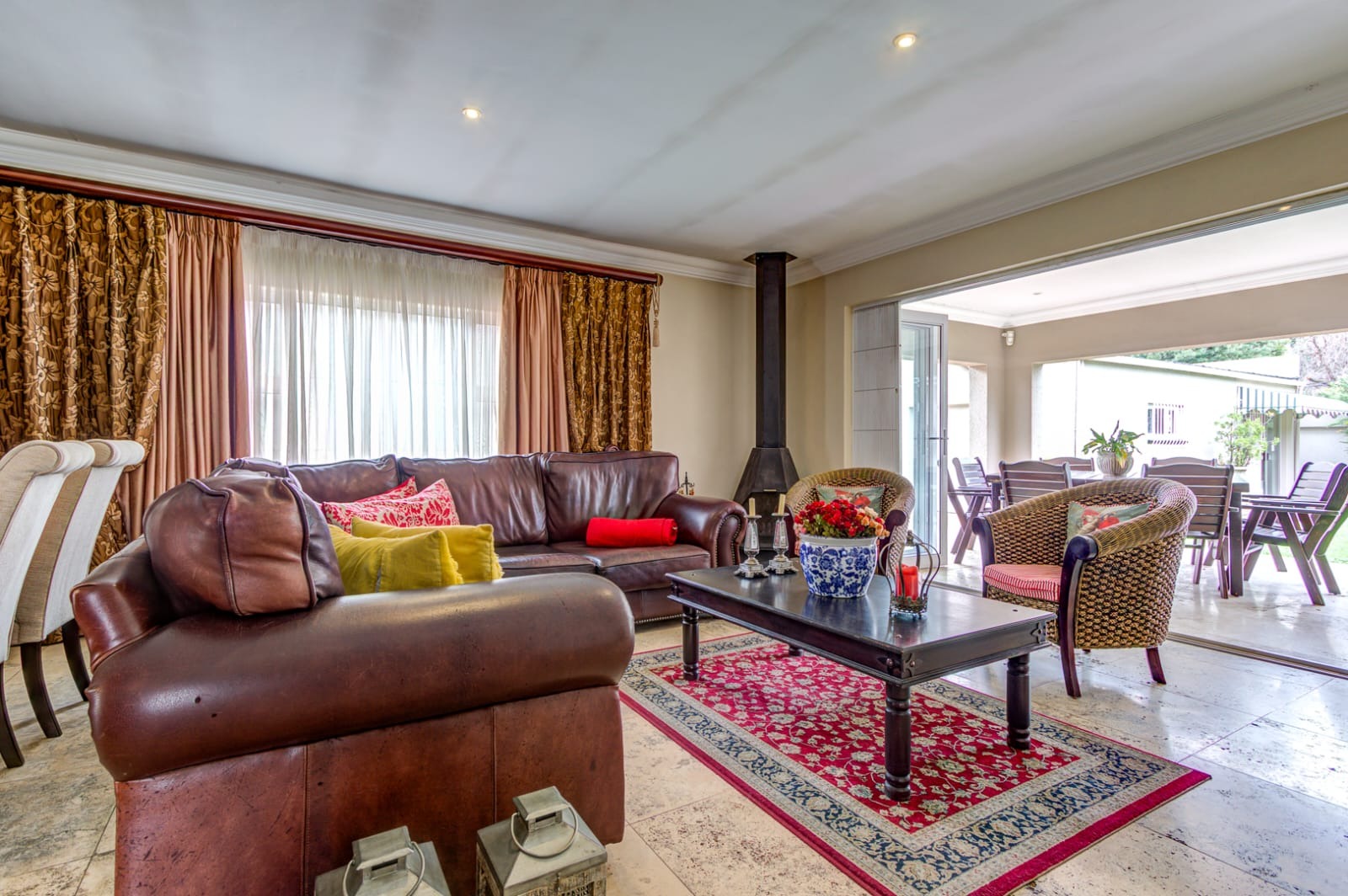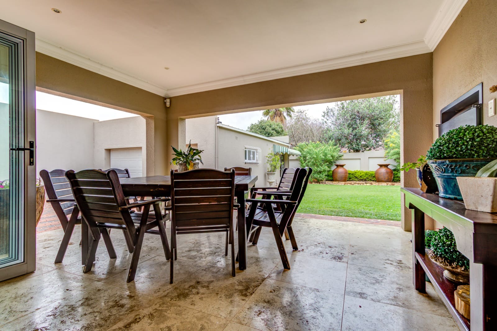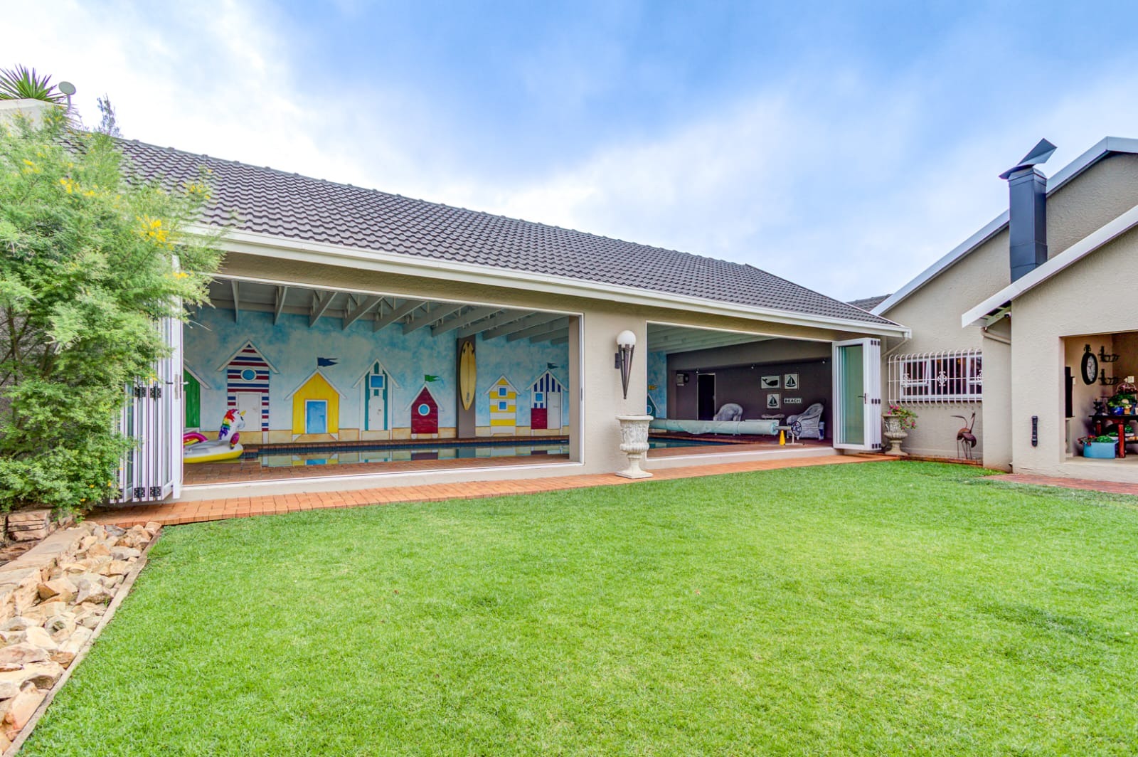 Step out through stacking doors from the lounge into the sunny garden and patio area, complete with a built-in braai — perfect for entertaining or relaxing on warm days. Enjoy the seamless flow of fresh air and natural light throughout the home.