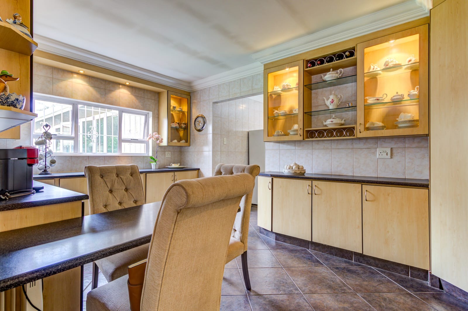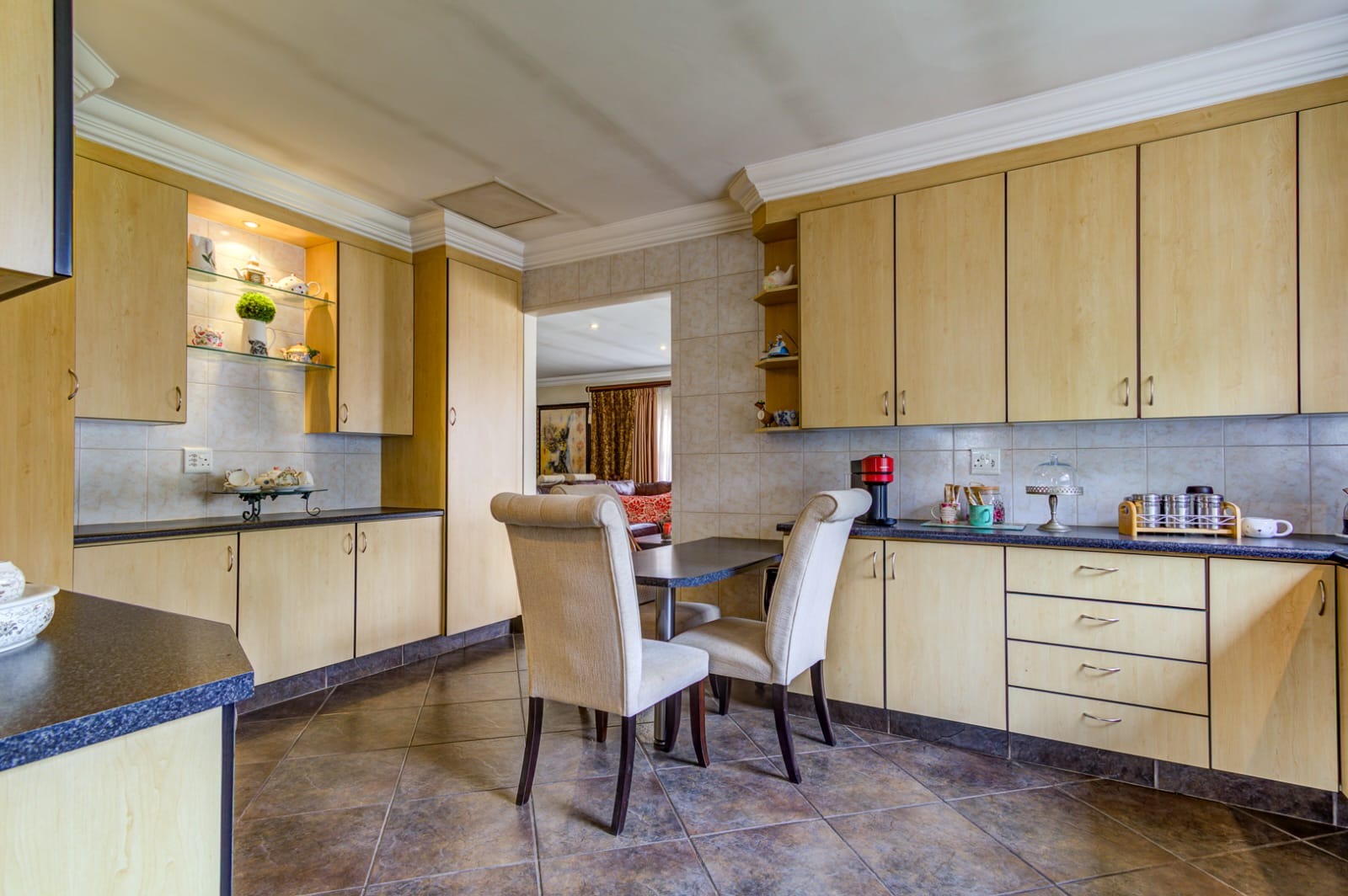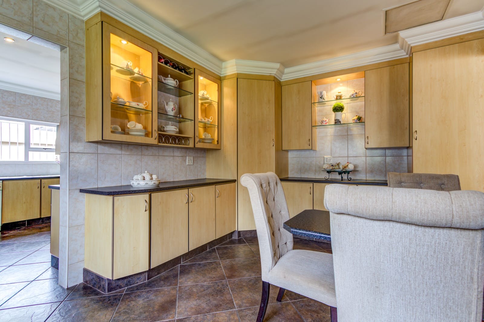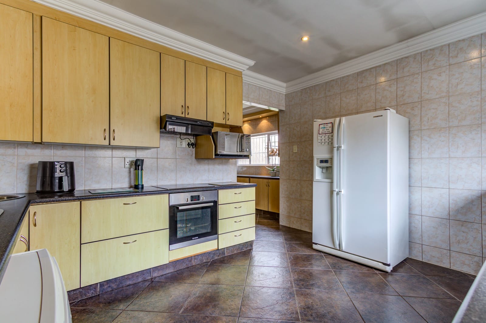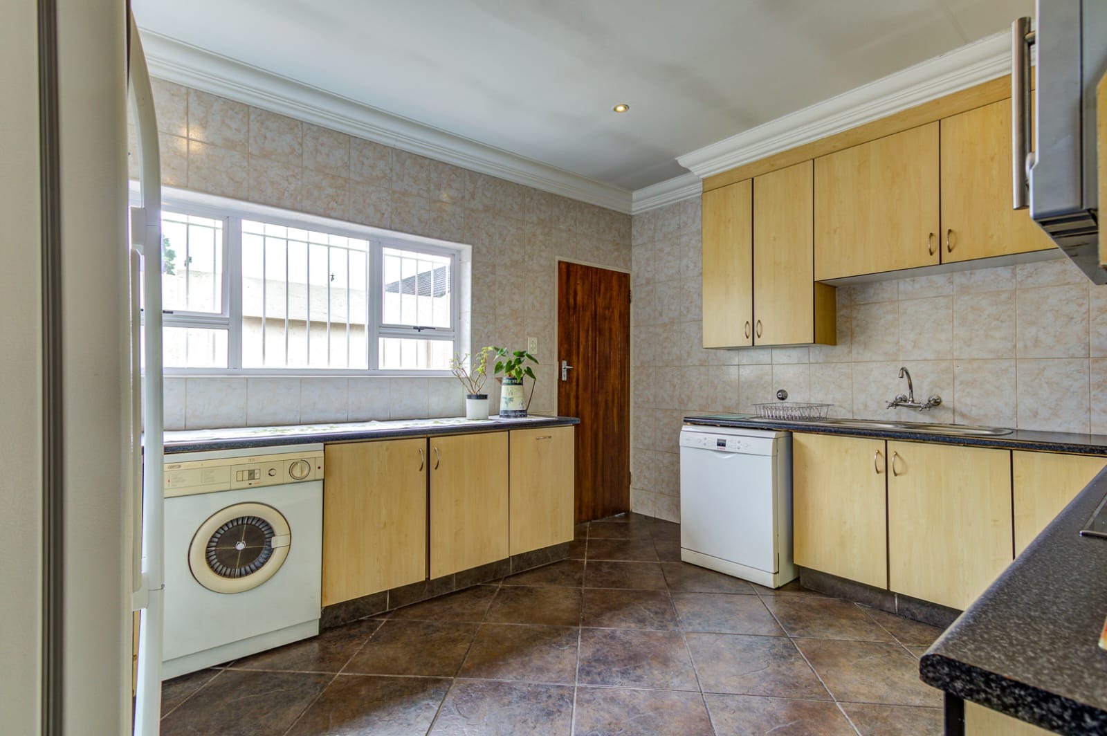 - Modern Kitchen with ample cupboards, space for a double-door fridge, and a scullery with room for a dishwasher. The back door conveniently leads to the outdoor area.