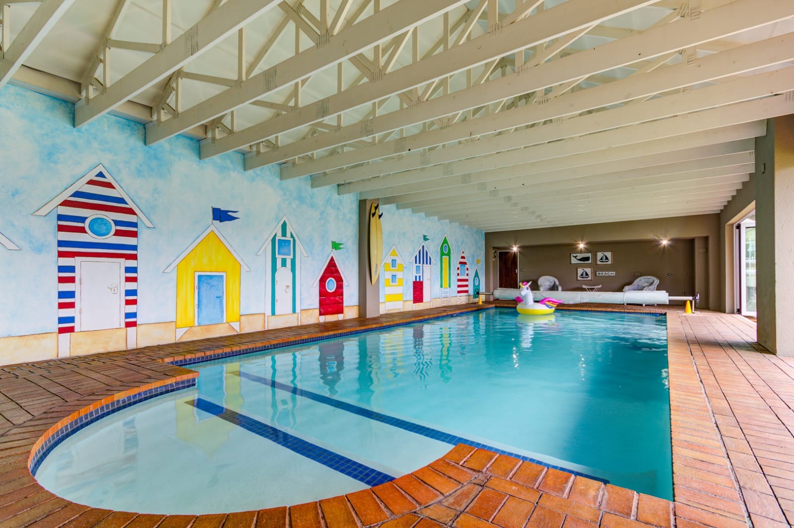 One of the standout features of this property is its enclosed, heated swimming pool area, currently utilized as a swimming school. The space is beautifully designed with stacking doors to allow for both climate control and an abundance of natural light. There’s also a separate bathroom with a toilet and basin, ideal for guests or pool users.