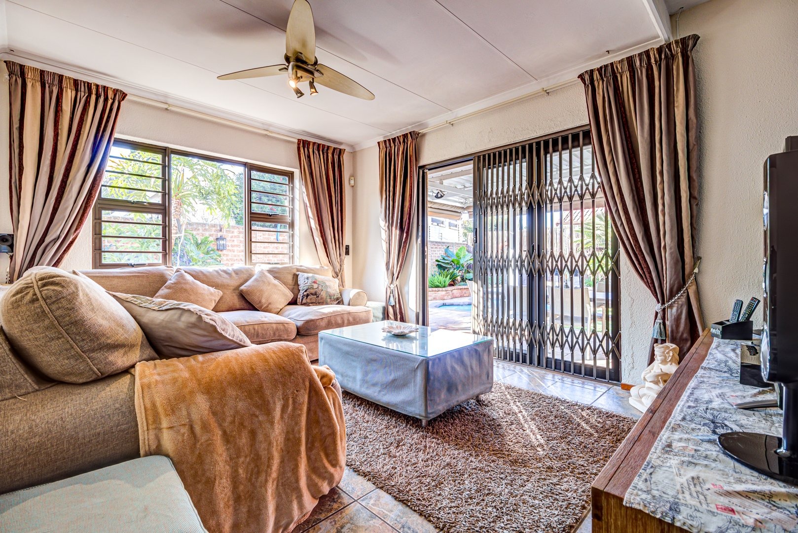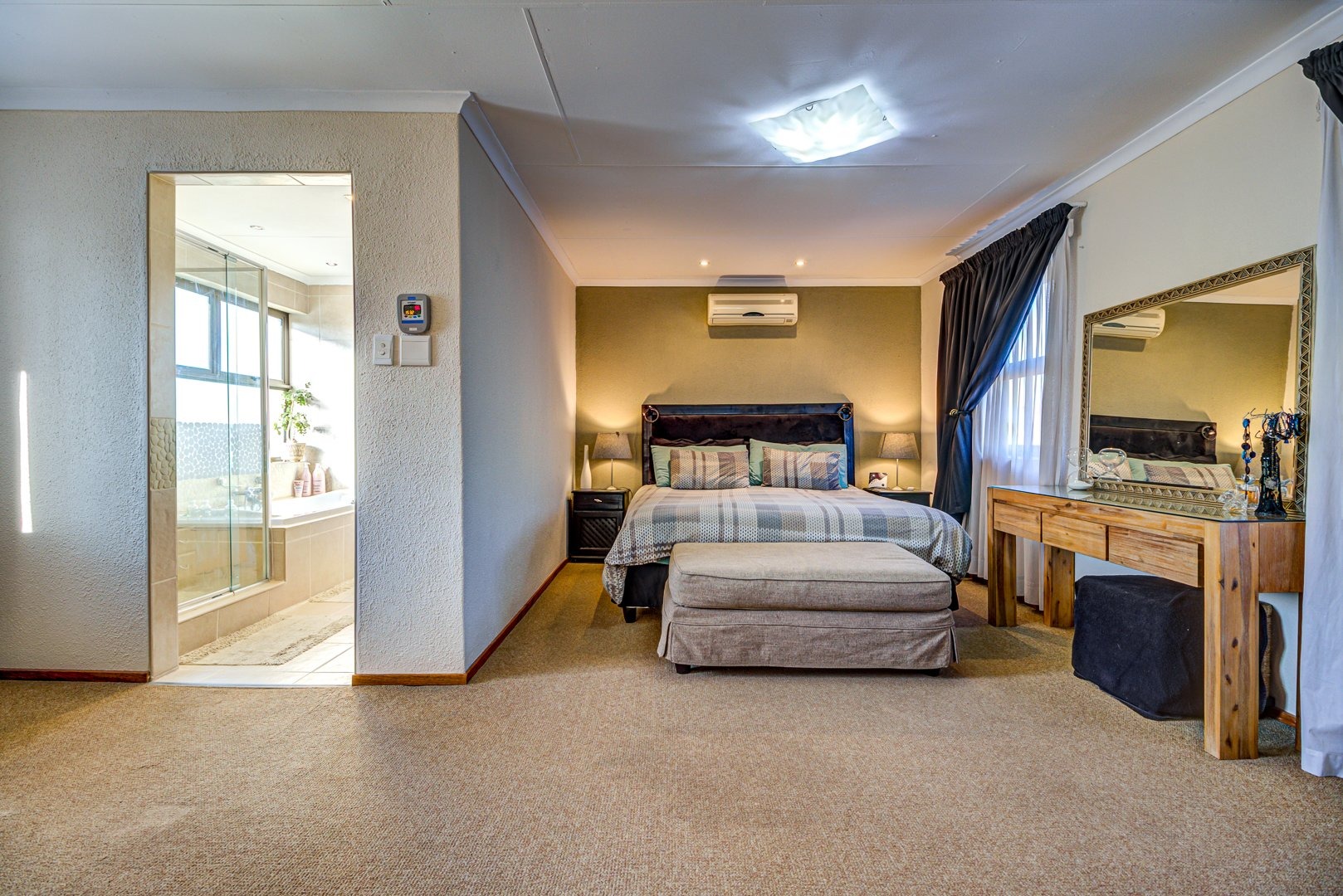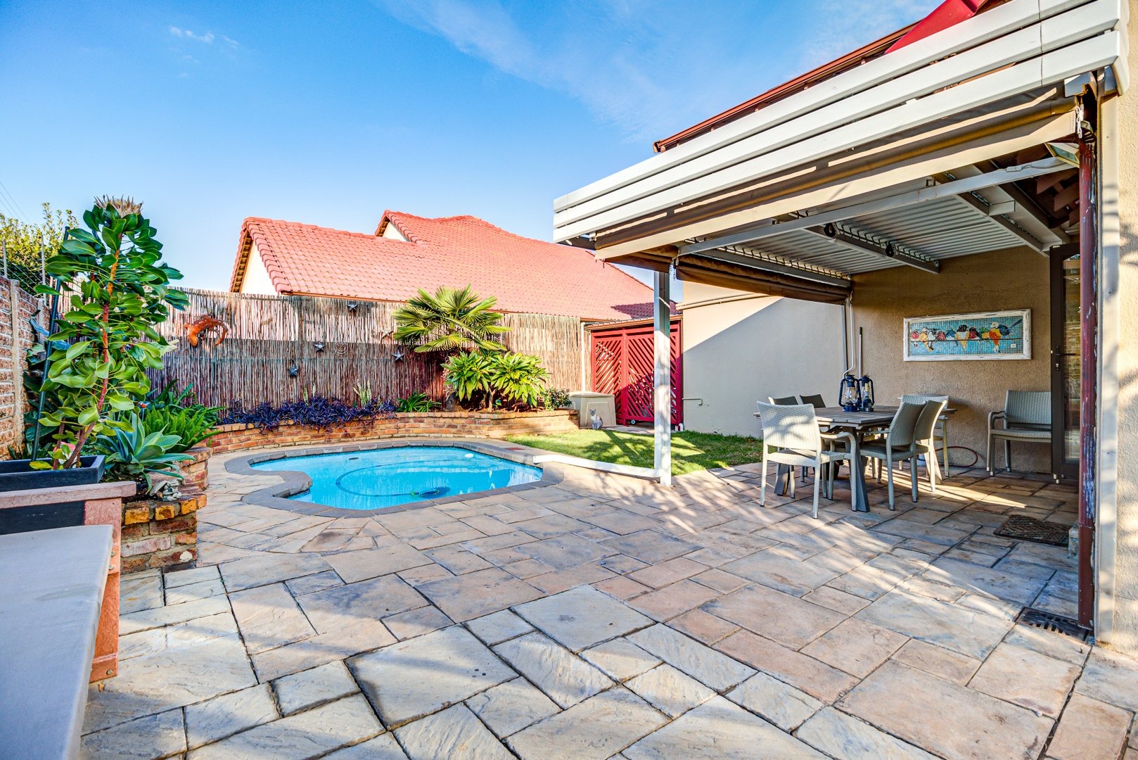 Open plan lounge and dining room. Open plan kitchen with granite tops, a breakfast counter and scullery. 3 Spacious bedrooms. 3 Modern bathrooms. Main bedroom with an en-suite bathroom and pajama lounge/ study. Two bedrooms has their own en-suite bathrooms. There is also an aircon inside the home for those hot summer days. Triple garage with automated doors and direct entry to the home. Triple carport parking. Solar heated pool to make a splash in! Landscaped garden. Covered patio. Security guard on duty 24/7.