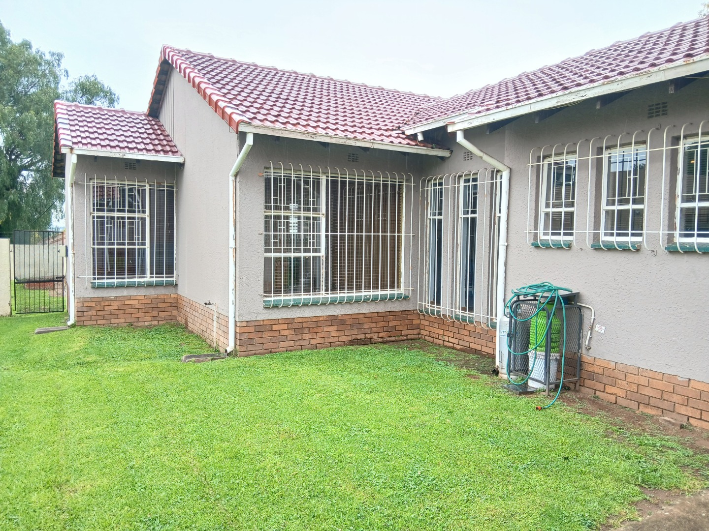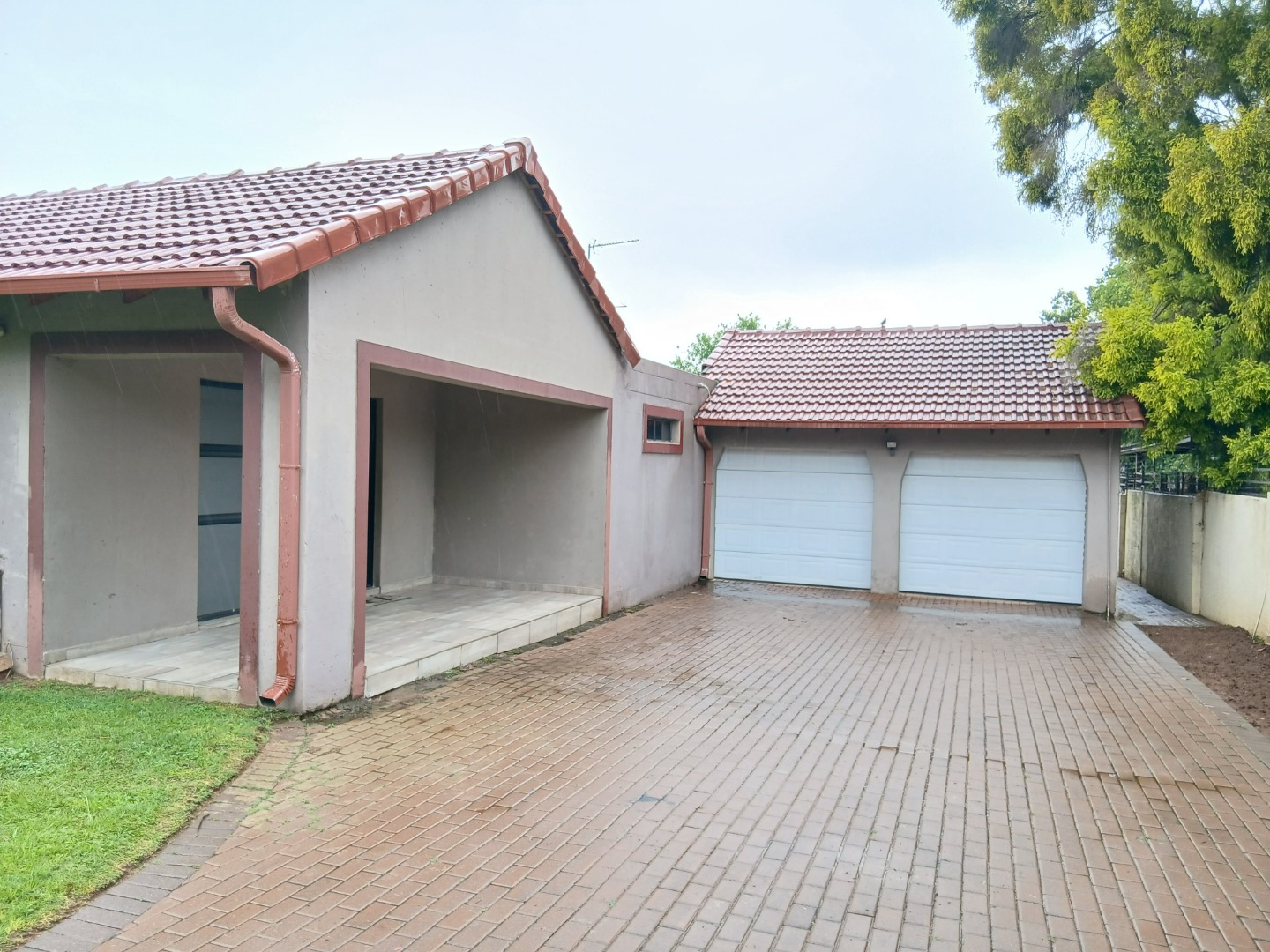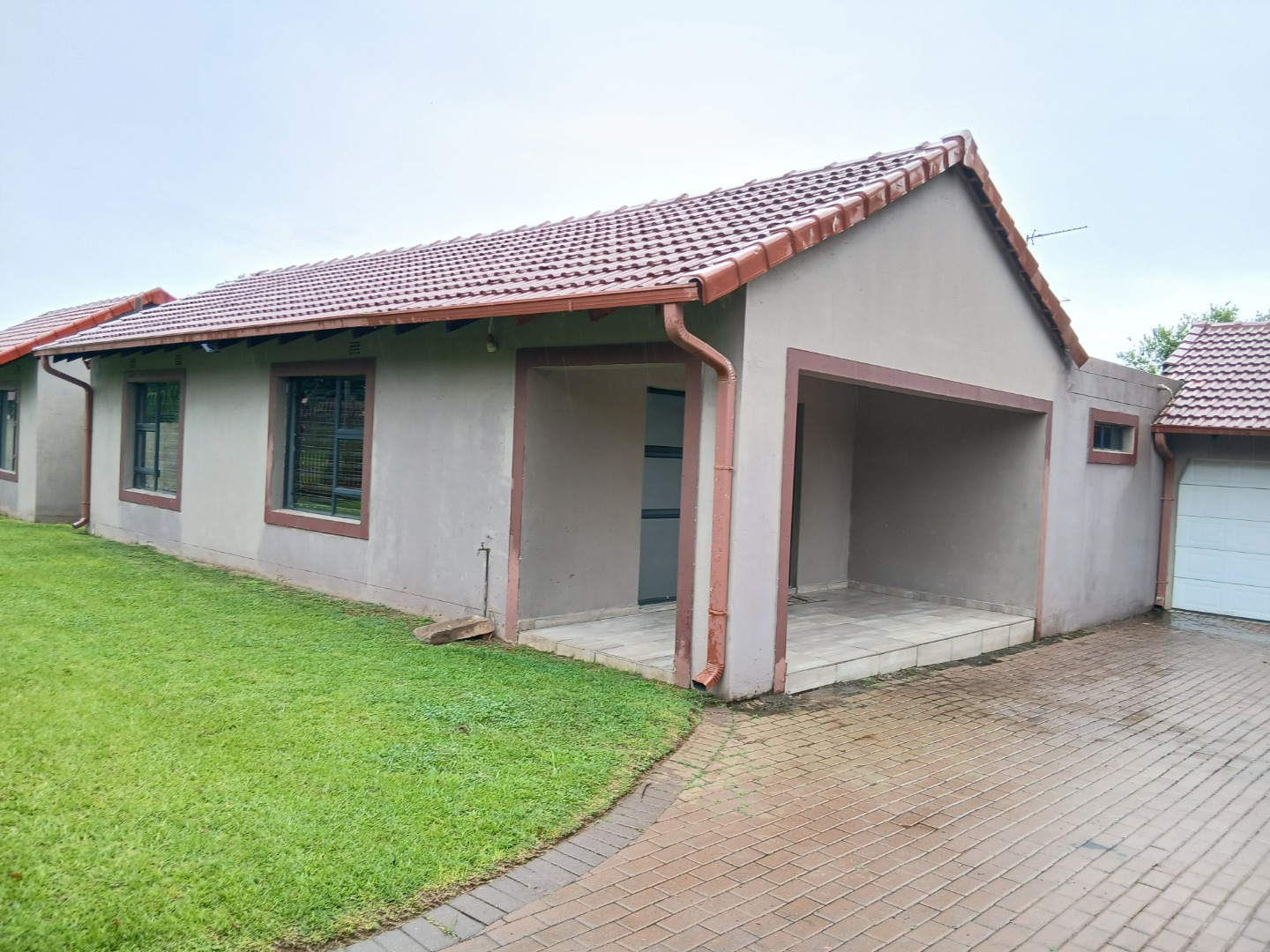This inviting residential property in Sunward Park, Boksburg, offers a comfortable, modern living experience. The exterior features a substantial paved brick driveway leading to a spacious double garage, complemented by an additional covered outdoor area. Well-maintained green lawns frame the home, which boasts freshly painted, textured exterior walls and a durable tiled roof, ensuring appealing kerb appeal.