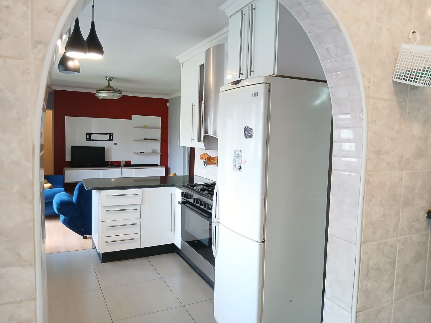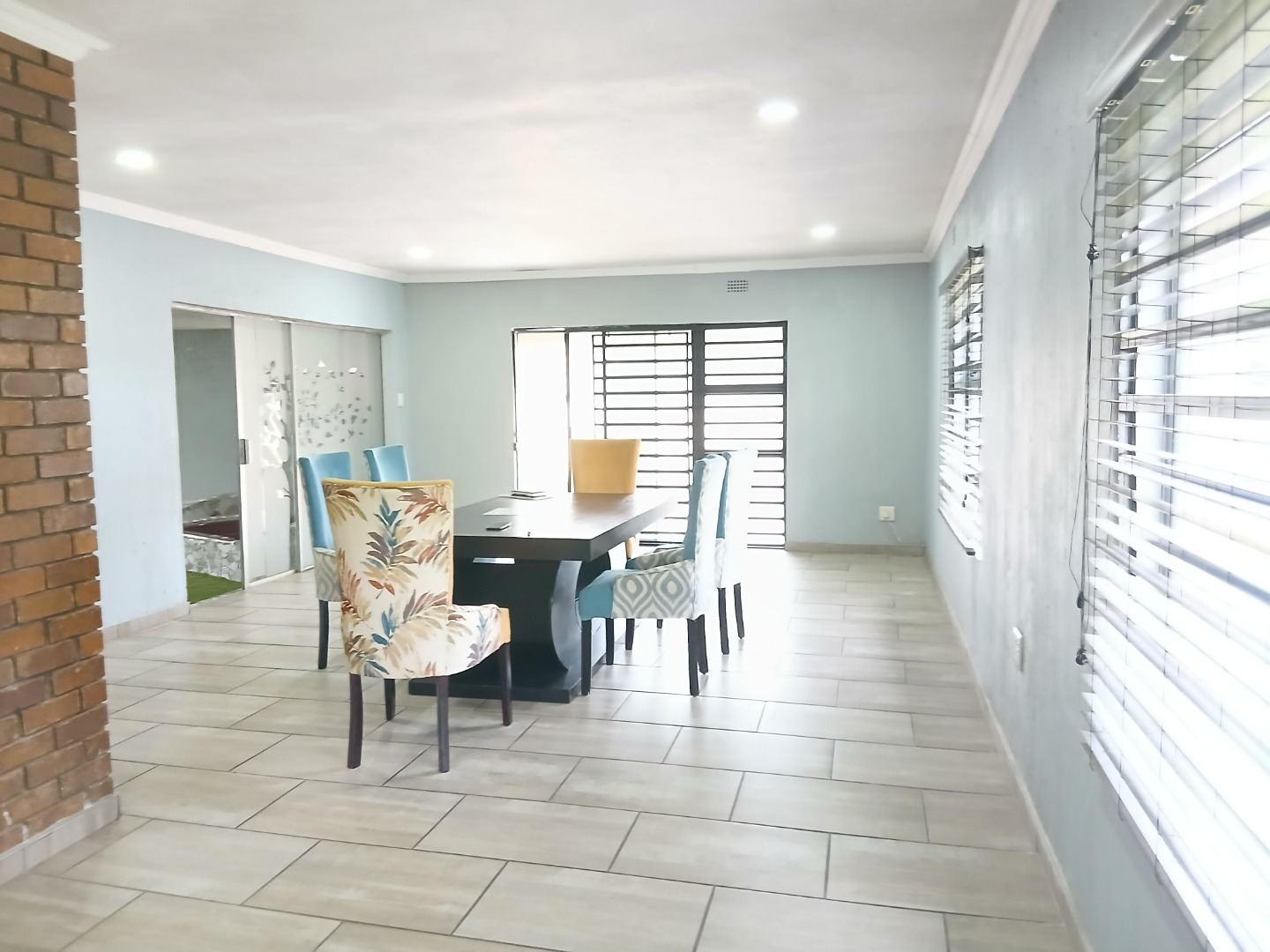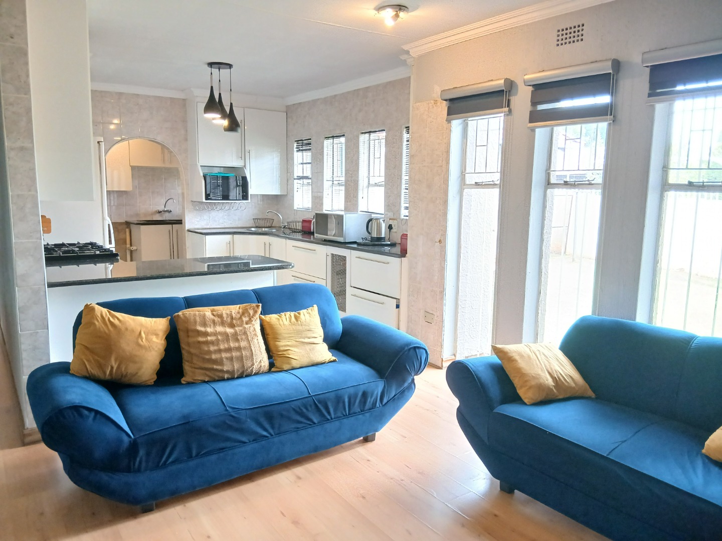 This inviting residential property in Sunward Park, Boksburg, offers a comfortable, modern living experience. The exterior features a substantial paved brick driveway leading to a spacious double garage, complemented by an additional covered outdoor area. Well-maintained green lawns frame the home, which boasts freshly painted, textured exterior walls and a durable tiled roof, ensuring appealing kerb appeal.