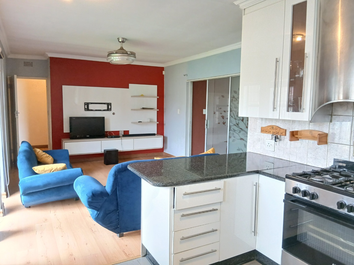 Inside, discover an intelligently designed open-plan layout, seamlessly connecting living spaces. The modern kitchen is a highlight, boasting sleek white cabinetry, dark granite-style countertops, an integrated gas hob, and a convenient pantry. The home offers two lounges, a dedicated dining room, and a family TV room, providing ample space for relaxation and entertainment. Natural light floods the interiors through large windows, illuminating the light wood laminate and tiled flooring.
