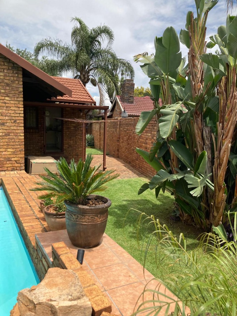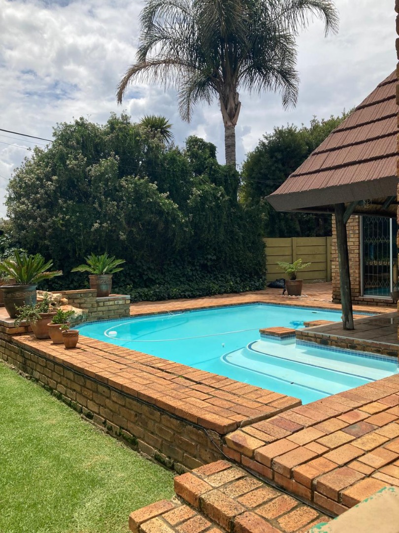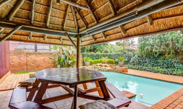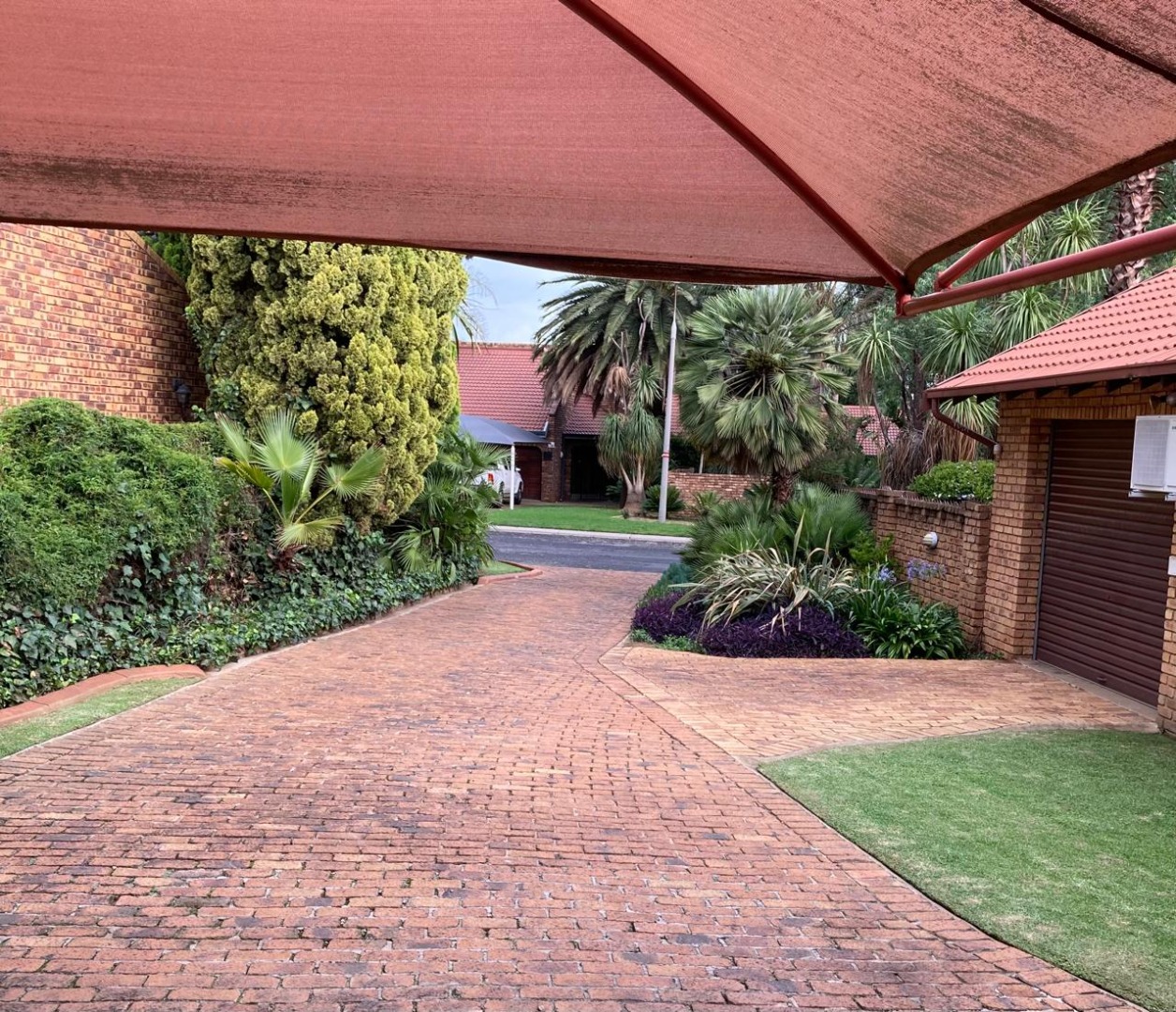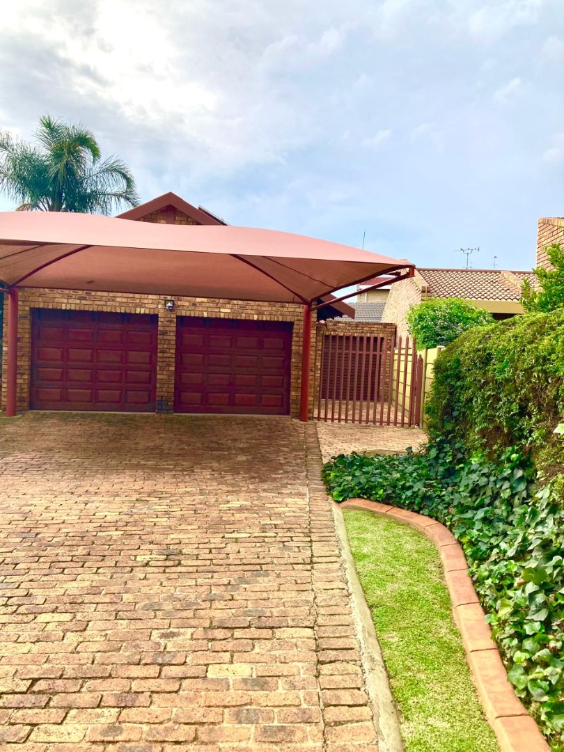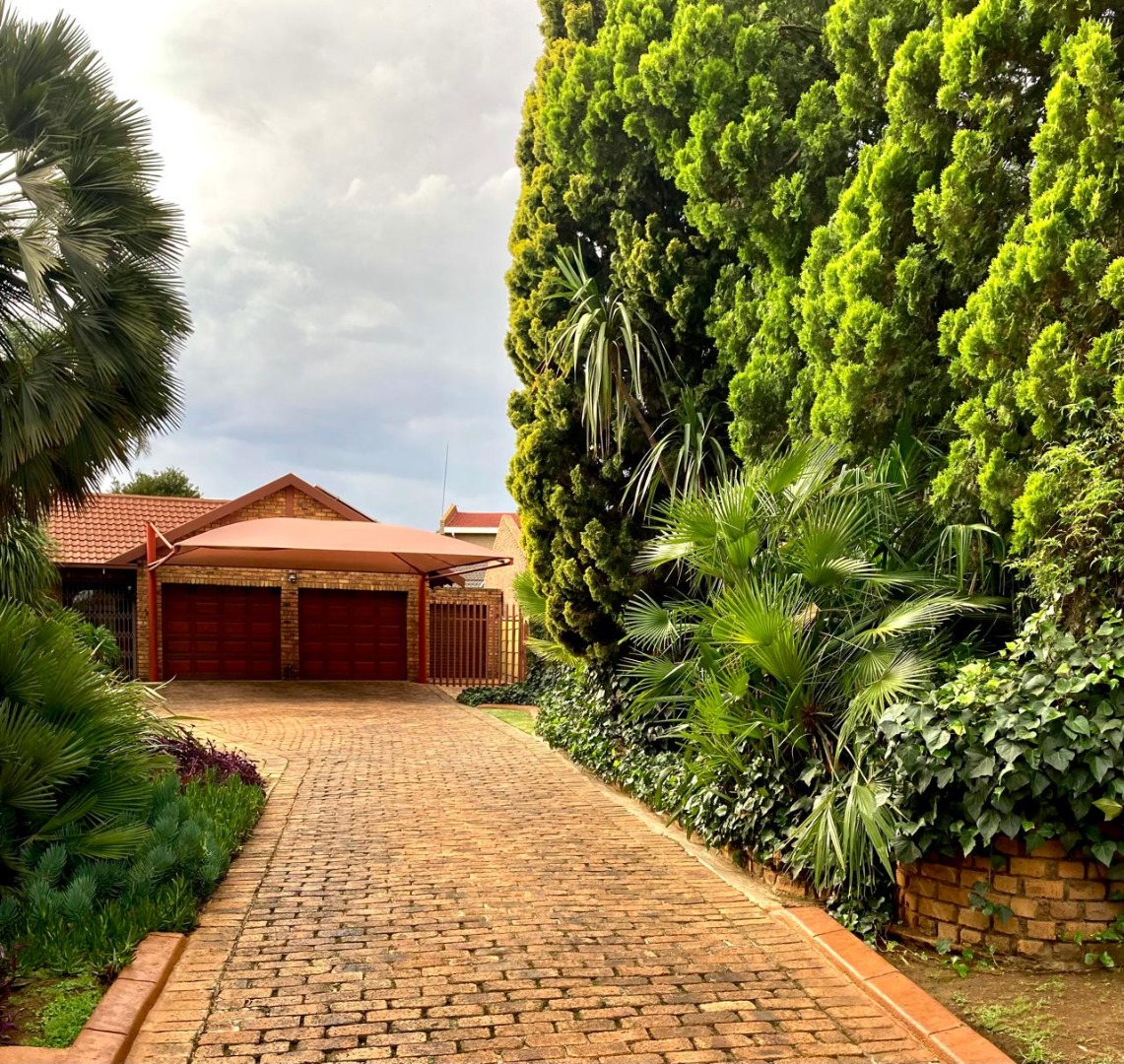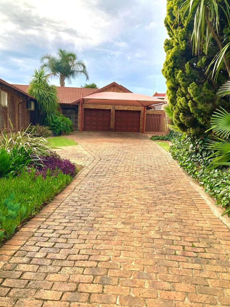 Step outside to a private oasis featuring a sparkling swimming pool with paved surrounds, perfect for enjoying the South African climate. An inviting lapa provides a dedicated covered entertainment area, ideal for hosting gatherings. The property offers exceptional parking with three garages and two additional parking spacesand an extra small garage for extra storage / big enough for a small vehicle. Complemented by extensive brick paving and a lush, mature garden. Security is paramount, with features including a perimeter wall, security gates, window bars, and the benefits of living within a security estate with 24-hour security and an access gate. Additional outside toilets add to the convenience.