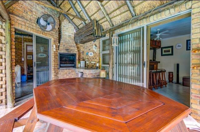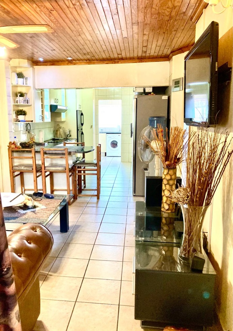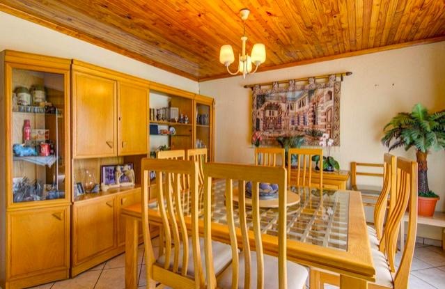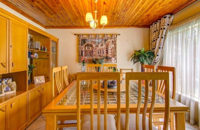 The interior includes a functional kitchen and a convenient laundry area. The dining room is enhanced by a warm wooden plank ceiling and extensive built-in wooden cabinetry, adding character and storage with sliding doors to an enclosed patio/lapa. A dedicated study offers a quiet space for work or hobbies.