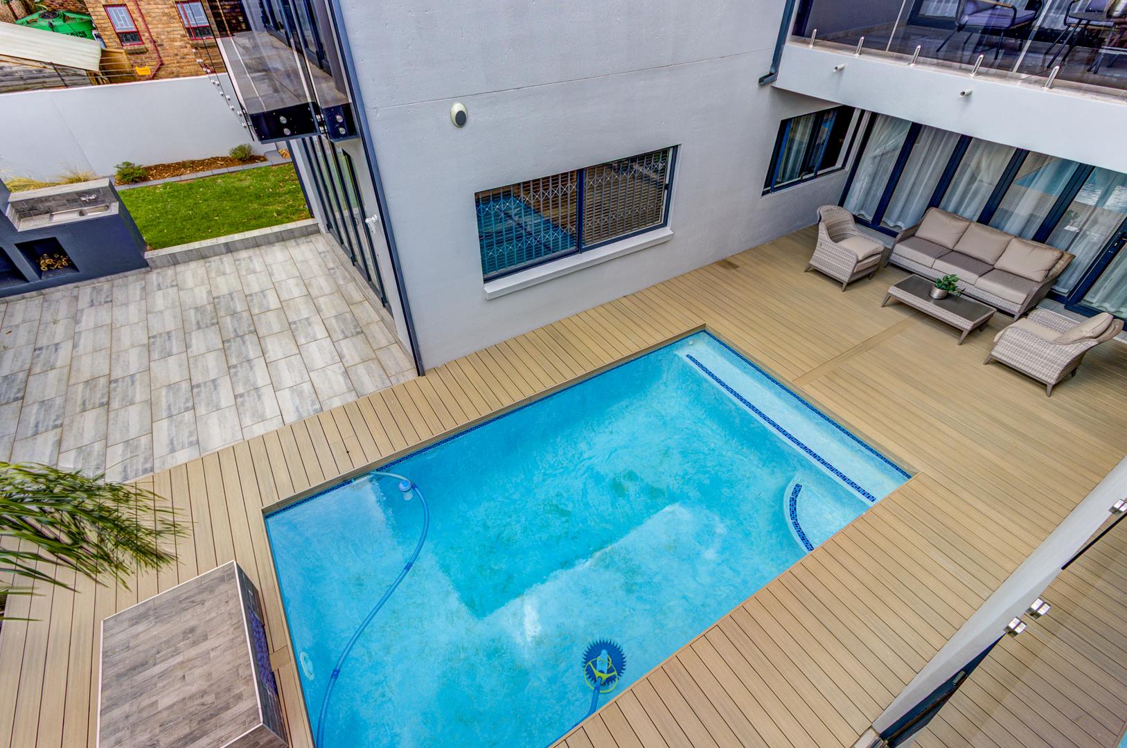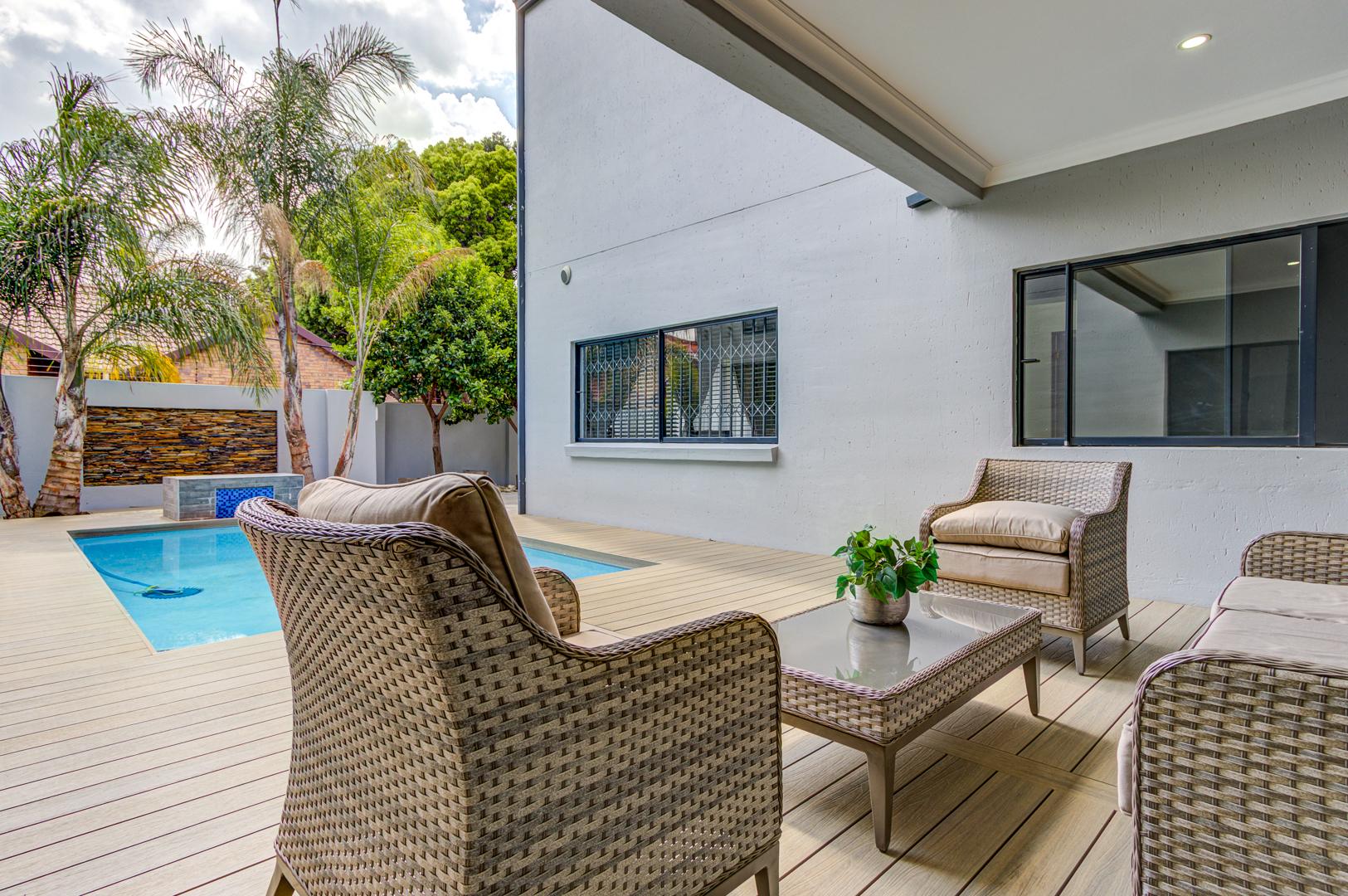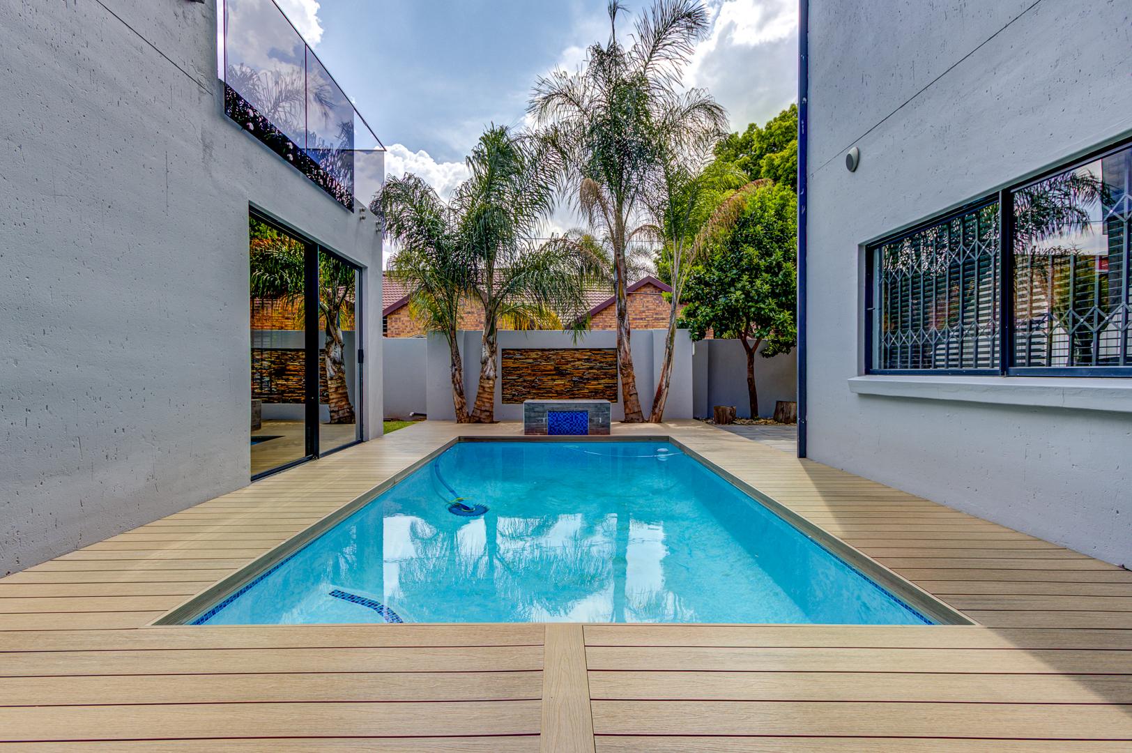 Step outside to a beautiful covered deck, overlooking the perfectly sized swimming pool, and a built-in braai area, all framed by a manicured garden that invites relaxation and outdoor gatherings.