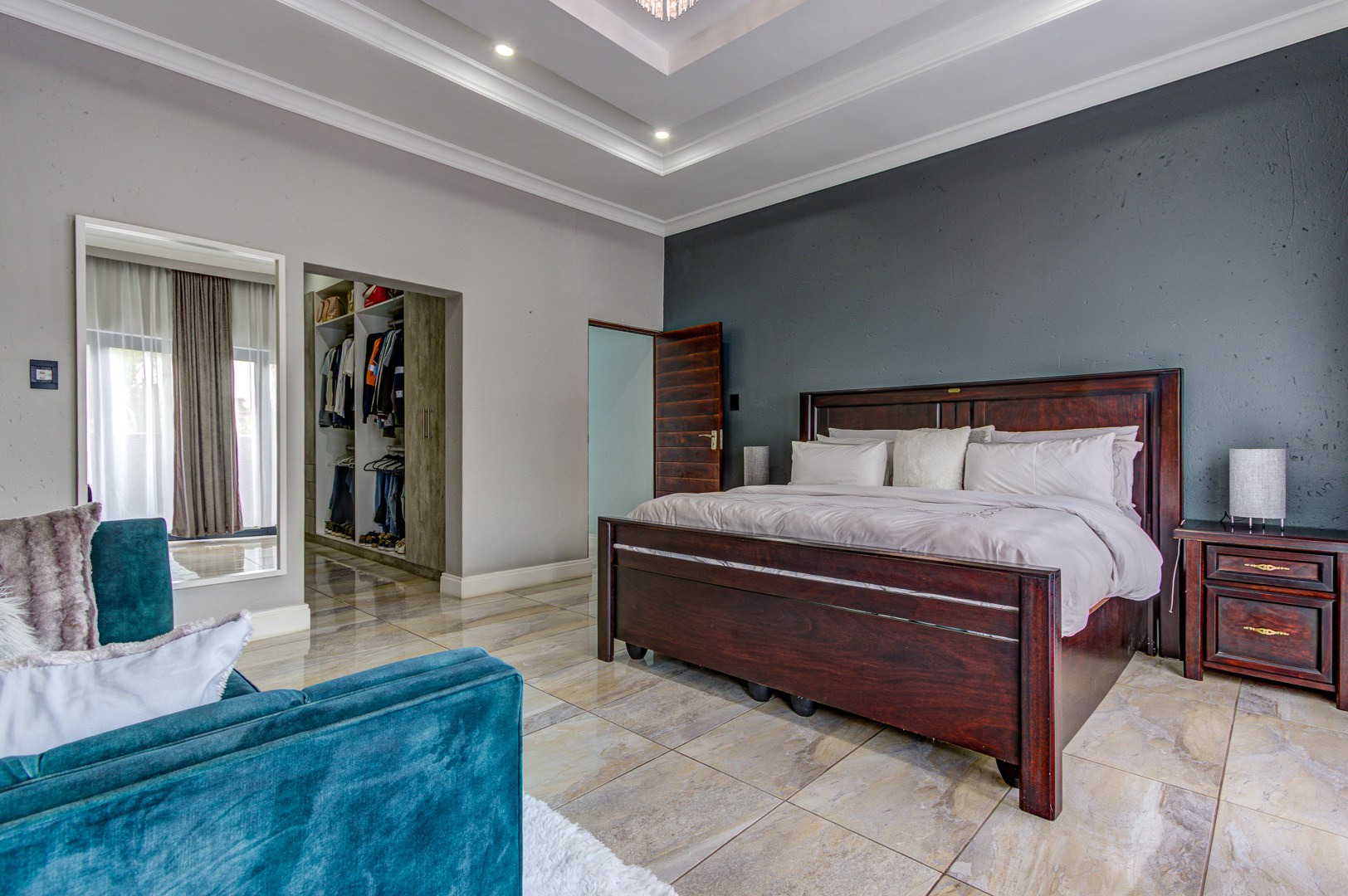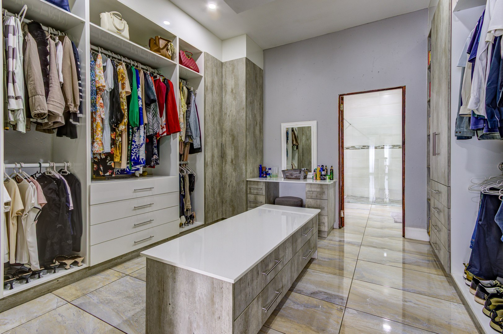 The master suite: a true retreat, offering an incredible walk-in dressing room with abundant built-in cupboards, a luxurious en-suite bathroom complete with a walk-in shower, a relaxing bath, and a private balcony overlooking the swimming pool.
