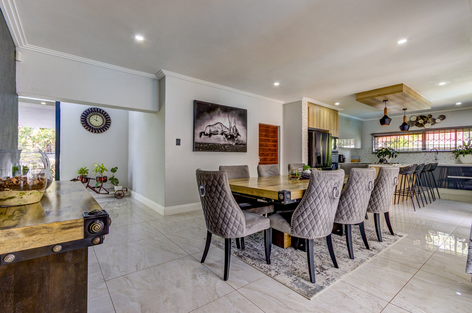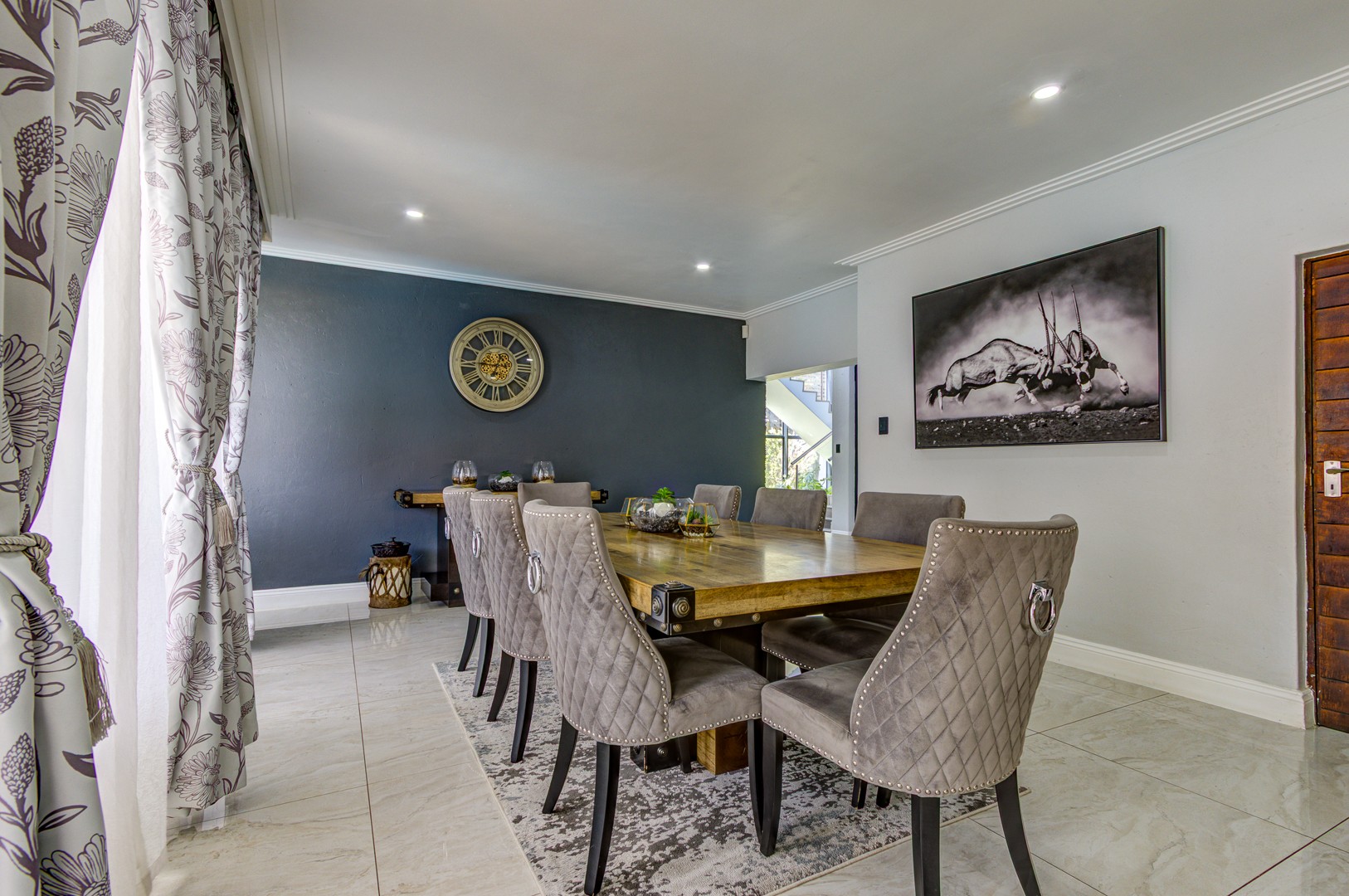 The modern designer kitchen boasts sleek finishes, a gas stove, double eye-level ovens, a stunning central island, and a hidden scullery for convenience. The dining area seamlessly flows from the kitchen and opens through glass doors to the outdoor entertainment area.