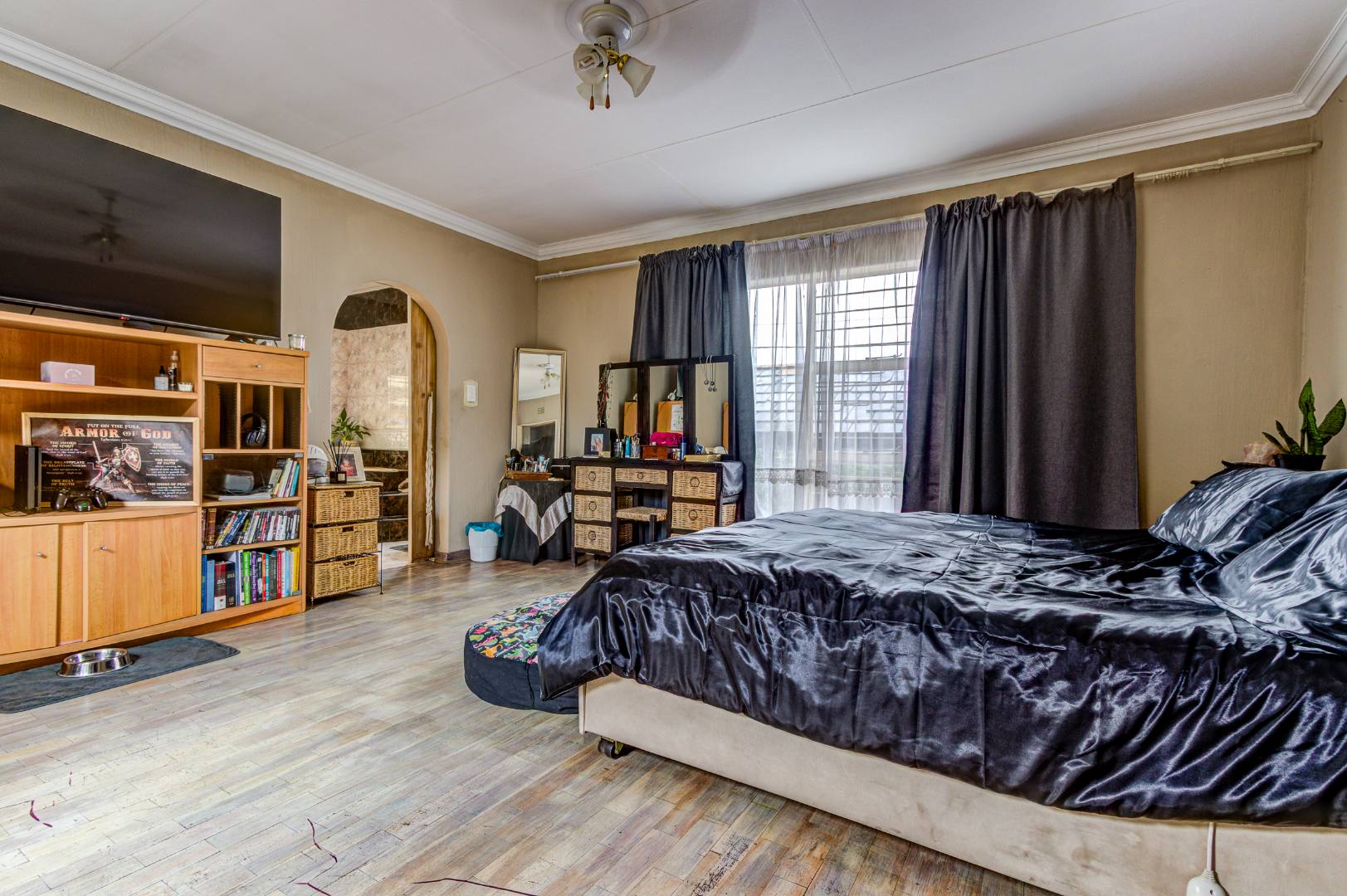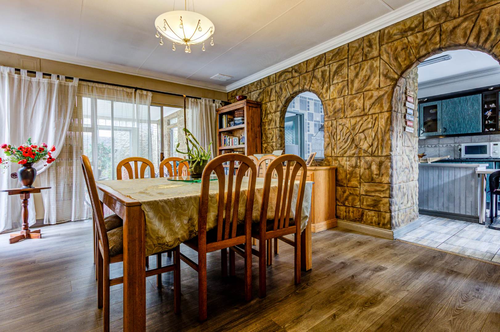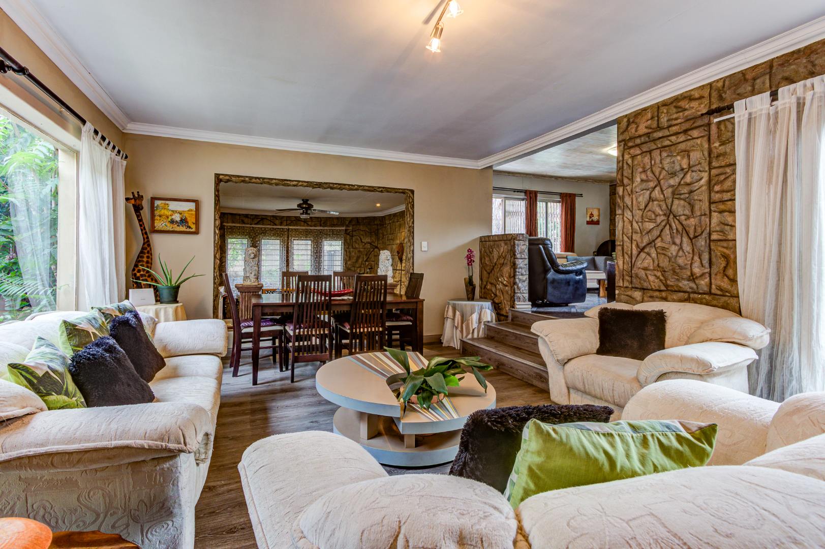 The large Melamine kitchen boasts granite tops, breakfast counter, double eye level oven, pantry, and scullery with 2 plumbing points. The dining room is open plan to the kitchen and flows into the bright sunroom / breakfast room.