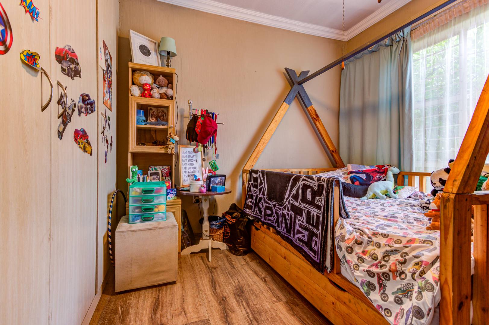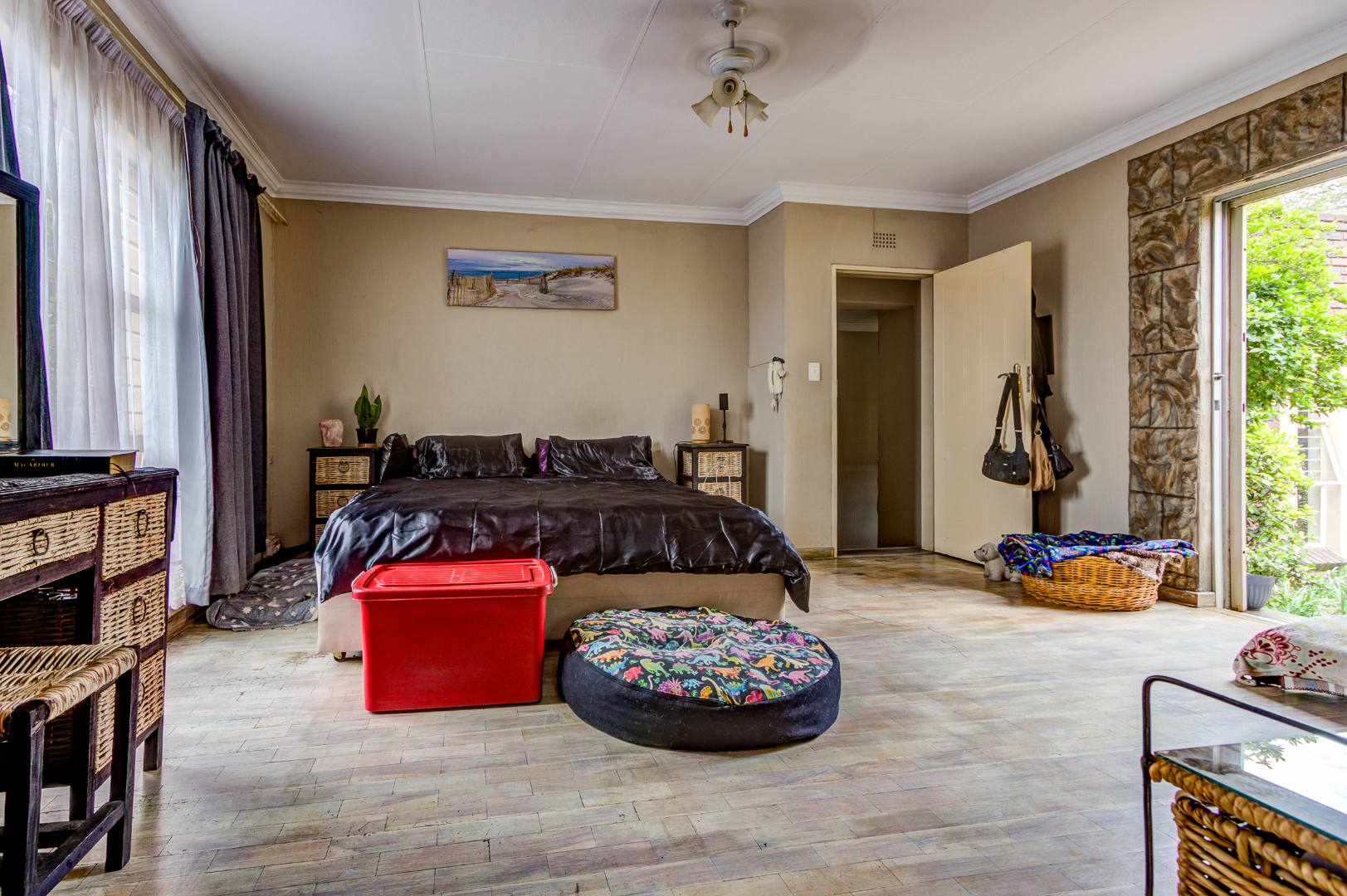 The 4 bedrooms are bright with built-in cupboards. The main bedroom has its own sliding door to a private garden.