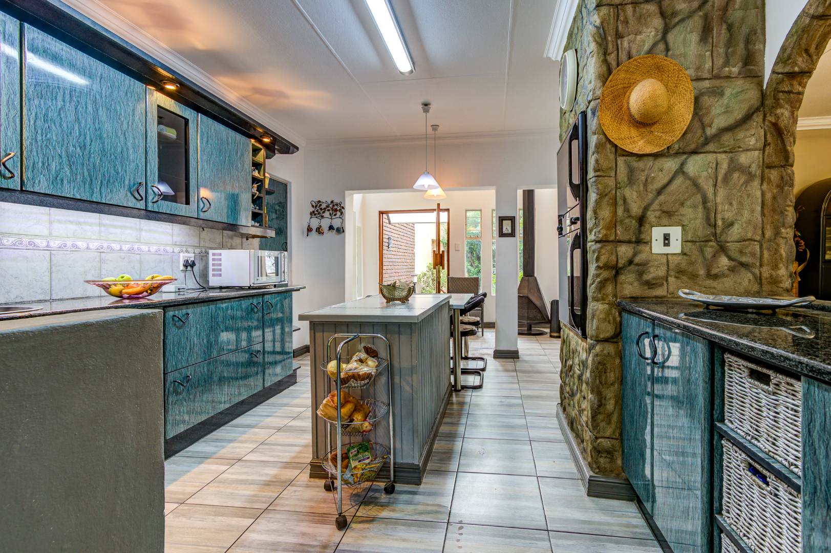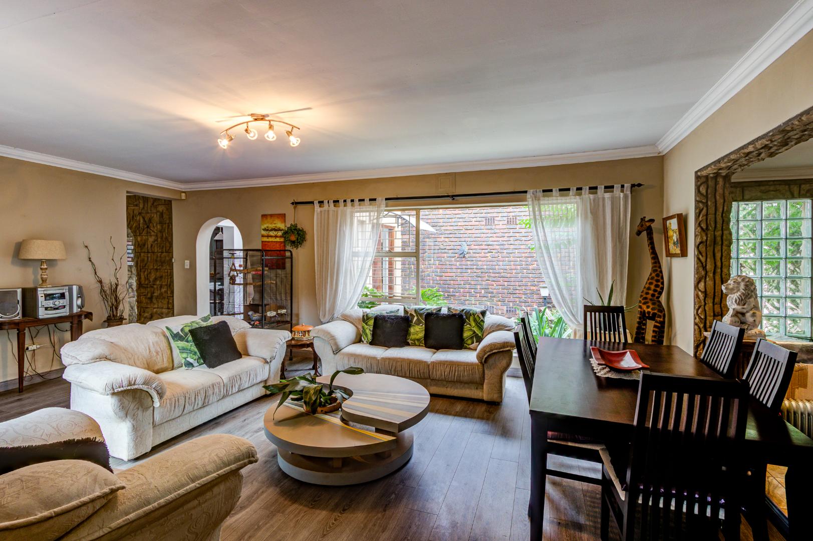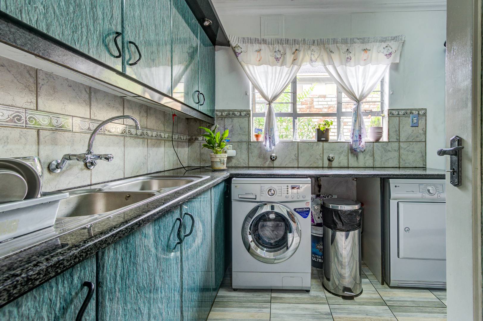 The large Melamine kitchen boasts granite tops, breakfast counter, double eye level oven, pantry, and scullery with 2 plumbing points. The dining room is open plan to the kitchen and flows into the bright sunroom / breakfast room.