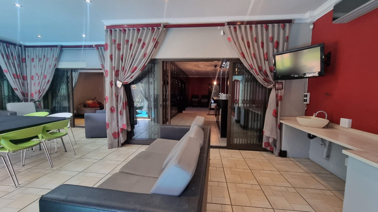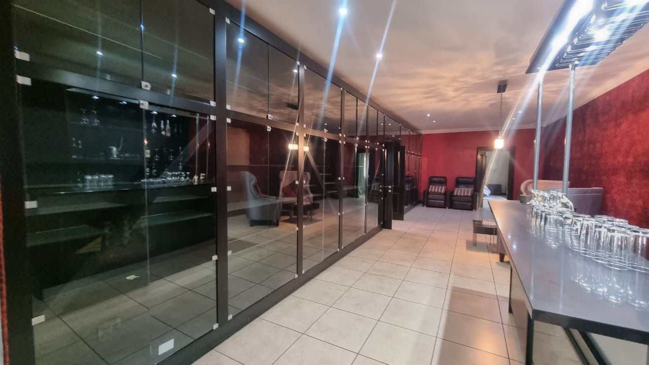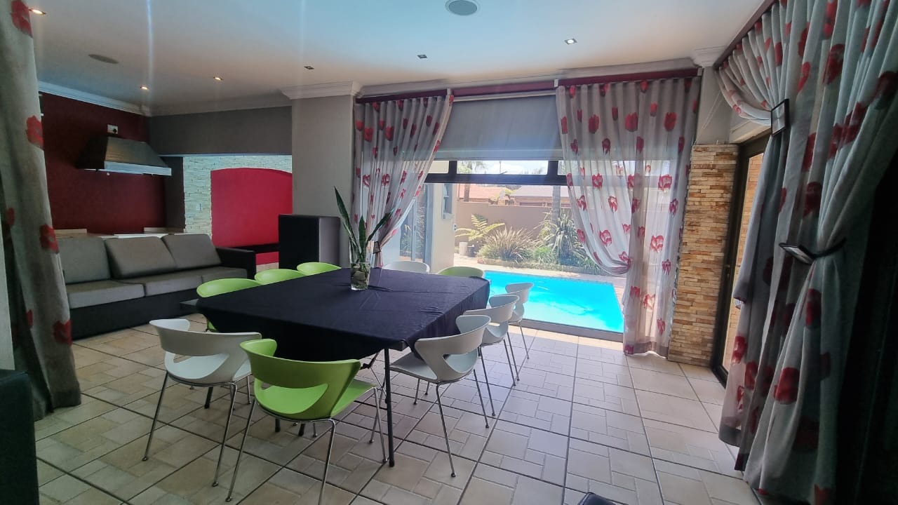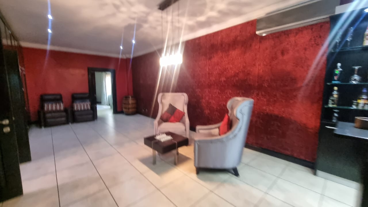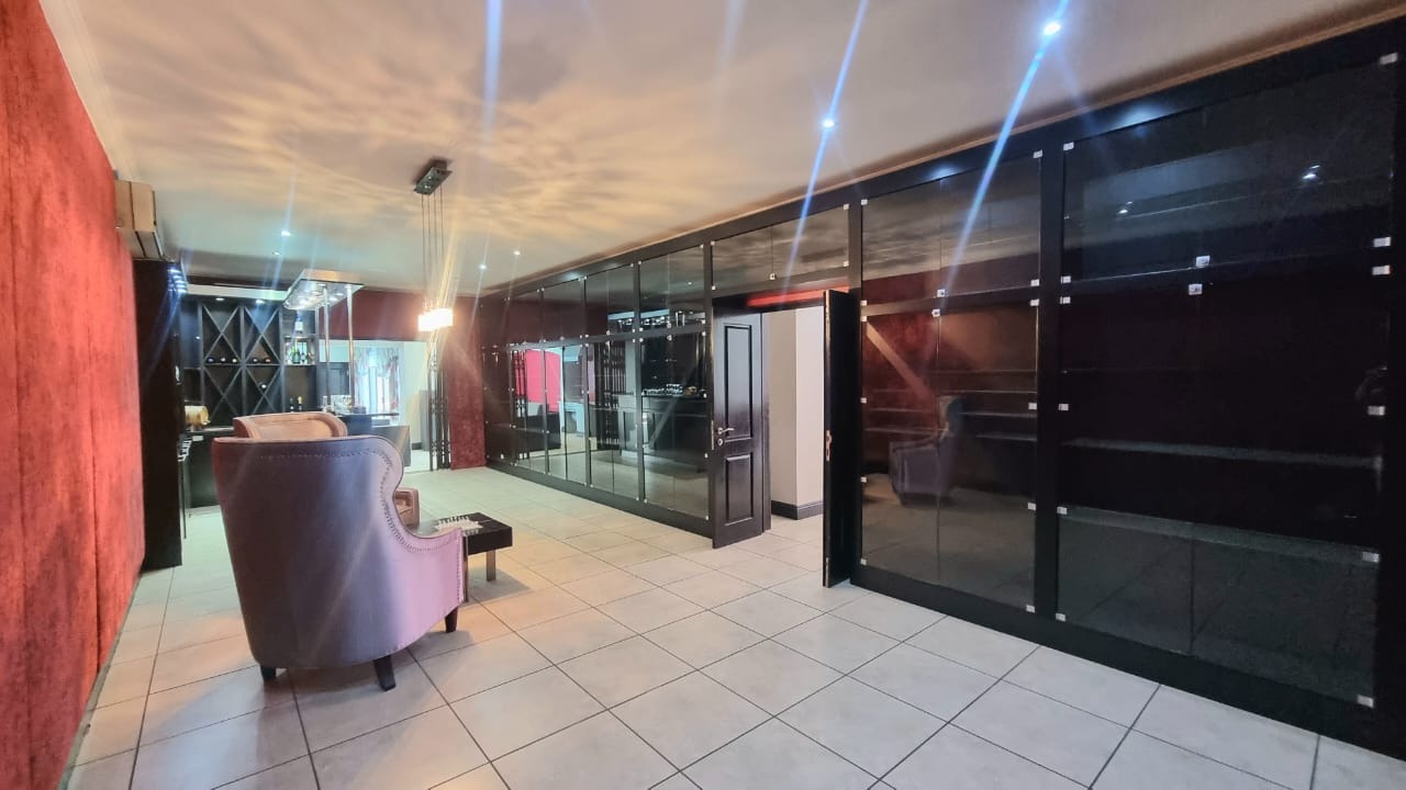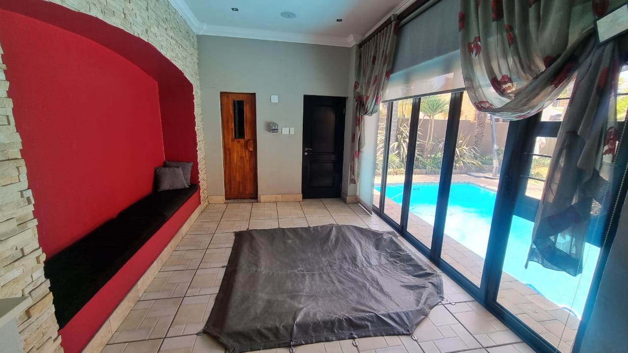 The residence offers six garages and a brand-new solar system that powers the geysers and the entire home, ensuring both luxury and sustainability. For relaxation and entertainment, you'll find a lovely jacuzzi that opens onto the pool, complemented by a sauna and a built-in kitchen area for convenience.