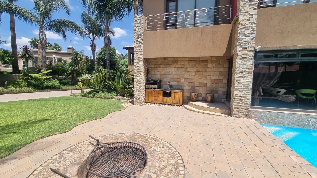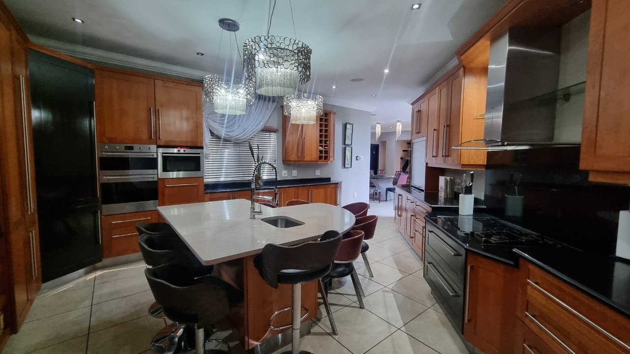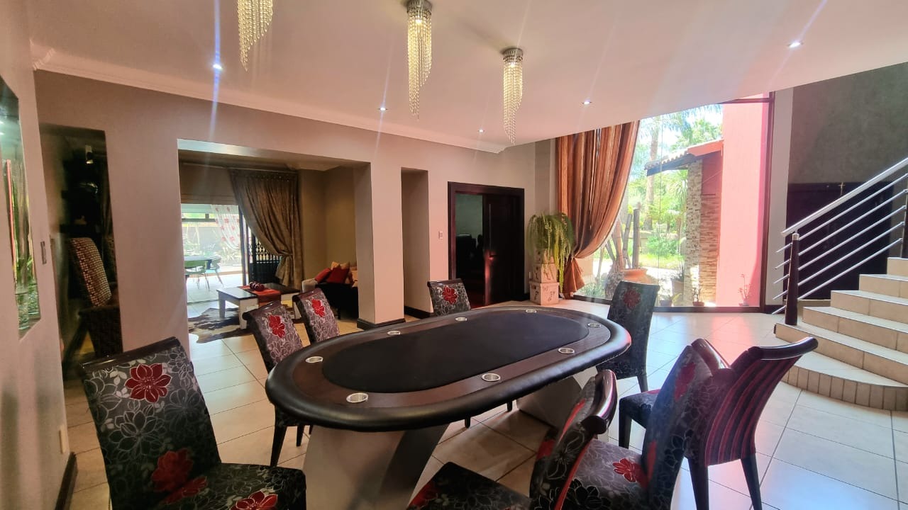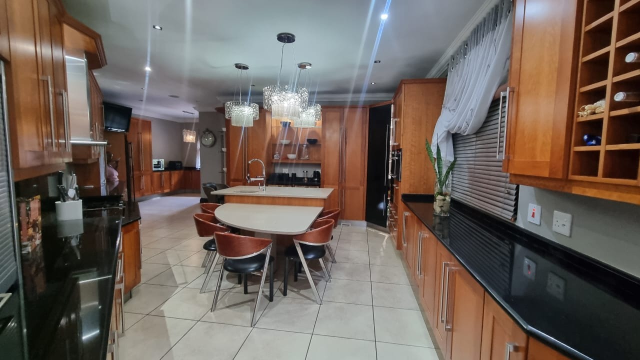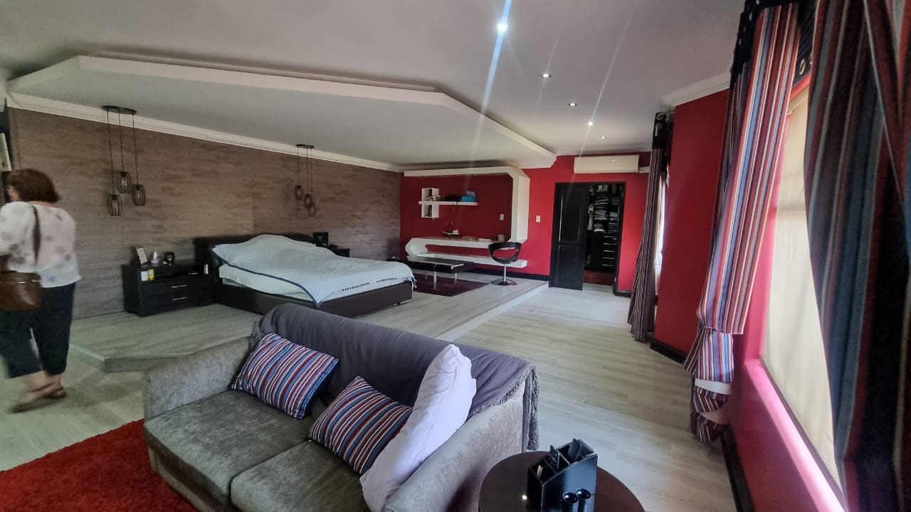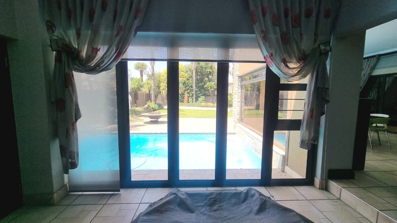 The residence offers six garages and a brand-new solar system that powers the geysers and the entire home, ensuring both luxury and sustainability. For relaxation and entertainment, you'll find a lovely jacuzzi that opens onto the pool, complemented by a sauna and a built-in kitchen area for convenience.